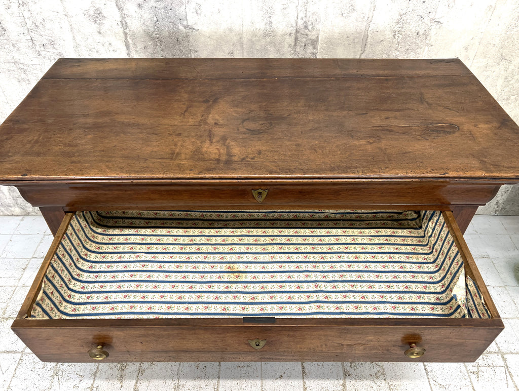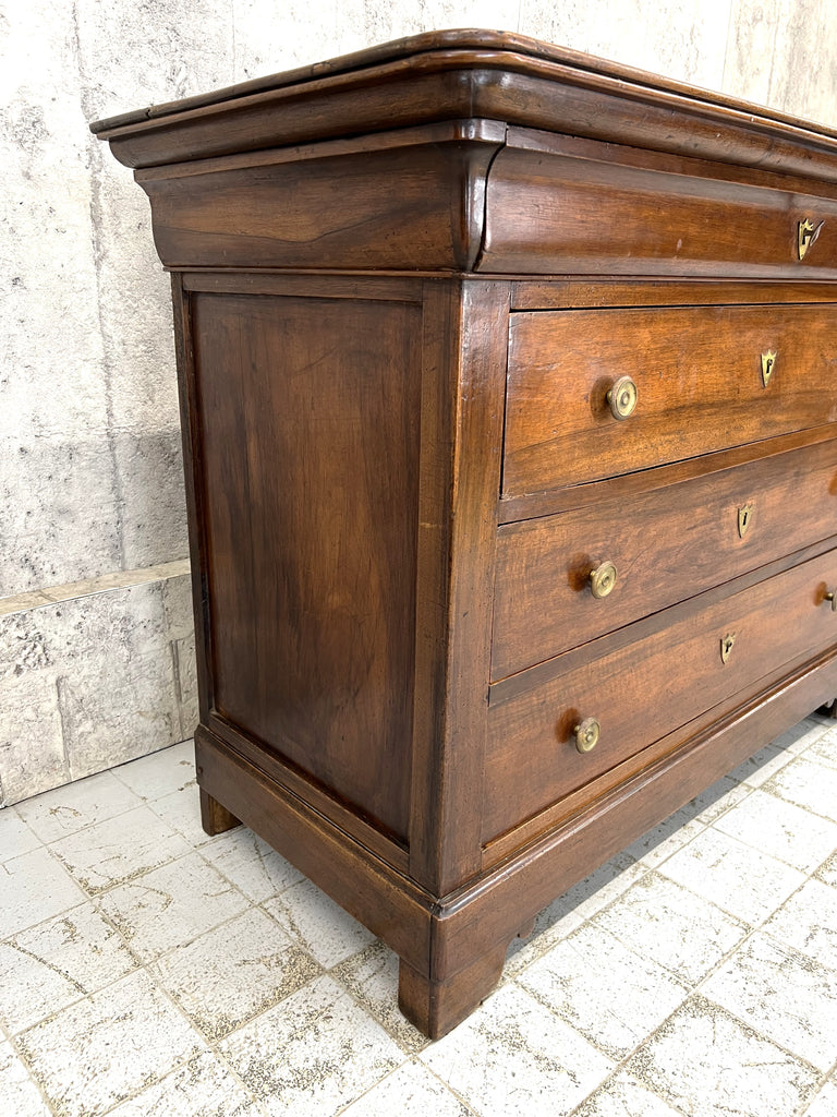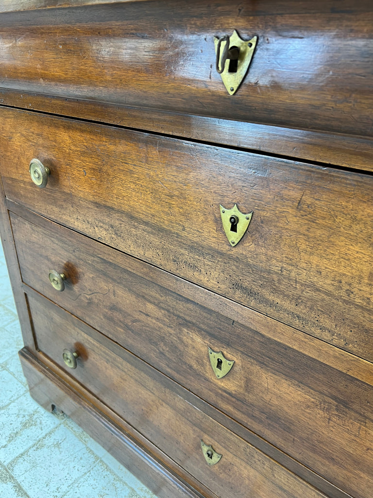 A fabulous looking Napoleon III chest of drawers with three main drawers and one 'hidden' drawer and the original drawer furniture and key.  You will spot the top has a crack down the back section, where two planks have been coupled.  The crack has a historic fix inside which is holding it firm, so there is no noticeable movement and it can still hold weight on the top.  In this deep walnut wood, the drawers run well according to age and use.