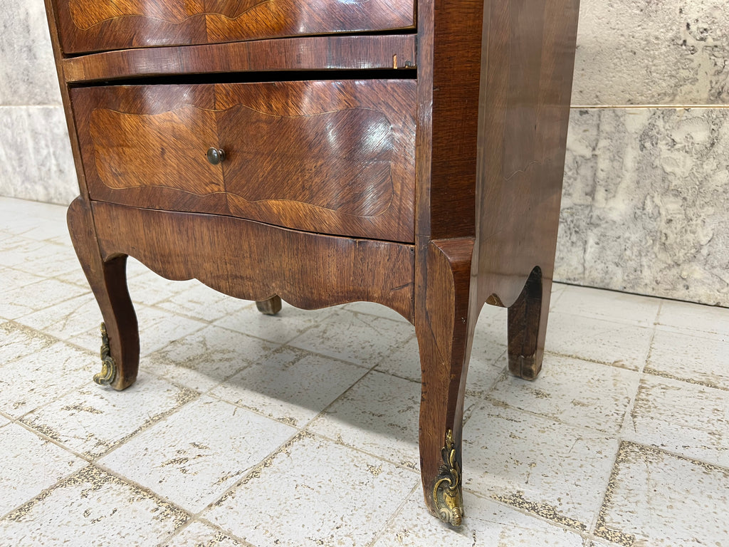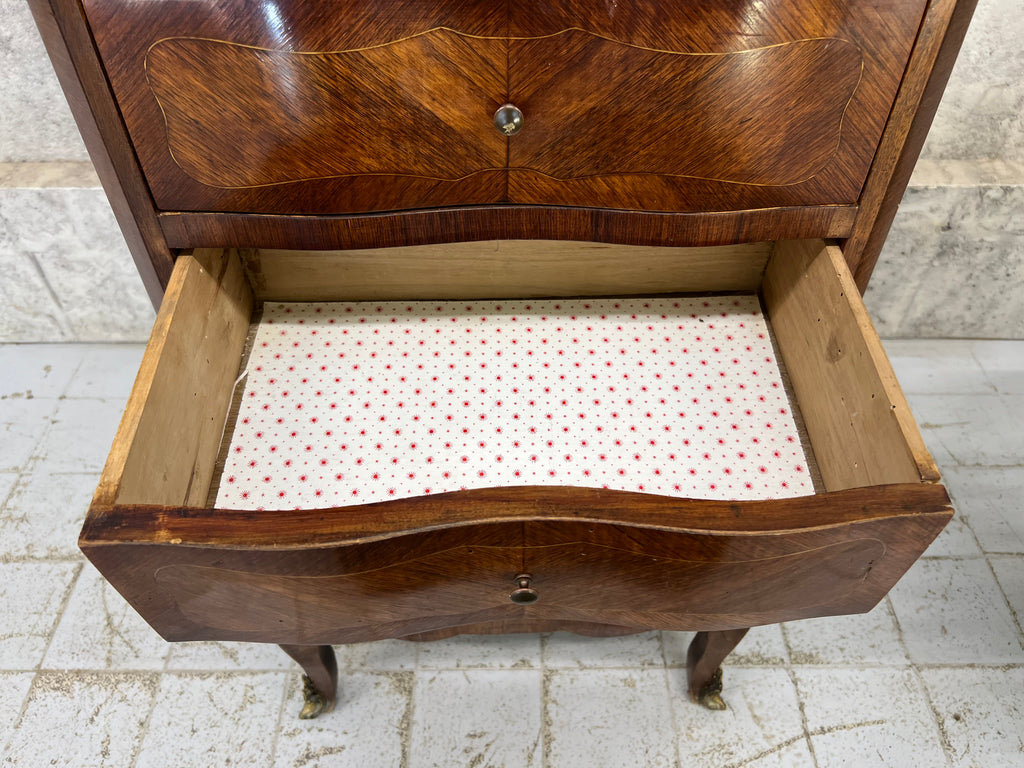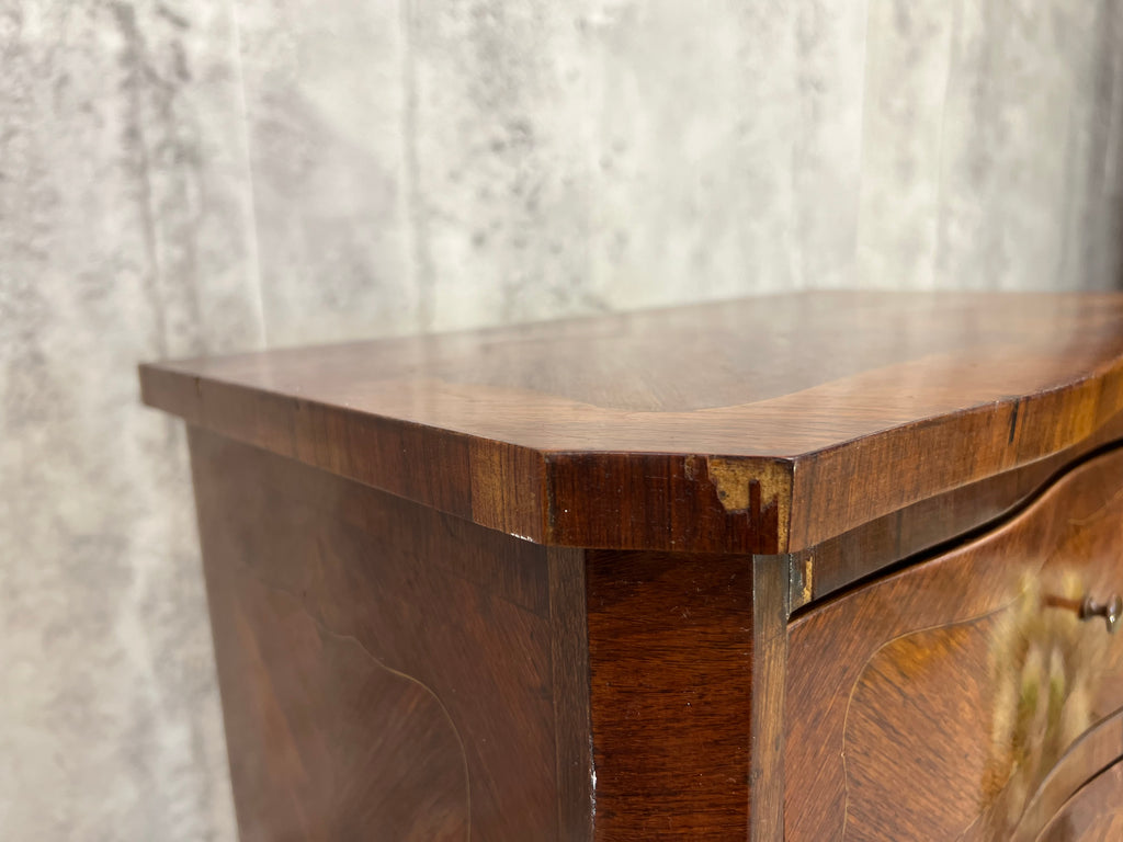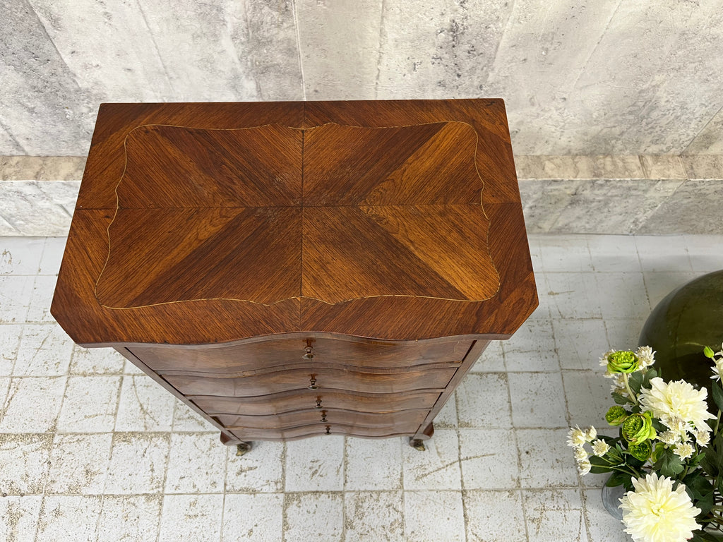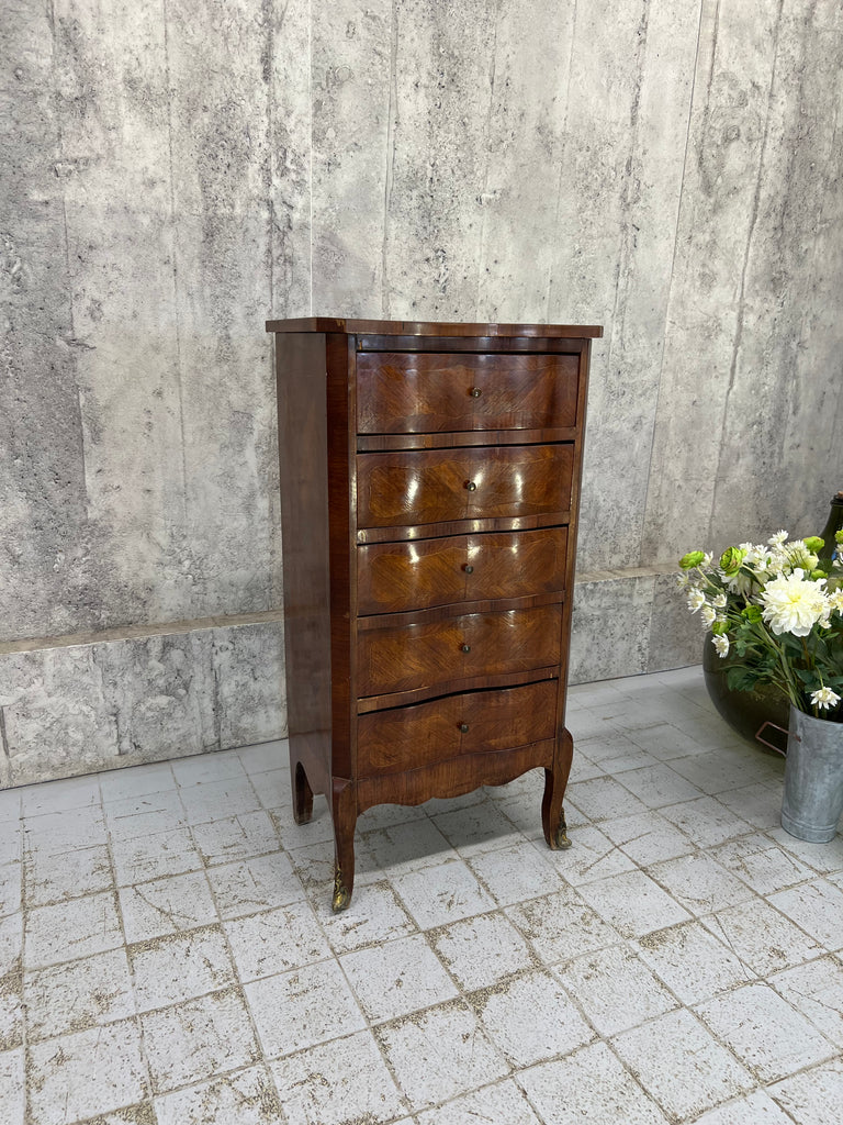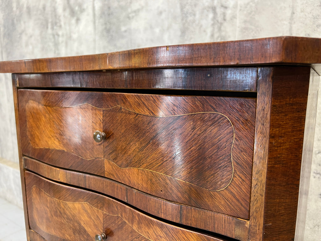 Such a stunning chest of drawers, with its snake like front and beautiful veneered detailing on the front of the piece. As you can see from the photographs there are areas where the veneer has been lost over time and old wood worm holes too, which have long been vacated.. we have given this chest of drawers a thorough treatment to give peace of mind too. This is a brilliant choice for a narrow space that requires a storage option. Ready to use as it is. Characterful and unique.