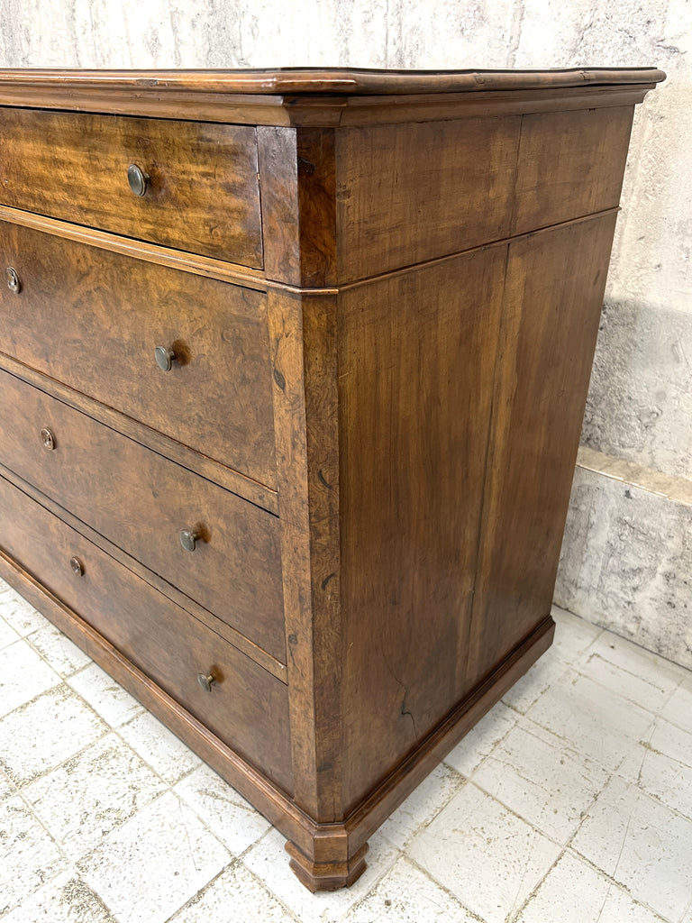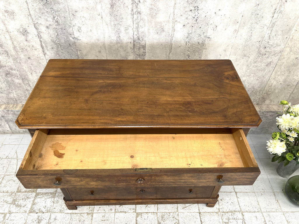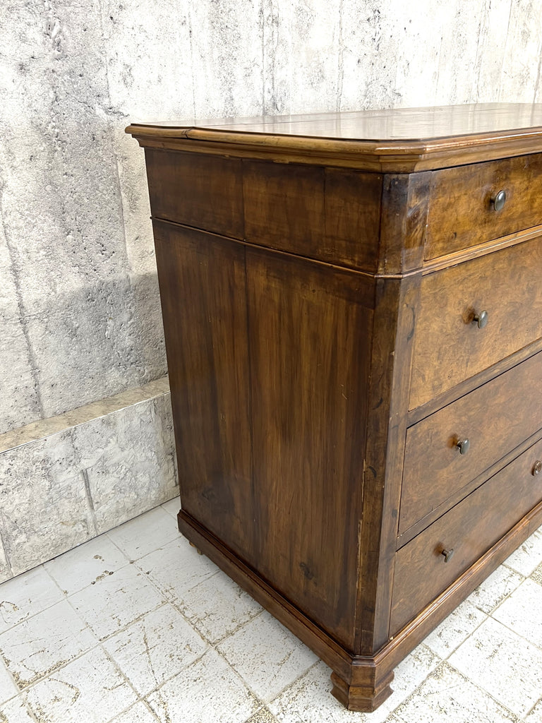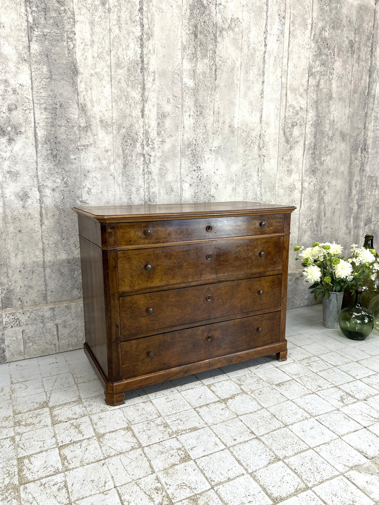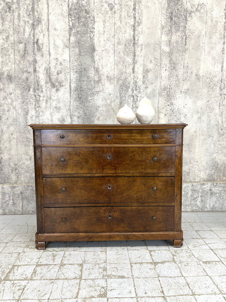 Such a beautiful chest of drawers. The face is veneered with this stunning grain and beautiful wooden drawer handles. The key as long ago parted company with this piece. The veneer has chips as you would expect with the age and use of this piece. Each drawer runs well. Simple, elegant and full of style. A striking piece and a wonderful find.