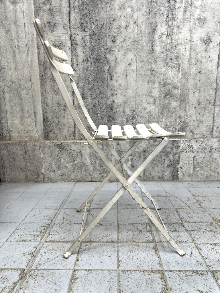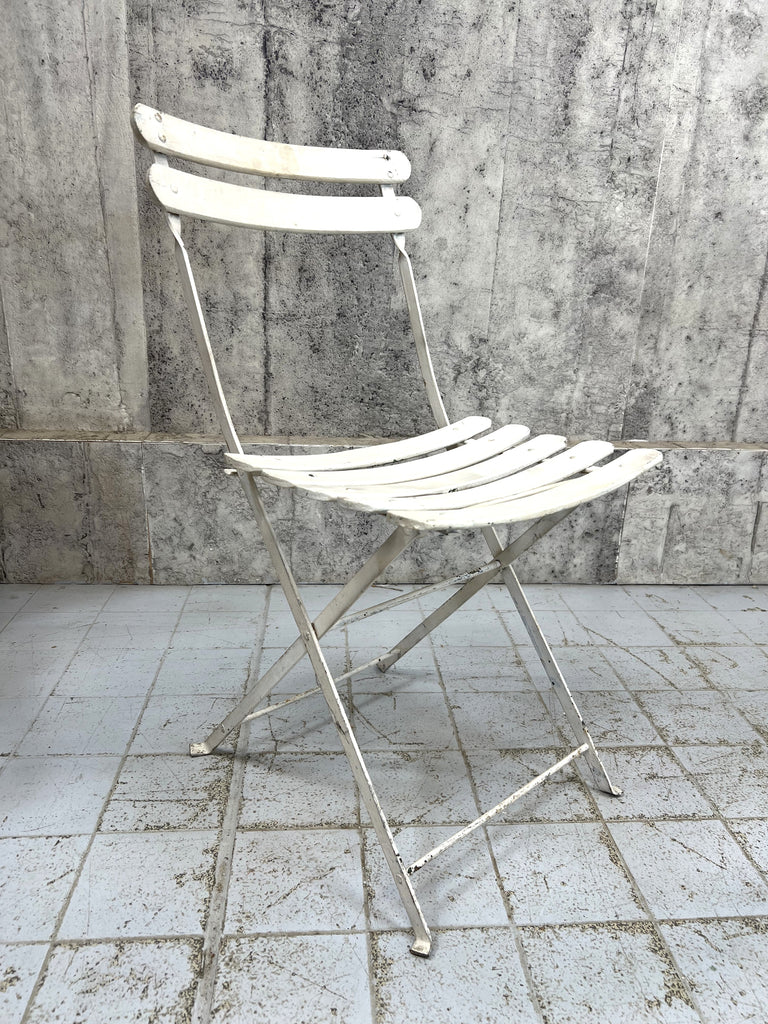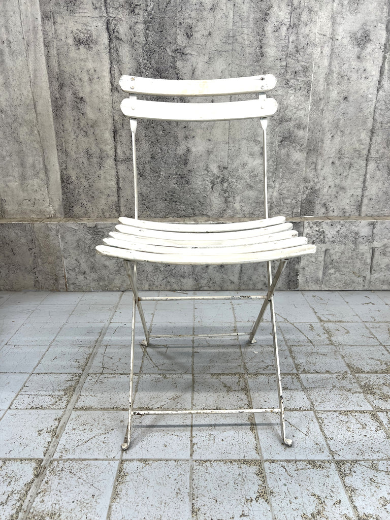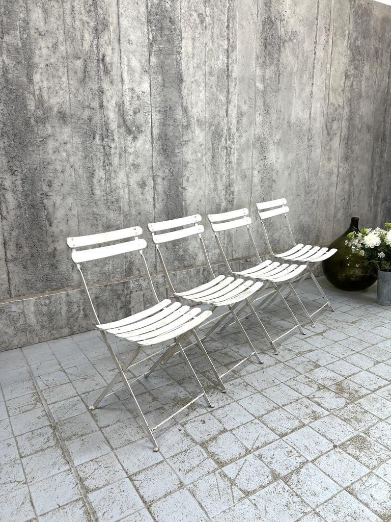 A fabulous set of 4 folding garden bistro chairs, perfect for al fresco dining. In good condition, a little wobbly as you would expect of the age and use of these chairs. Fold flat to store.