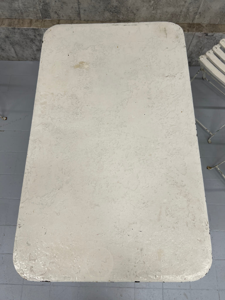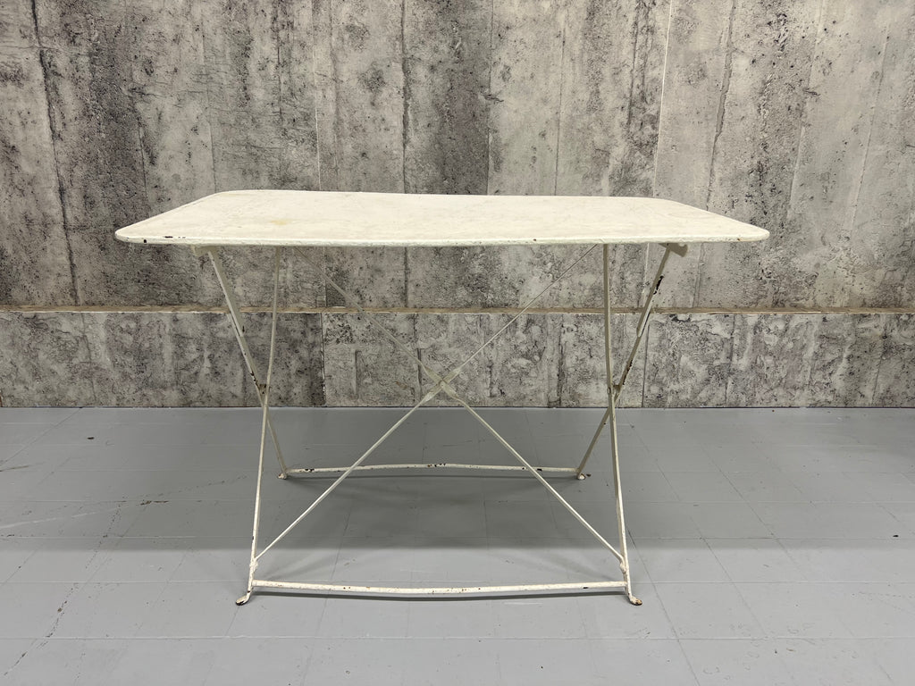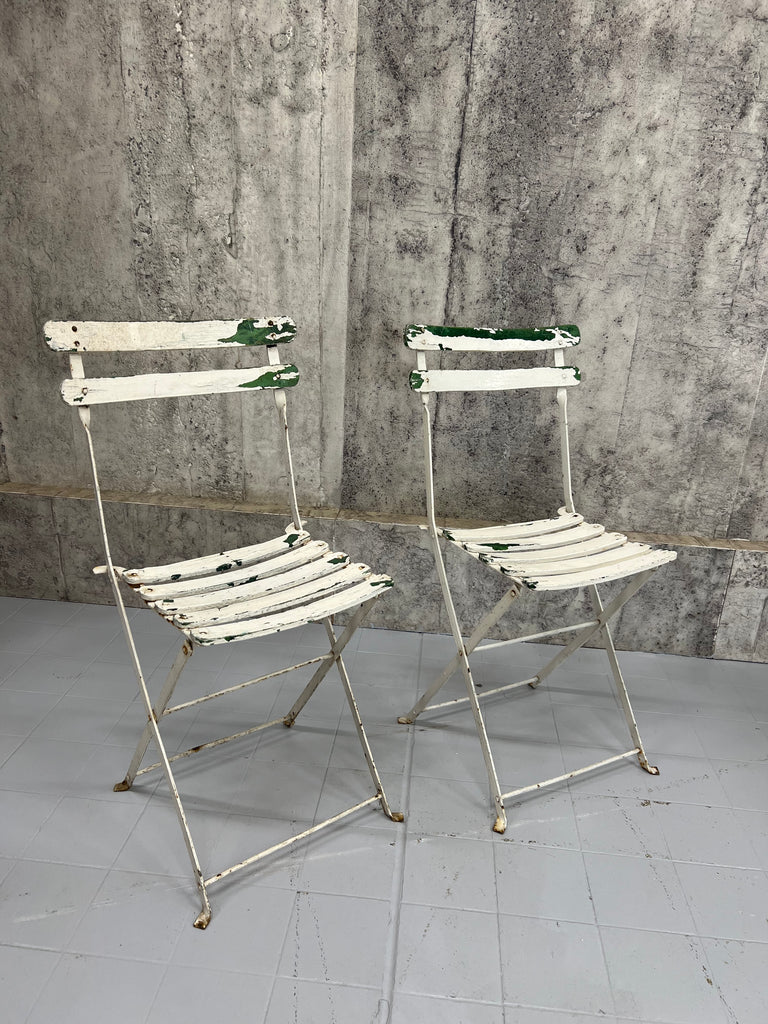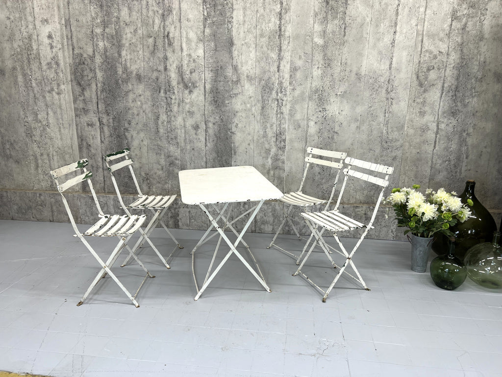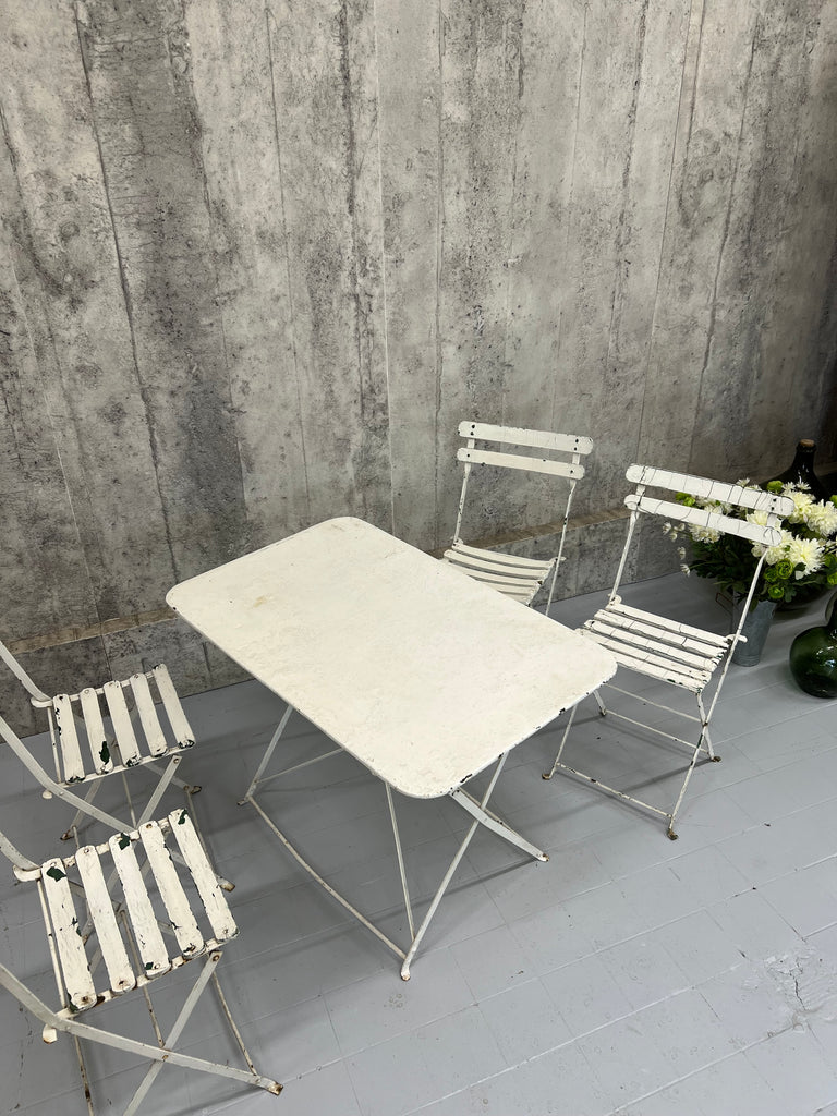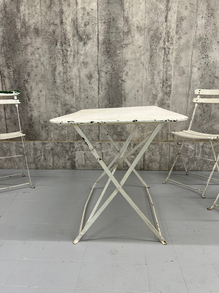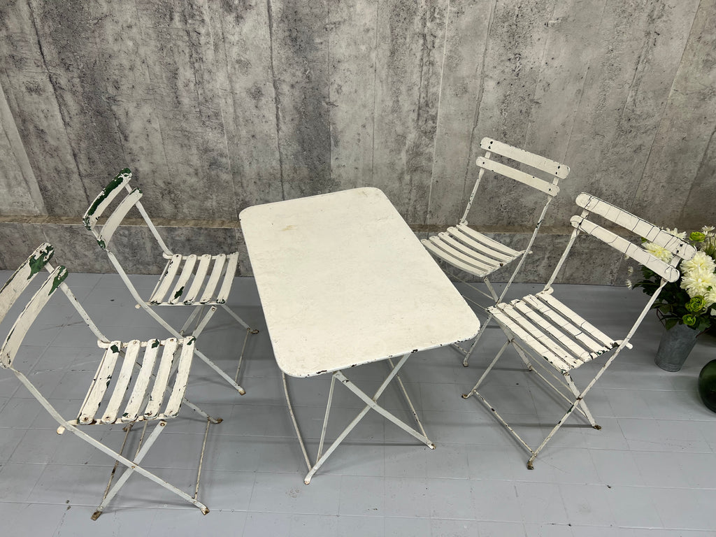 A fabulous, unique and characterful set of garden furniture. A set created from a complimentary set of metal and wooden folding bistro chairs and a metal folding table, all of which have historical layers of paint, in some areas visible, in most areas not. In good condition and ready to use. There have been layers of paint to the chairs and the table top is marked and warped as you can see from the photos, but all in good ready to use working condition. Perfect for use on a terrace, balcony or in a garden. Please don't buy this if you want perfect. This is for those that appreciate character over perfection.