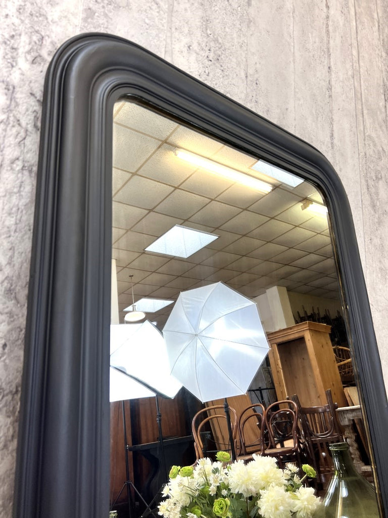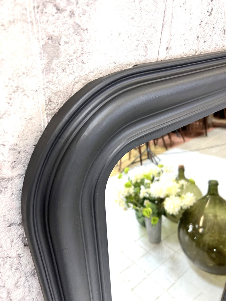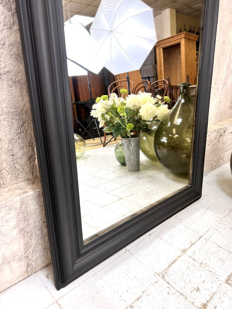 This is a stunning, simple mirror.. a little foxing as you would expect of its age. The frame has been painted this black finish. This is a classic French mirror which could be a lean to mirror in a bedroom or an overmantel mirror. Ready to use as it is.