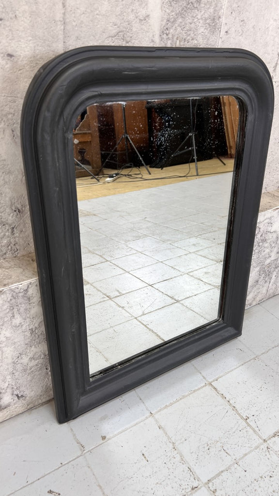 My hands down favorite place for these small Louis Philippe mirrors is in a modern bathroom.. also perfect for a hallway, dressing table, a very versatile mirror.. This example has had a lot of damage to the frame that have been patched up over the years.. but to us, the black paint finish disguises the worst of the damage and the overall look of the mirror is wonderful. The mirror itself is original with foxing as you would expect.