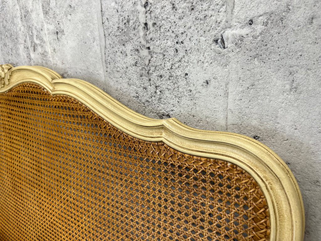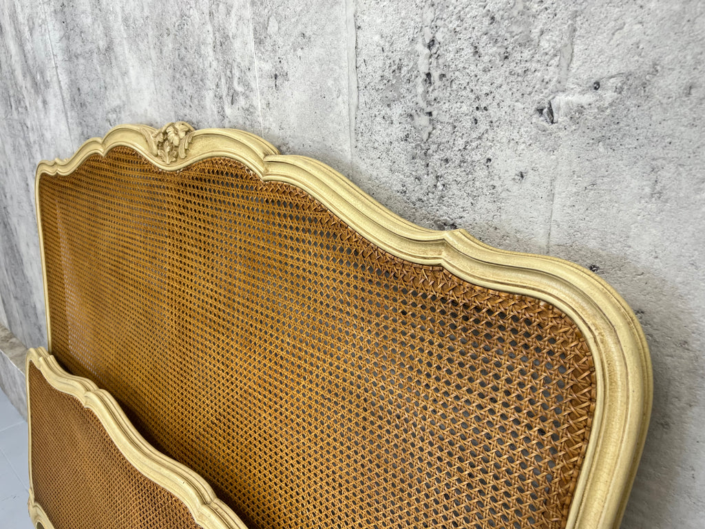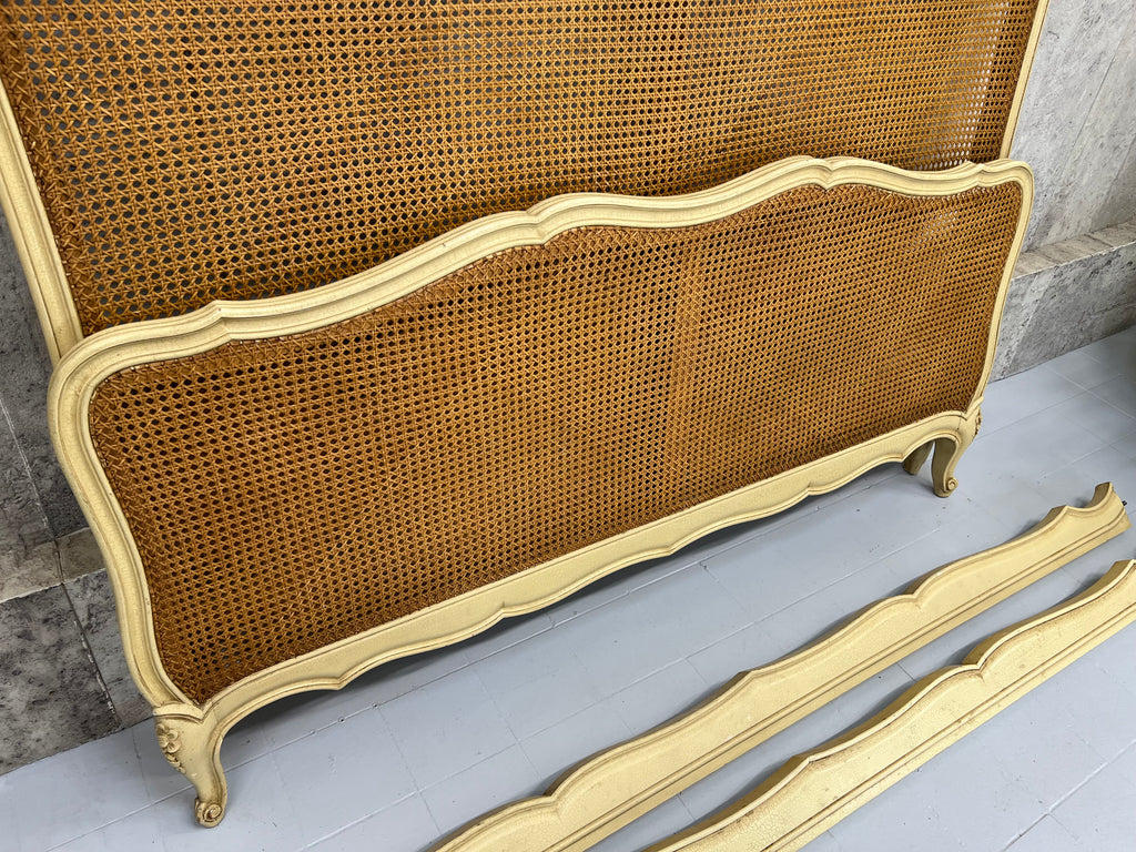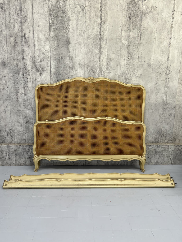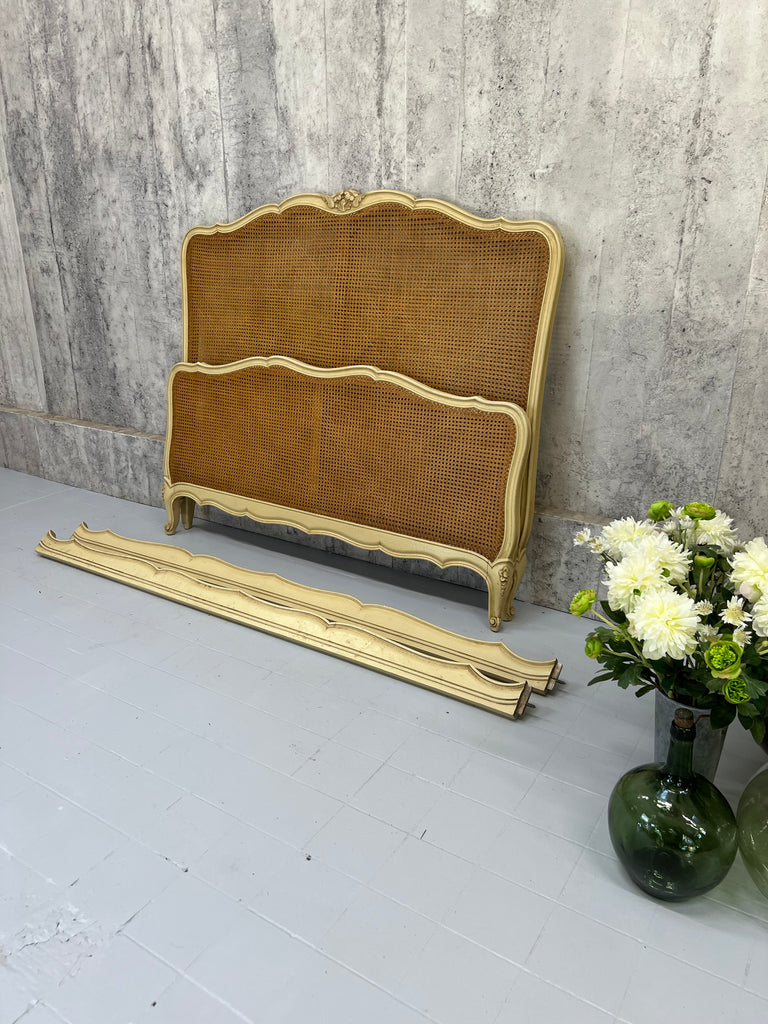 A lovely example of a traditional painted 'shabby chic' French cane bed frame.  The paint is original and the cane work is in excellent condition..   The head board is single thickness and the foot board has a double layer of cane.  The frame can be fixed onto a modern bed base or clever clients have fixed flat pack bed bases to the frame which also works brilliantly.  Increasingly difficult to source.  All original and ready to use.