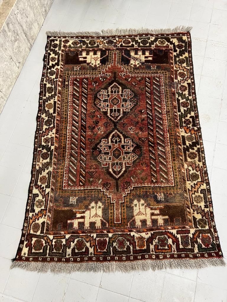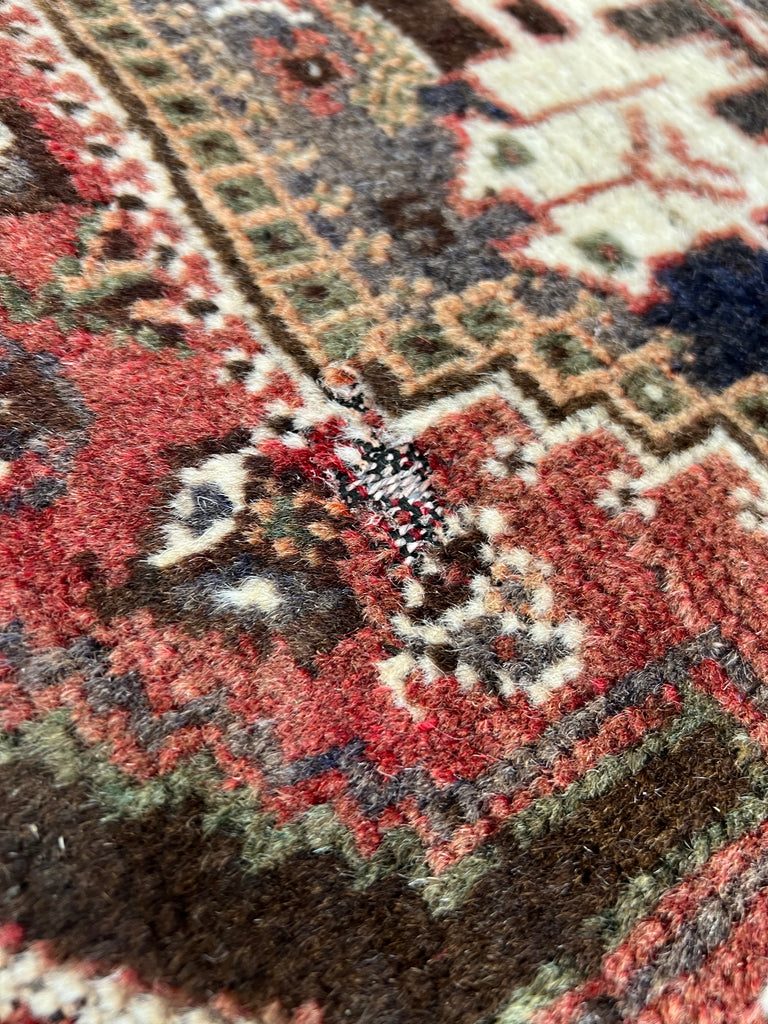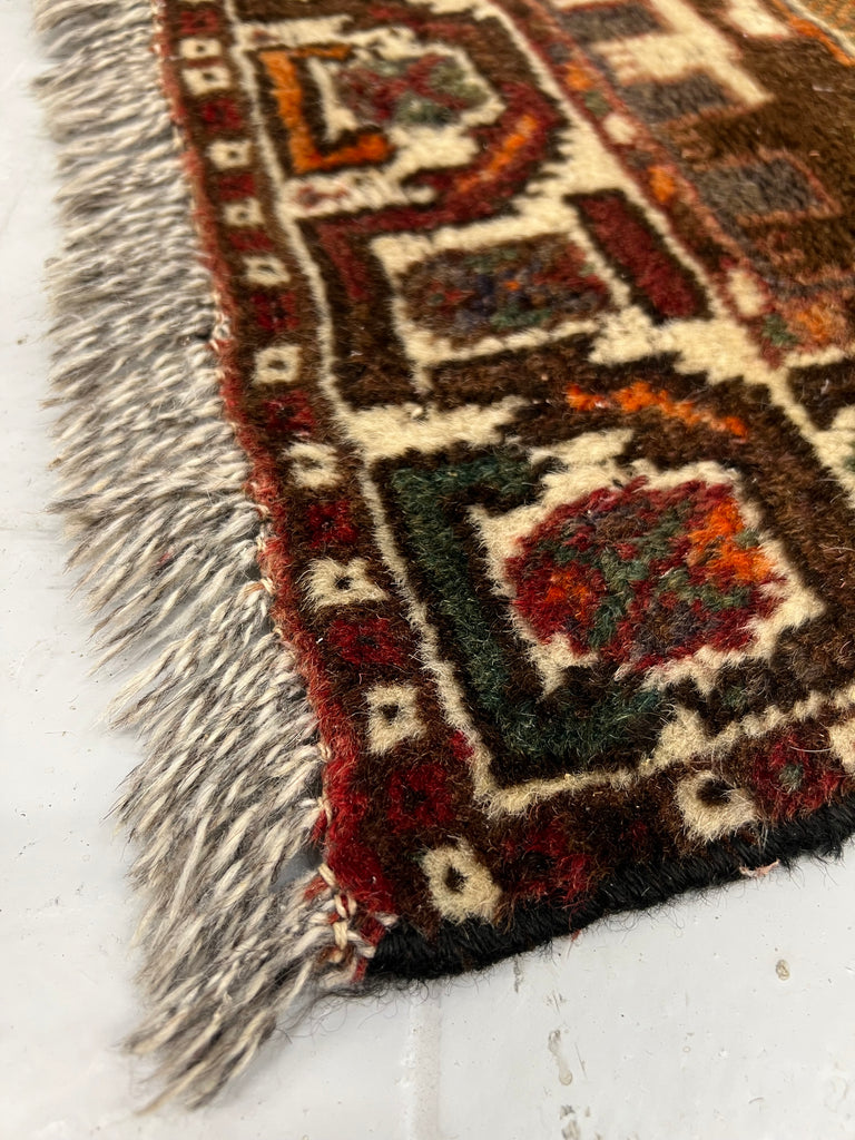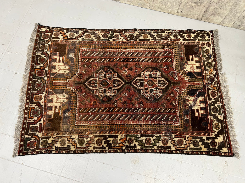 A very fluffy, muted coloured woolen vintage rug. In used and loved condition, a very few worn areas, worn ends.. but all characterful. Deep piled and cosy. Ready to use as it is.