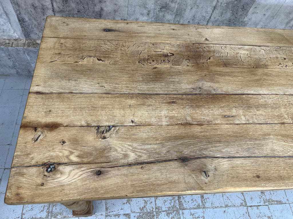 An incredible solid oak dining table, with the most beautiful patina.  Solid, heavy, but with marks of its previous life.  Can seat 12 easily.. maybe more with a bench.  Ready to use as it is.