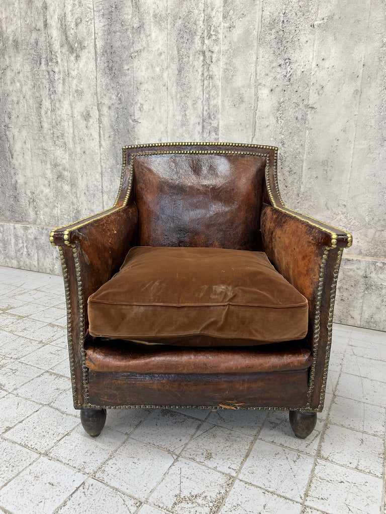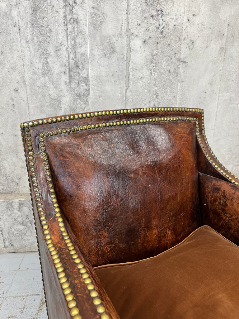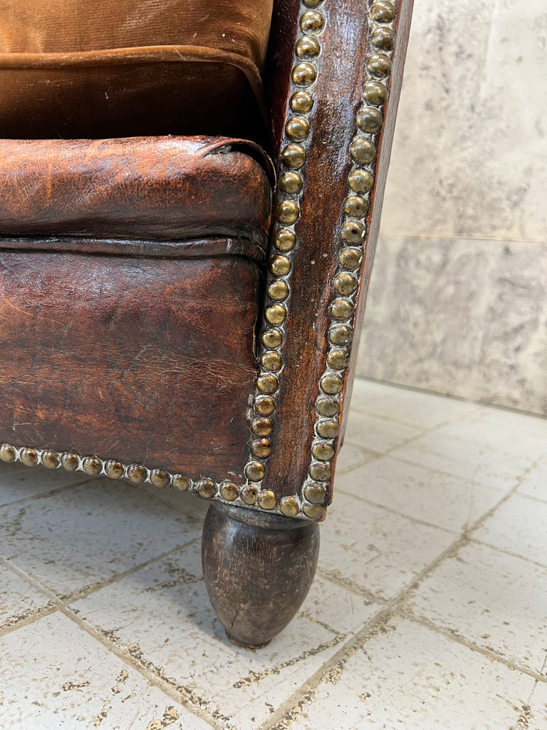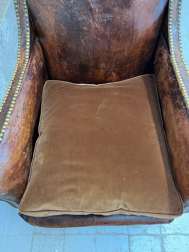 The most wonderful, characterful, antique studded leather armchair with the original velvet seat cushion. A really fabulous find. Worn in so many places, the leather is cracked in parts too, worn down from love an use in parts, but handsome striking, rare and ready to use as it is. I have taken photographs of the areas of wear for you to study carefully. This would be a treasured and favorite armchair of the next person to own this little piece of history. We have given the leather a nourishing treatment that has given it this slight shine in the pictures.. the leather is more of a matt finish once the treatment has soaked in fully.