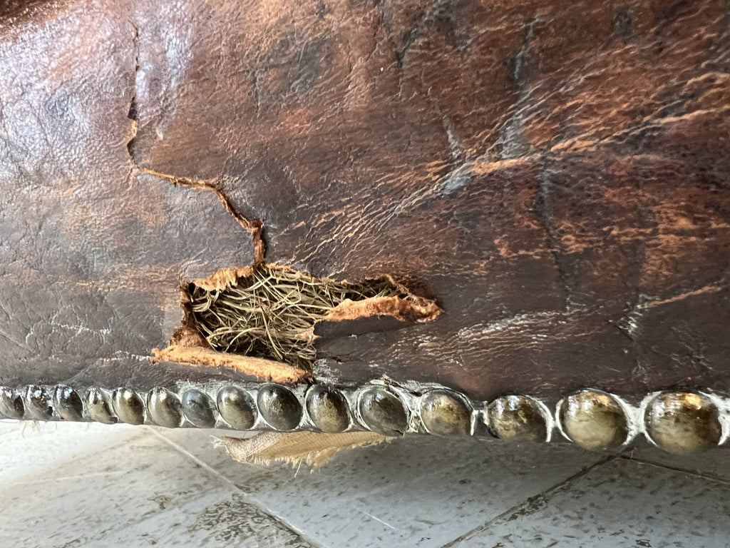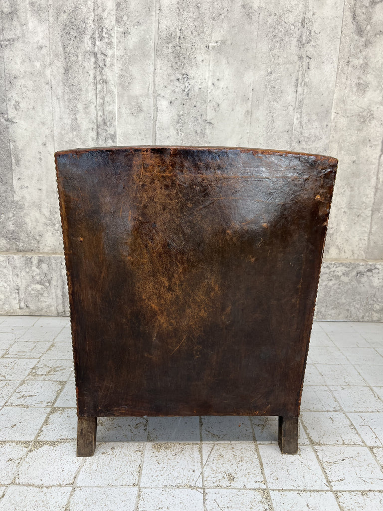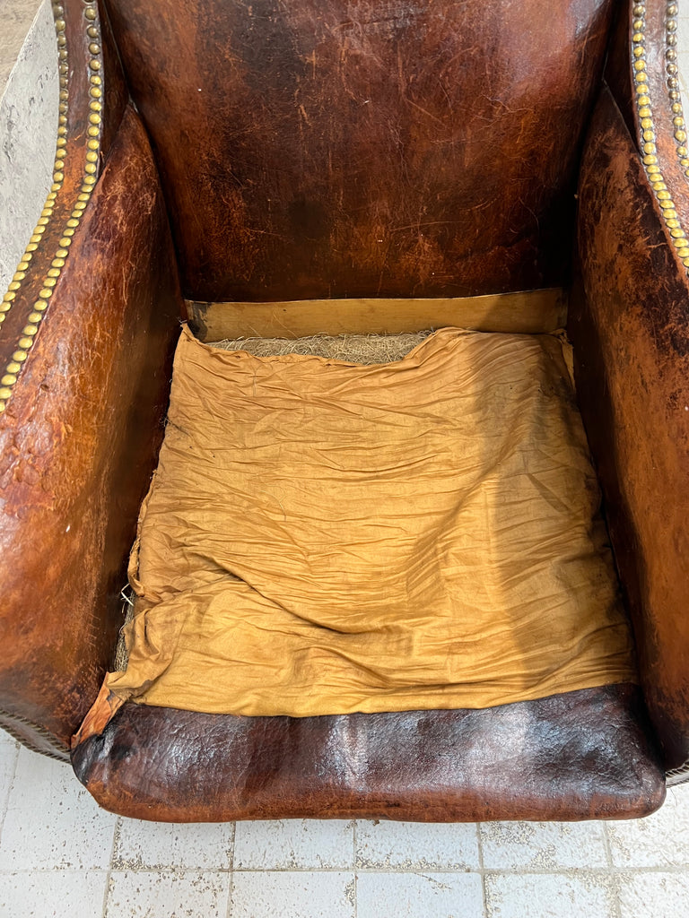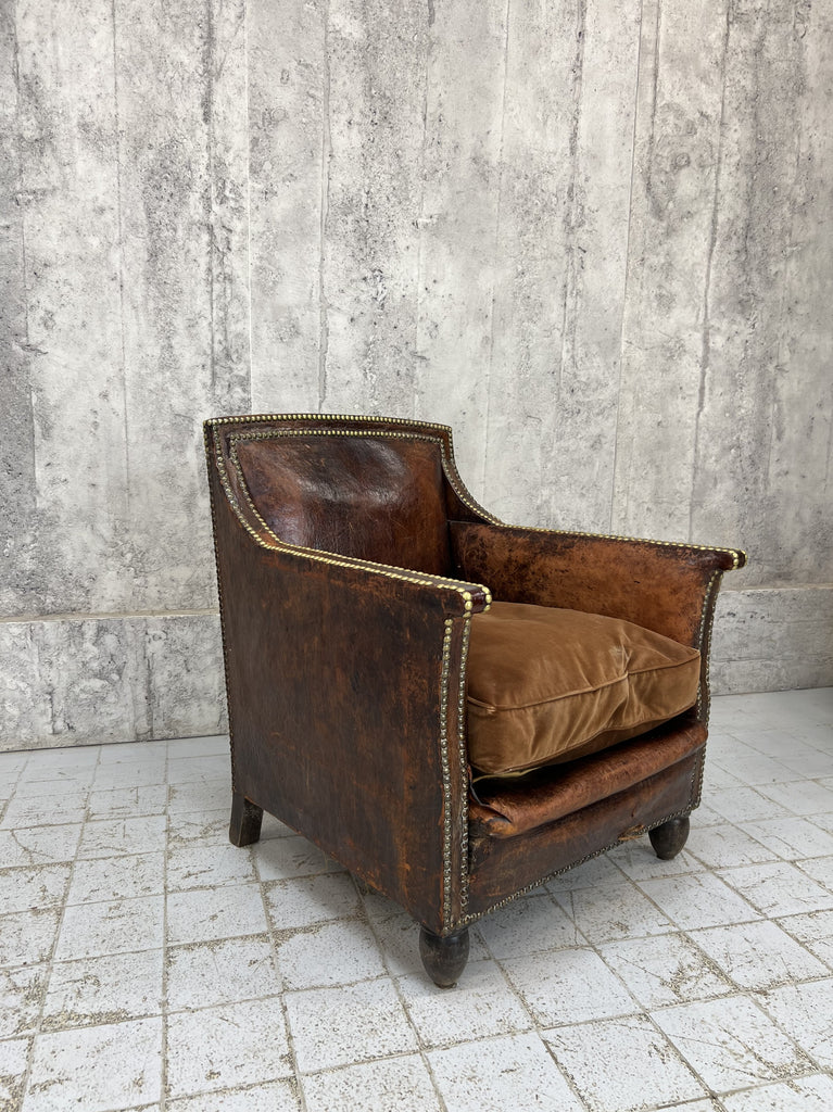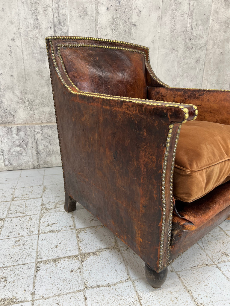 The most wonderful, characterful, antique studded leather armchair with the original velvet seat cushion. A really fabulous find. Worn in so many places, the leather is cracked in parts too, worn down from love an use in parts, but handsome striking, rare and ready to use as it is. I have taken photographs of the areas of wear for you to study carefully. This would be a treasured and favorite armchair of the next person to own this little piece of history. We have given the leather a nourishing treatment that has given it this slight shine in the pictures.. the leather is more of a matt finish once the treatment has soaked in fully.