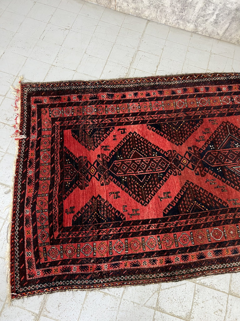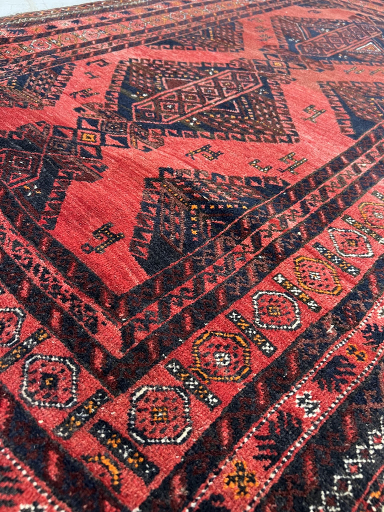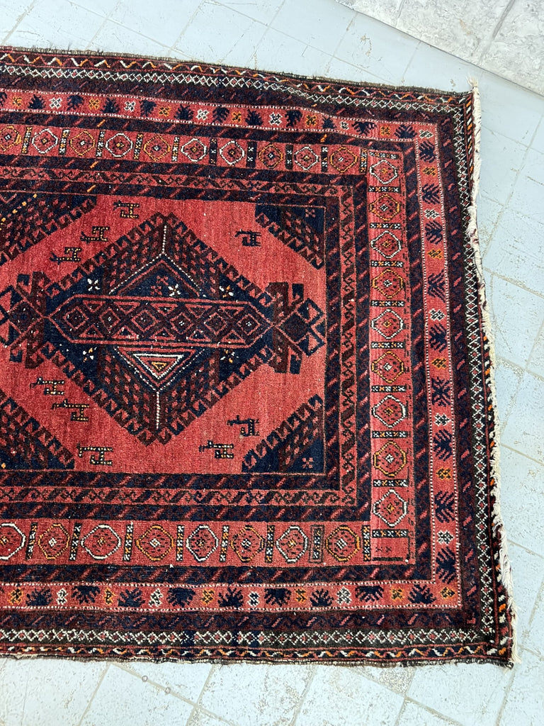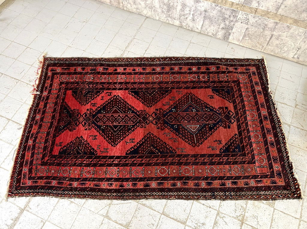 A very bold coloured red and navy blue wooden vintage rug.  In used and loved condition, no obvious holes, worn ends.. but all characterful.  Deep piled and cosy.  Ready to use as it is.