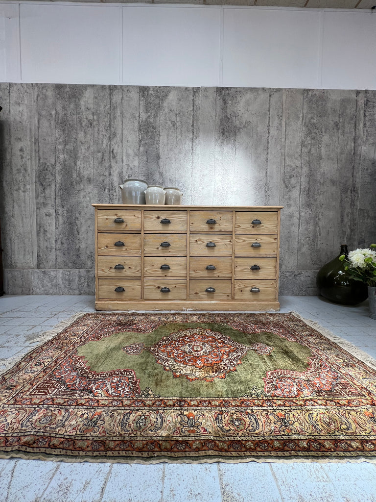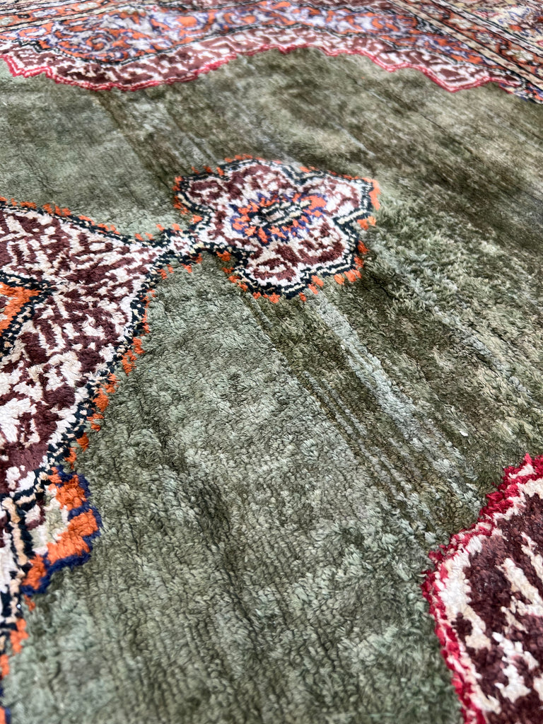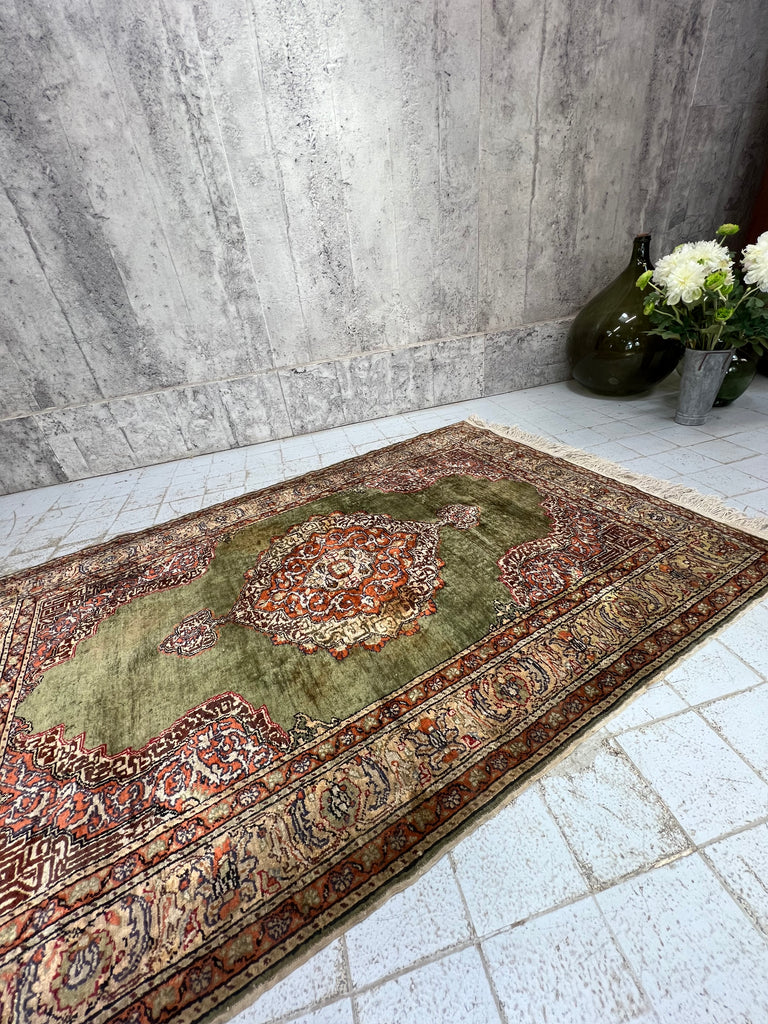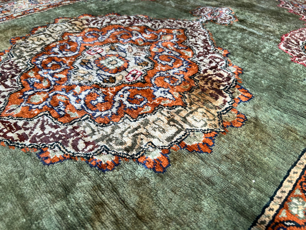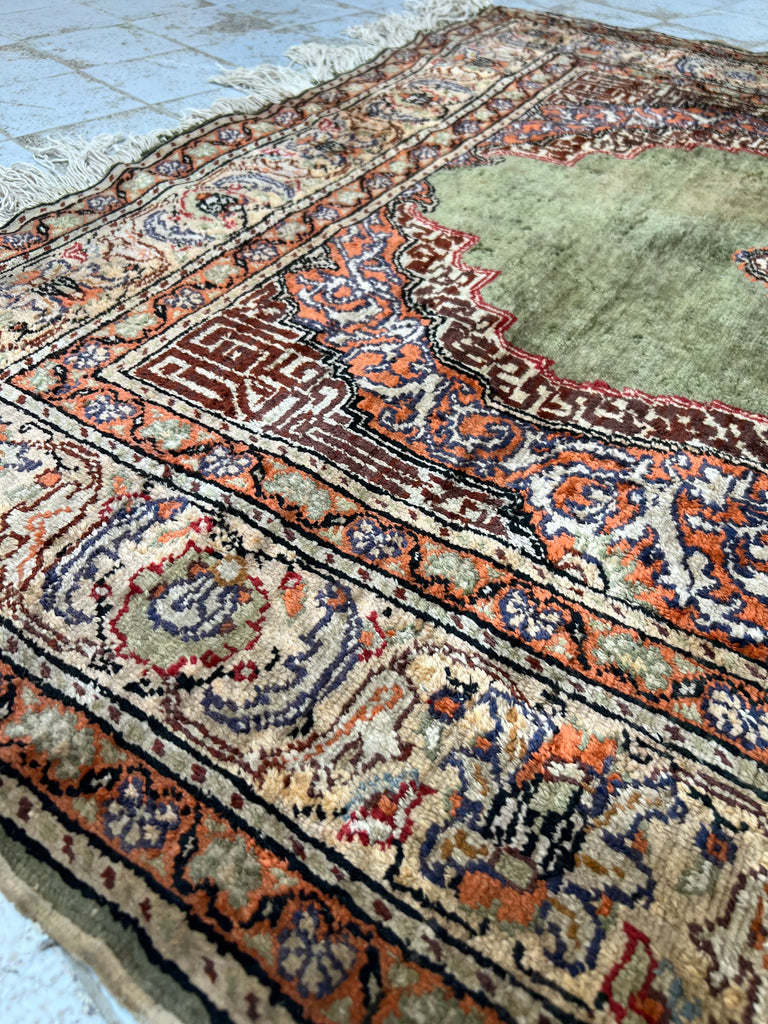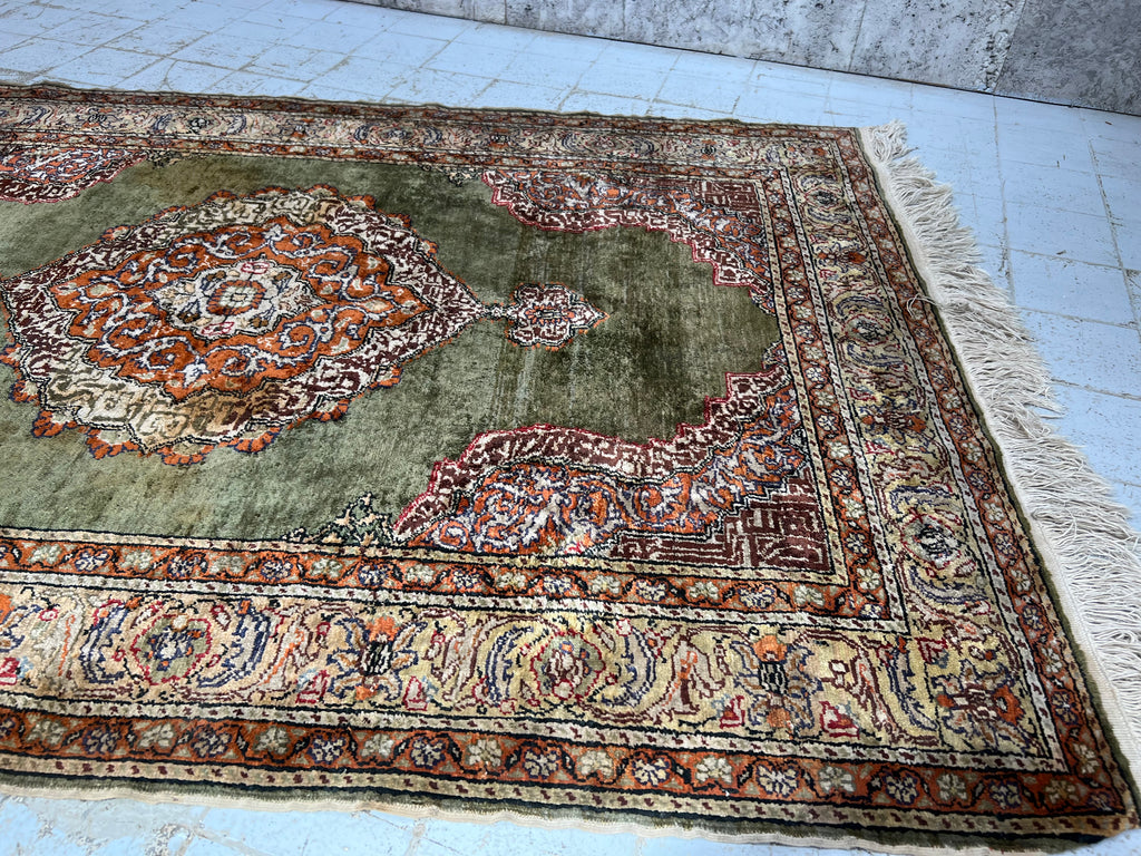 Made from silk, this beautiful autumnal coloured rug has beautiful olive and terracotta tones, it is a vibrant and beautiful floor covering. Worn in places and a few marks, with more cleaning that I am sure will come out. A striking and impactful selection.