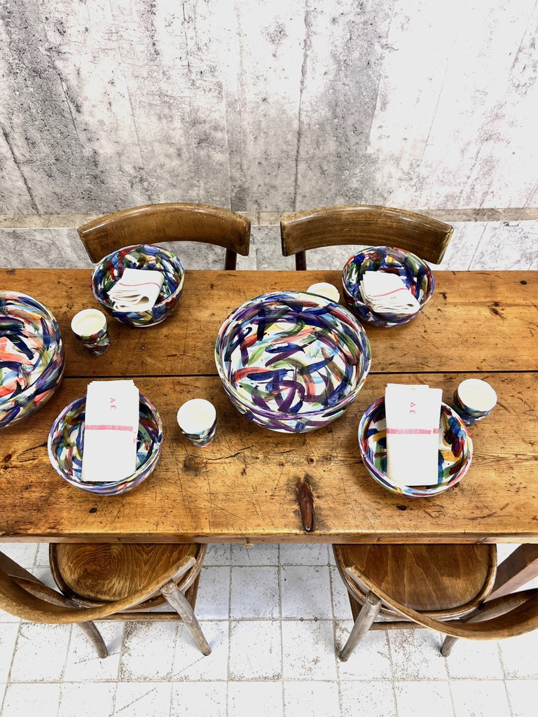 One of a set of beautiful hand painted set of tableware from a Women's cooperative in Morocco. We have a 20cm salad bowl and a 30cm Serving Bowl in the set, seen together in the final picture here. This listing is for the cup only. If you would like more than one piece please send me a message so that I can adjust the delivery price for one delivery only (sophie@vintagefrench.com). Suitable for use in the dishwasher. We have only 20 cups remaining.