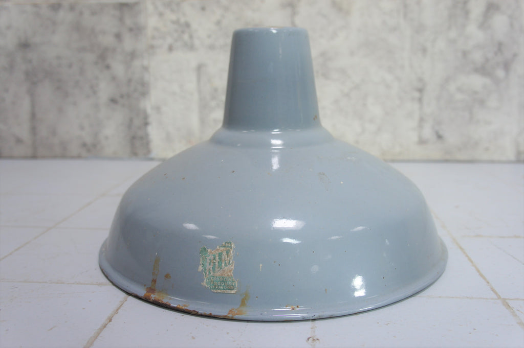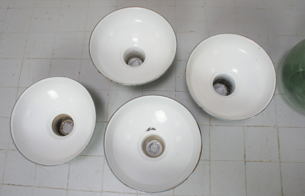 A hard to find set of 4 matching industrial metal light shades. In great condition ready to use as they are. Original found in industrial locations around the country, these are classic styling that works in many residential or commercial spaces. The paint colour is a light grey with a white interior. There are areas of wear. Please see the photographs. A fabulous find.