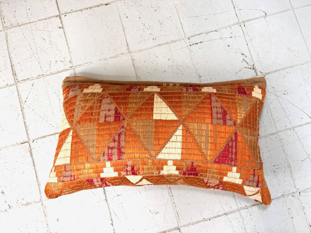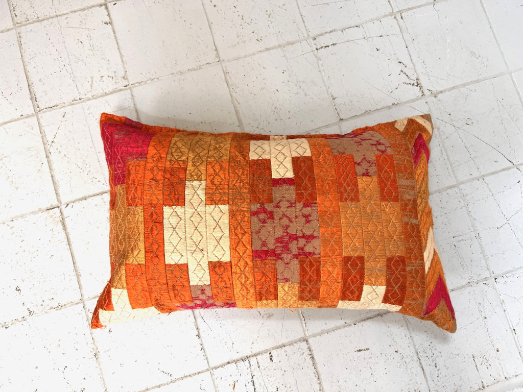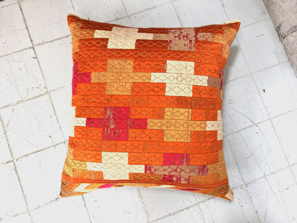Back by popular request, we have managed to get Claire to squeeze three more of these wonderful scatter cushions from her remaining vintage fabric. The two rectangular have the same fabric on both sides of the cushion and the square has this lovely linen backing. The hand stitched geometric design is made from hot pink and variations of orange silk thread, this stunning set of cushions has been made from antique fabric from Asia. The cushions would be ideal on a bed or dressing a sofa in a sitting room.