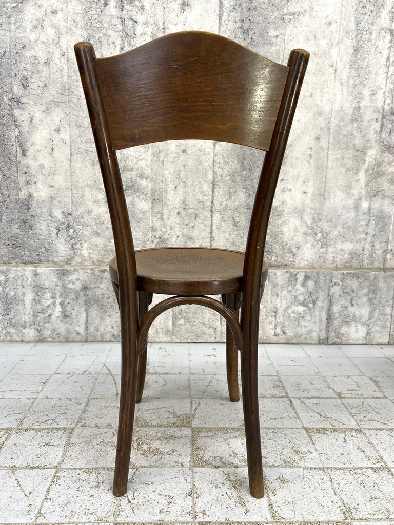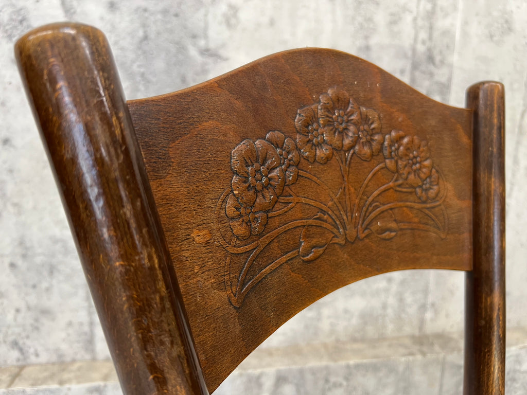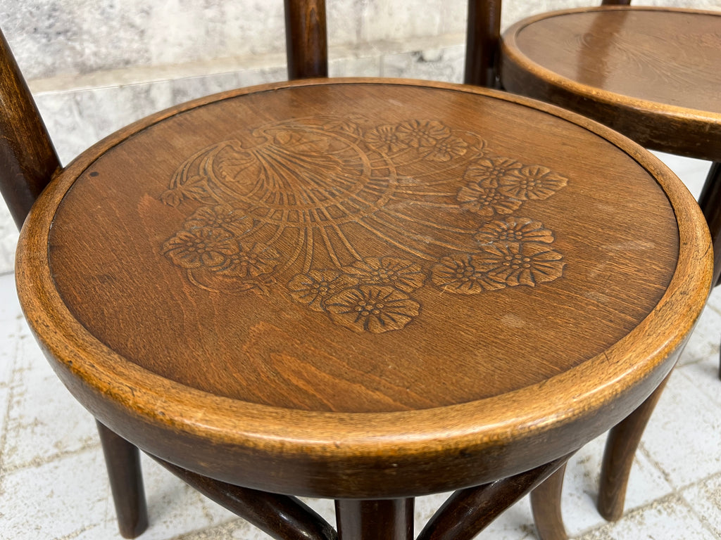 A classic pair of decorative bentwood bistro chairs with beautiful embossed seat pads and back rests. In wonderful condition and ready to use in a commercial space or in your home.