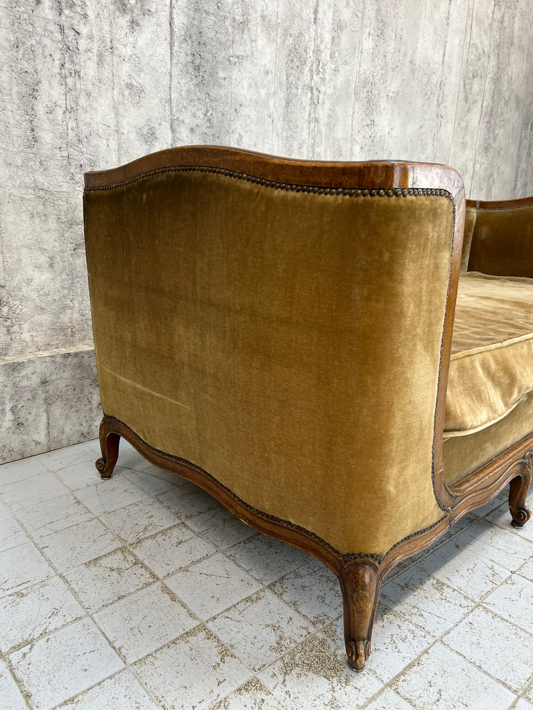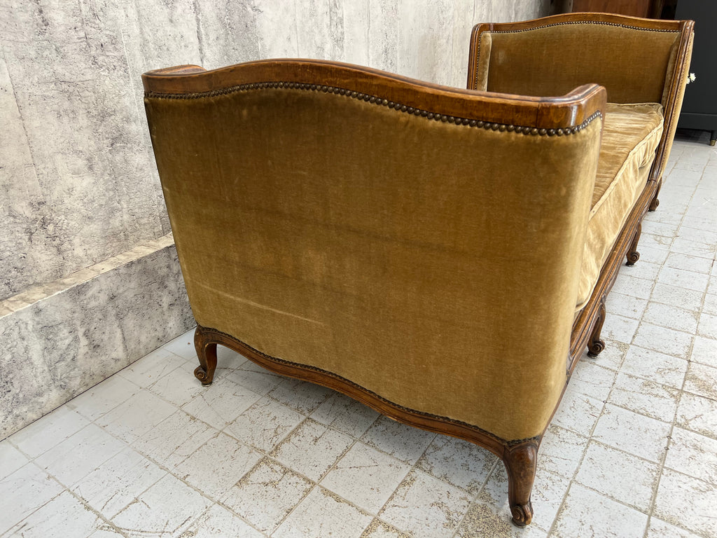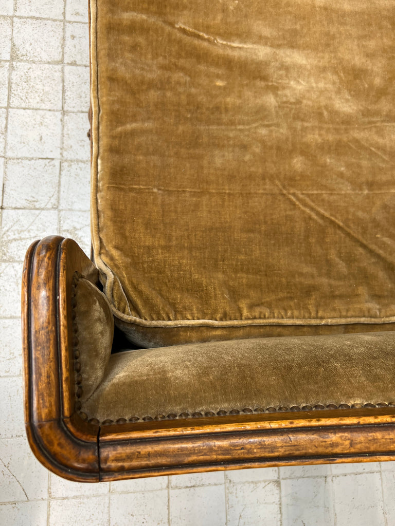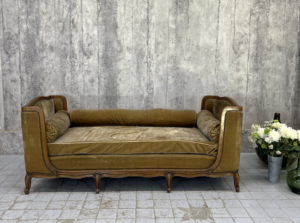 A wonderful walnut wood day bed with the original mohair velvet upholstery and three matching bolster cushions. A much loved and used day bed which would look amazing in an alcove, at the end of a bed, in a sitting room or as a spare bed in duel purpose room. In wonderful condition, as you would expect the walnut wood has wear and the velvet, whilst has been cleaned, you may wish to give it a further scrub.. or even reupholster it if you wish. The mohair is worn in patches, to us the wear to this piece is part of its beauty. If you prefer pristine, I would probably suggest you replace the fabric. All original.. in excellent condition. Ready to use as it is.