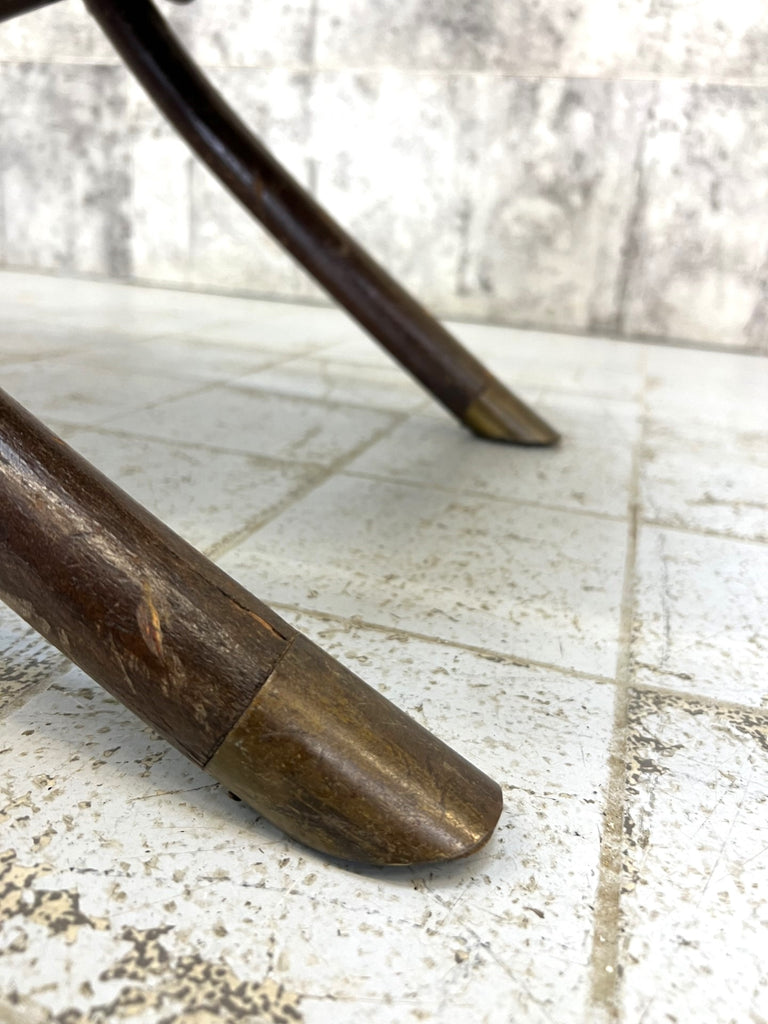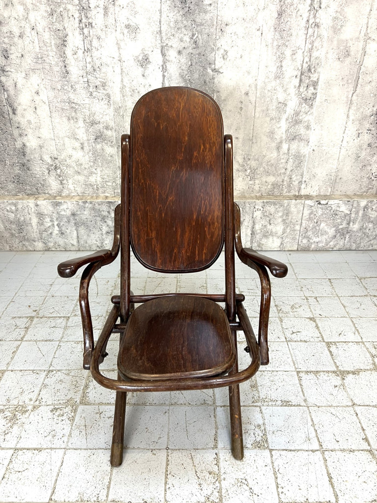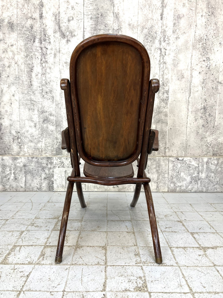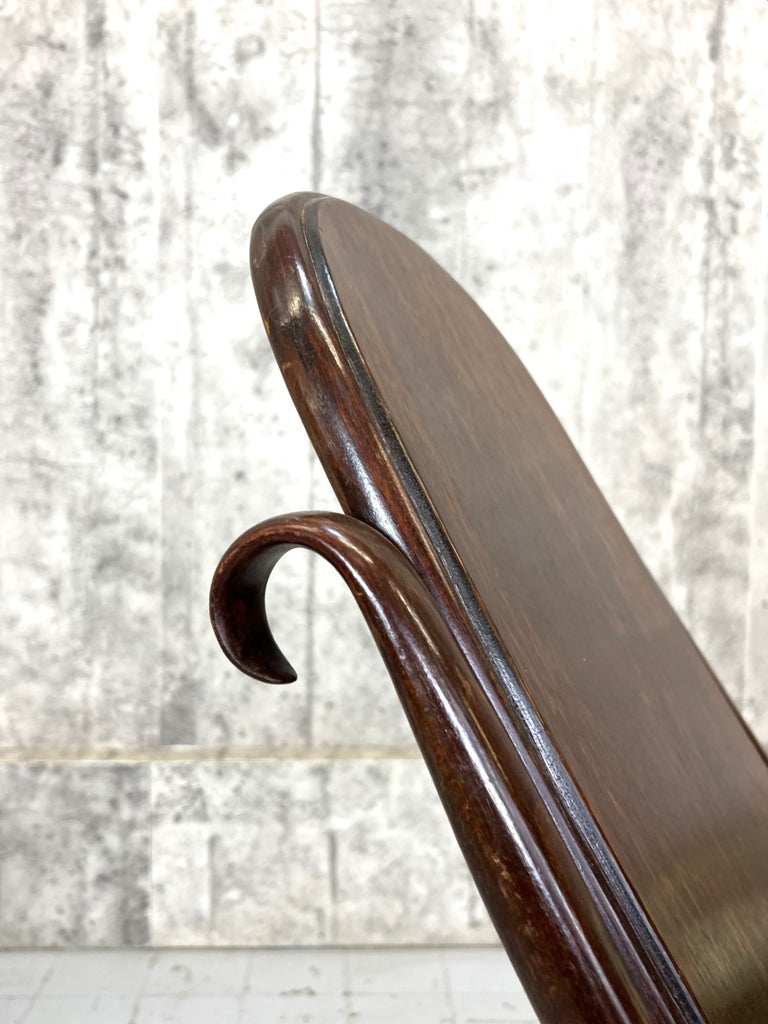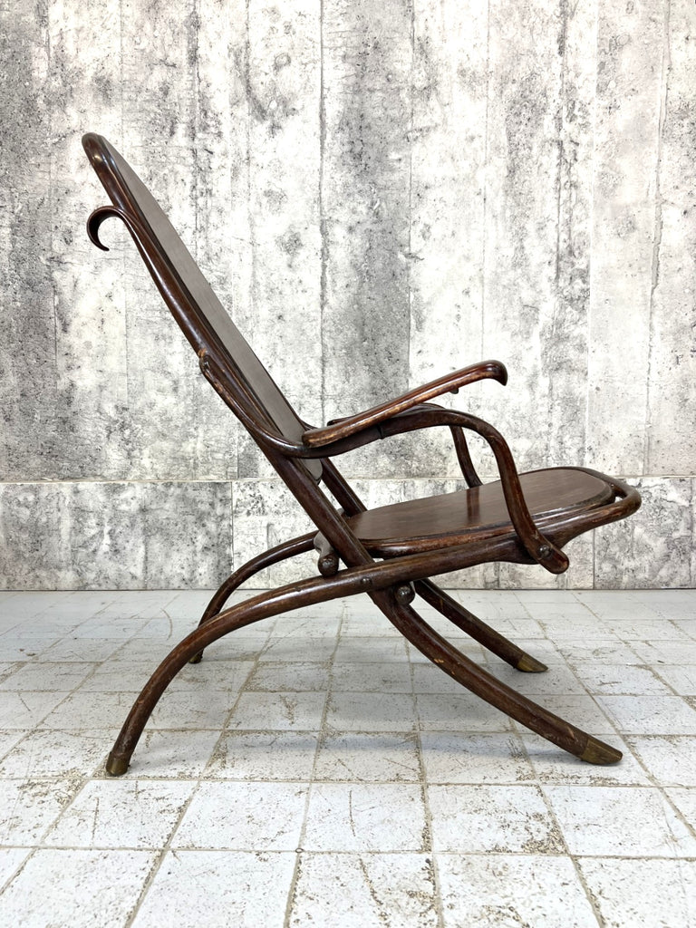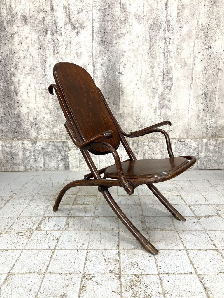 I have never seen a bentwood chair like this. It is an armchair that folds flat, more deck chair than armchair perhaps, but it has these lovely arm rests. I suppose this would have been used in the garden or on a covered terrace, or in an orangery perhaps. It folds almost flat for easy winter storage. A really unique piece. Perhaps to be considered for light use due to the construction and the hinging. For instance, I wouldn't want to put all my weight on the arms to get out of the chair.. they will wobble a little bit, but overall the construction is sound. The legs have this lovely brass detail on the bottom so stop the wood from wearing out. A unique and lovely piece.