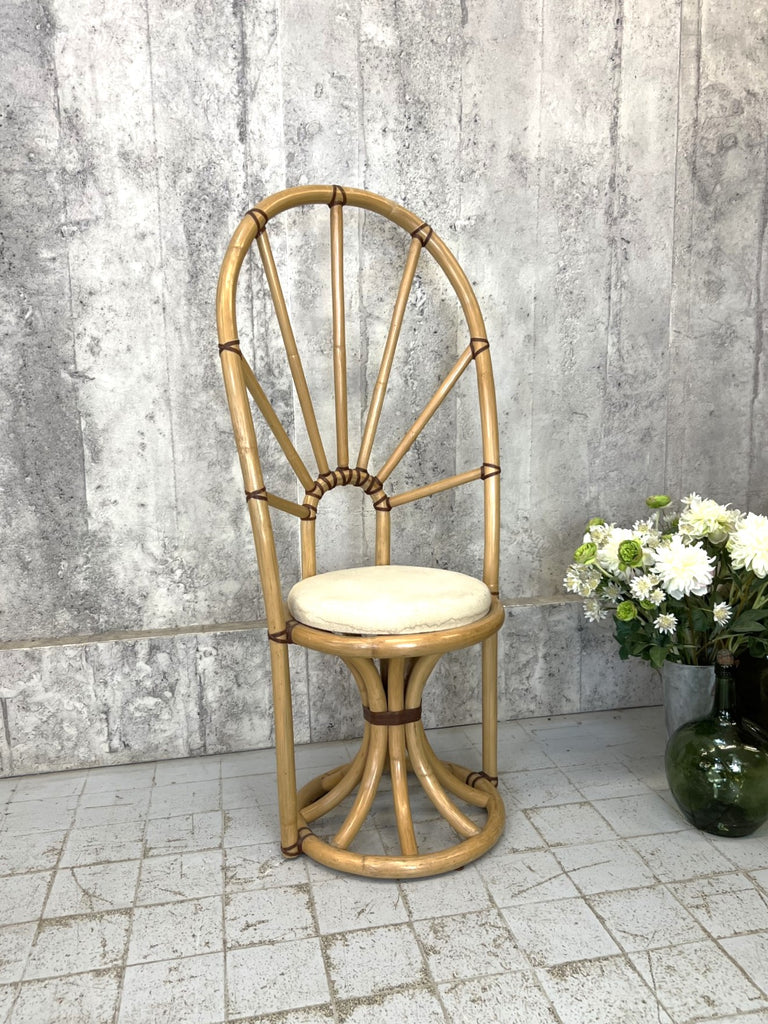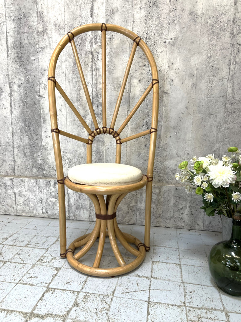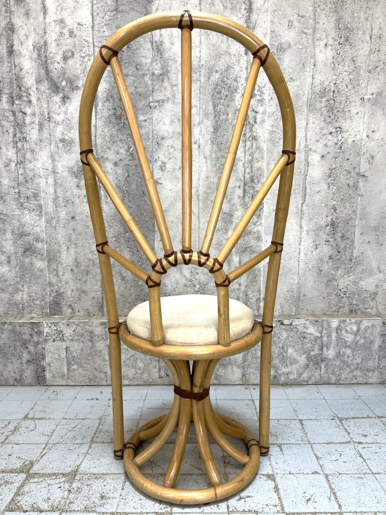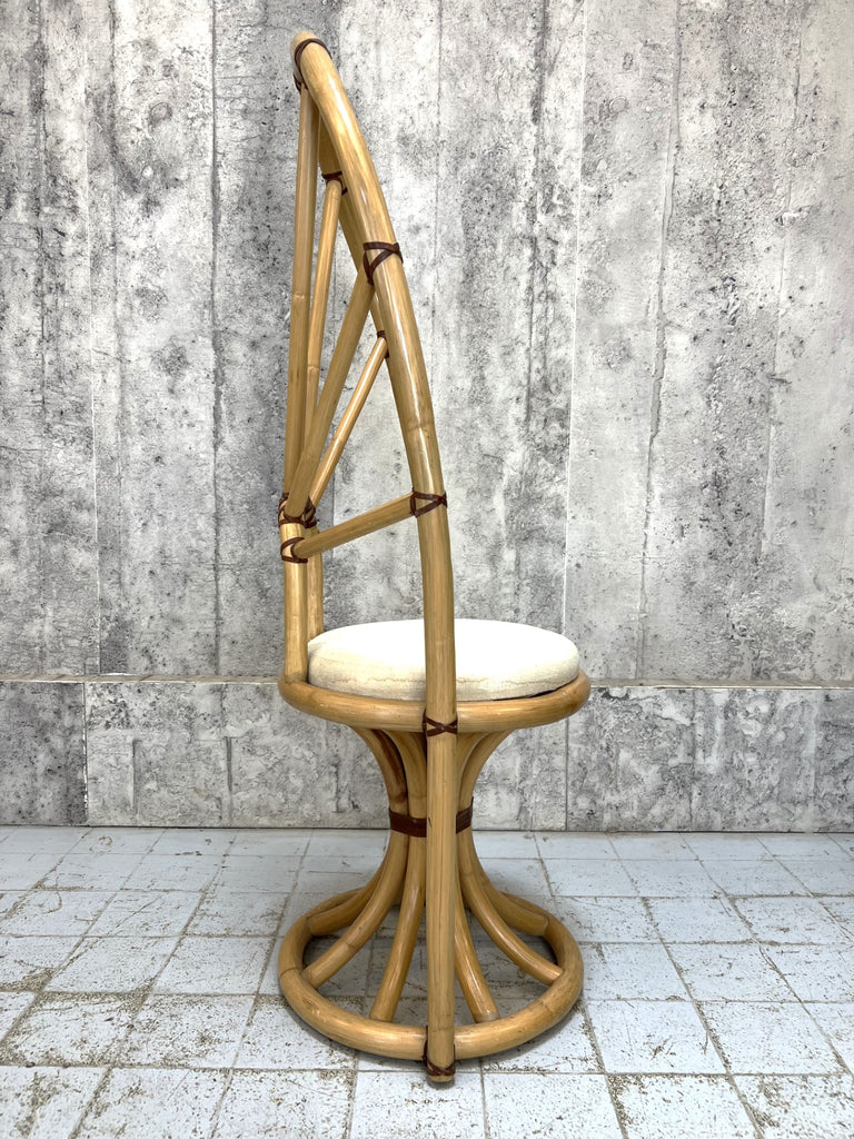 An incredible and unique mid century leather bound leather chair. More throne than chair. The bamboo is wound with leather, is in excellent condition and apart from the fabric on the seat pad which needs recovering, this chair is ready to use. Ideal in the corner of any room, adding height and character... also superb in an orangery, conservatory or garden room. Unique and quite the talking point.