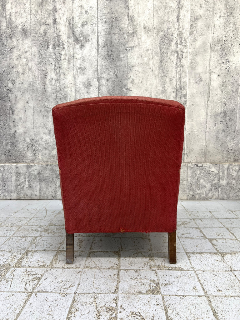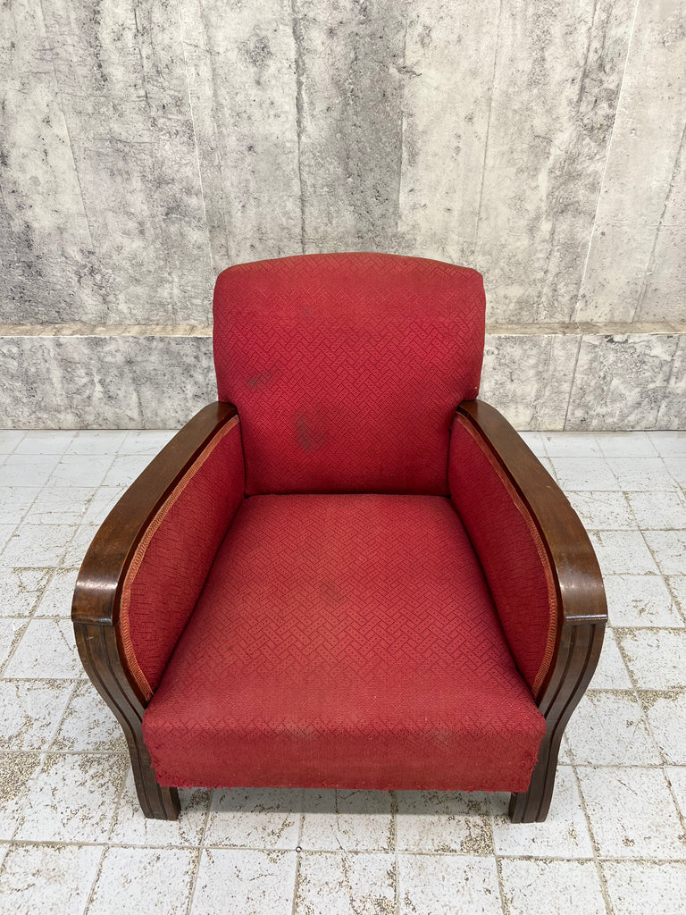 A fabulous, hard to find Art deco armchair the original fabric and a rounded design typical of the age. To us this armchair is as beautiful from the side as it is from any angle. The structure to the chair is sound, and the fabric is original and can be used as it is but we are selling to reupholster. The chair has bumps and bruises as you would expect from its age and use, but this is a piece of furniture history and is a wonderful find for any home.