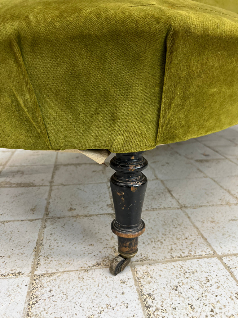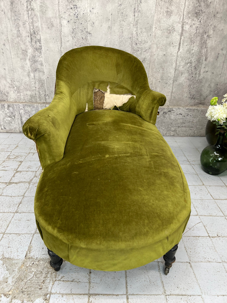 I absolutely adore this Napoleon III moss green cotton velvet chaise longue despite its obvious areas for improvement.  The colour of the fabric is delicious, the form of the chaise longue is perfect.. I love sliding int a chaise longue, putting my feet up and having a moment of me time.  The legs are ebonised turned pear wood, the velvet is cotton and this is a wonderfully comfortable example.  A you can see there are areas of braid that need sticking back down and the panel that has the lumber support has been ripped... you can see the original stuffing underneath.  As you can see from the photographs however, if this is nearly perfect for you and a few throw cushions are up your street, this can be used as it is.  WE have priced with the rarity and beauty in mind but in consideration of the work required too.  An absolute treasure.