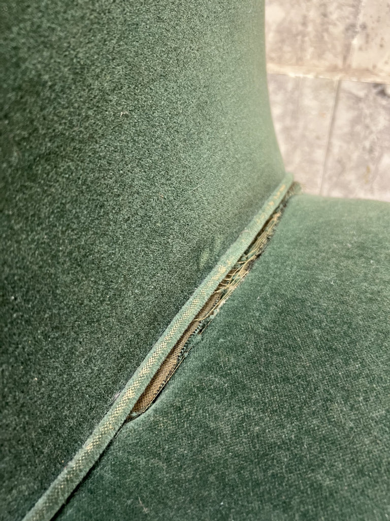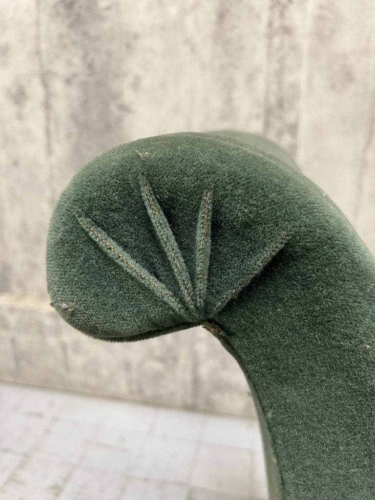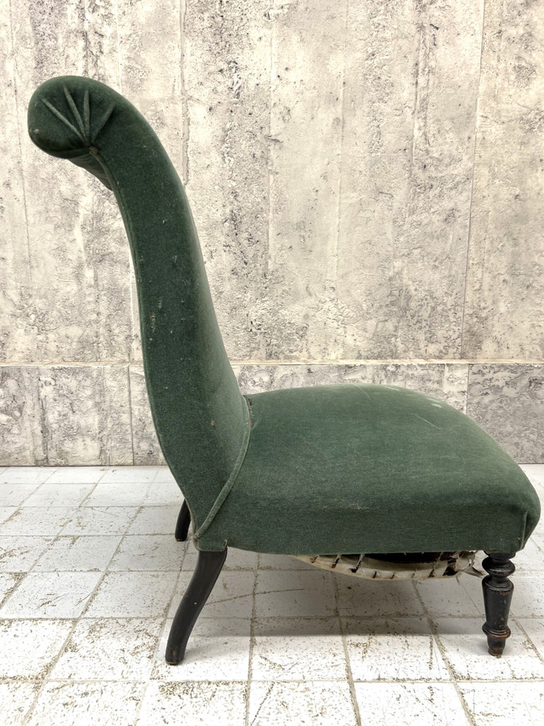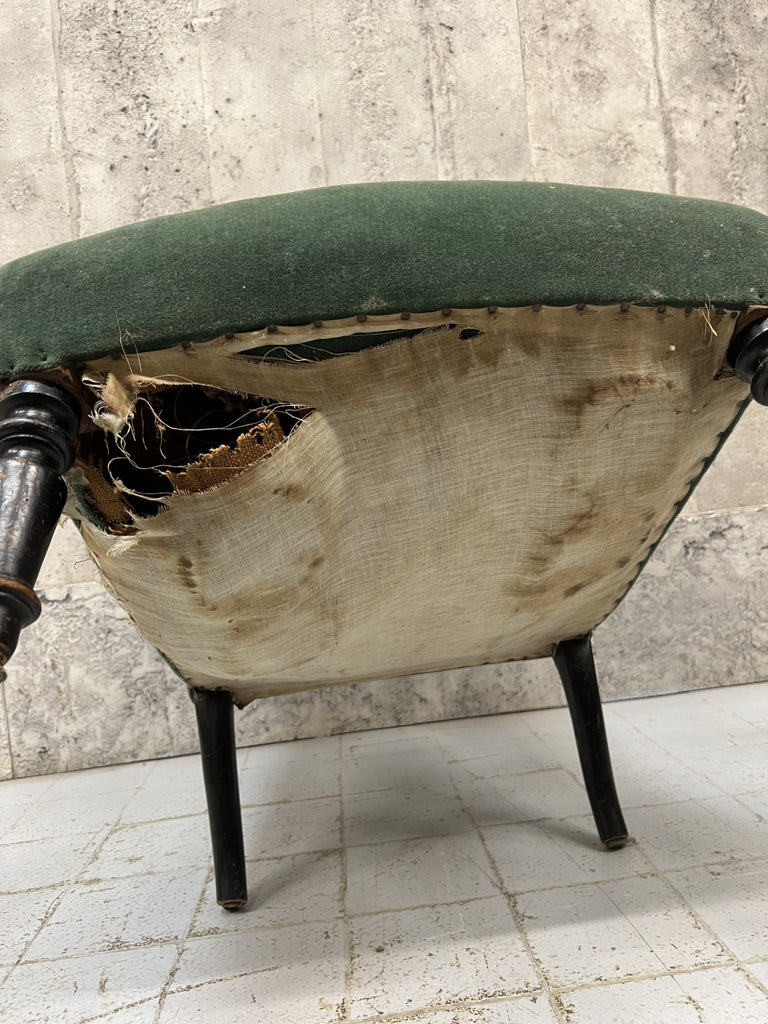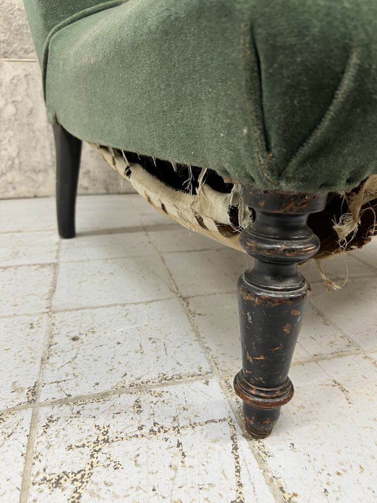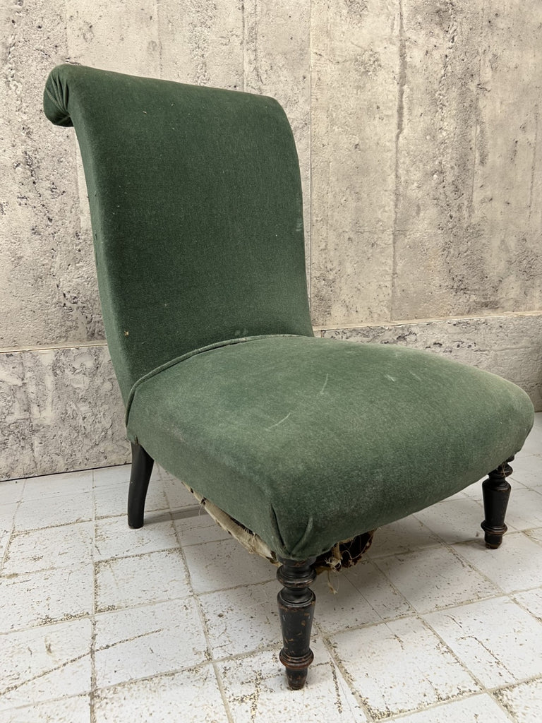 A beautiful shaped slipper chair with beautiful ebonsied turned front legs and this sage green mohair velvet upholstery. The springs I am afraid have come free so this chair will need a little attention to get it back to pristine condition and the beautiful original velvet is worn through and split in places, but if you love this shabby look, the chair is comfortable and ready to use.. or you could have the work done on it to bring it back to its original form. A beautiful little chair.