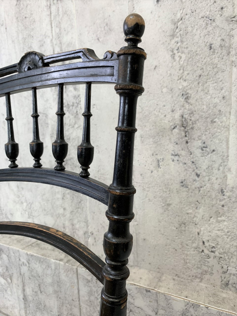 Dating from Napoleon III's time, these ebonsied chairs are very pretty and delicate, this example has the most wonderful shape to the back and the black paint has been worn down to the pear wood where people have repeatedly touched the back. Such pretty chairs, perfect for use in a bedroom Selling as a pair only.
