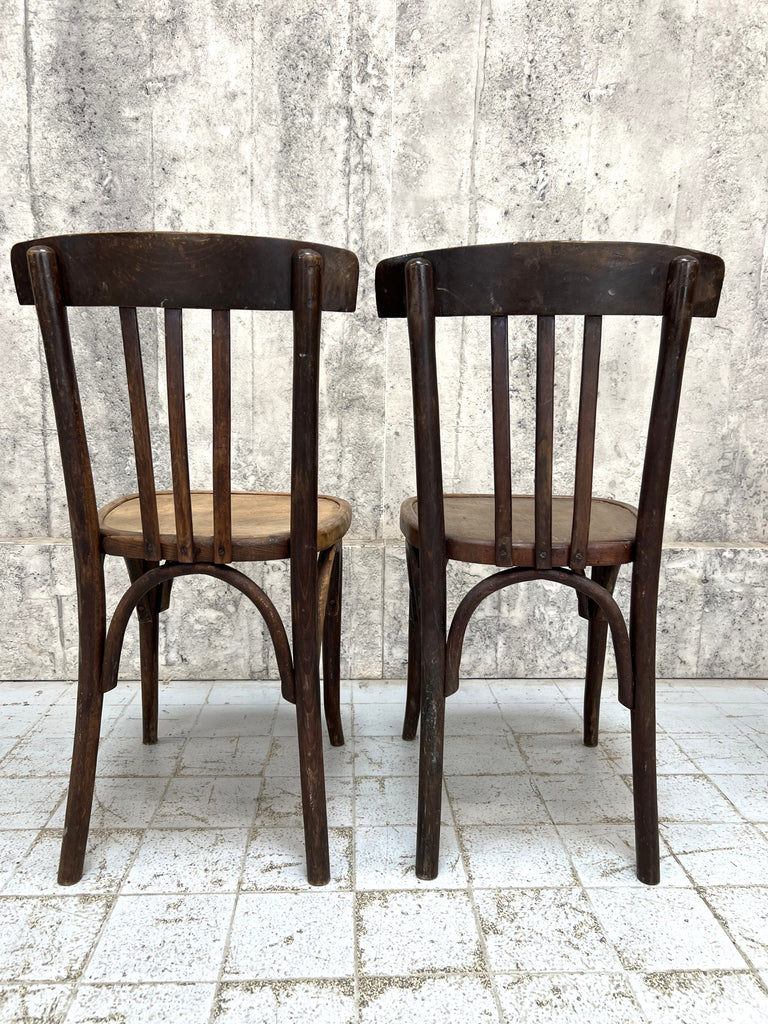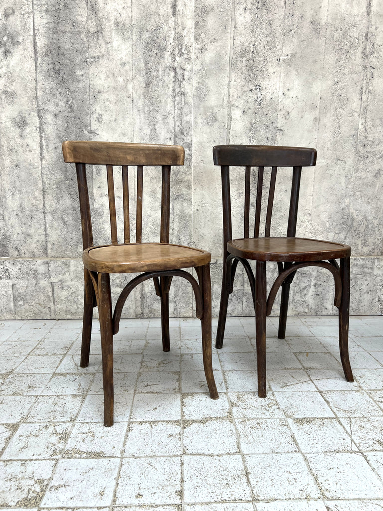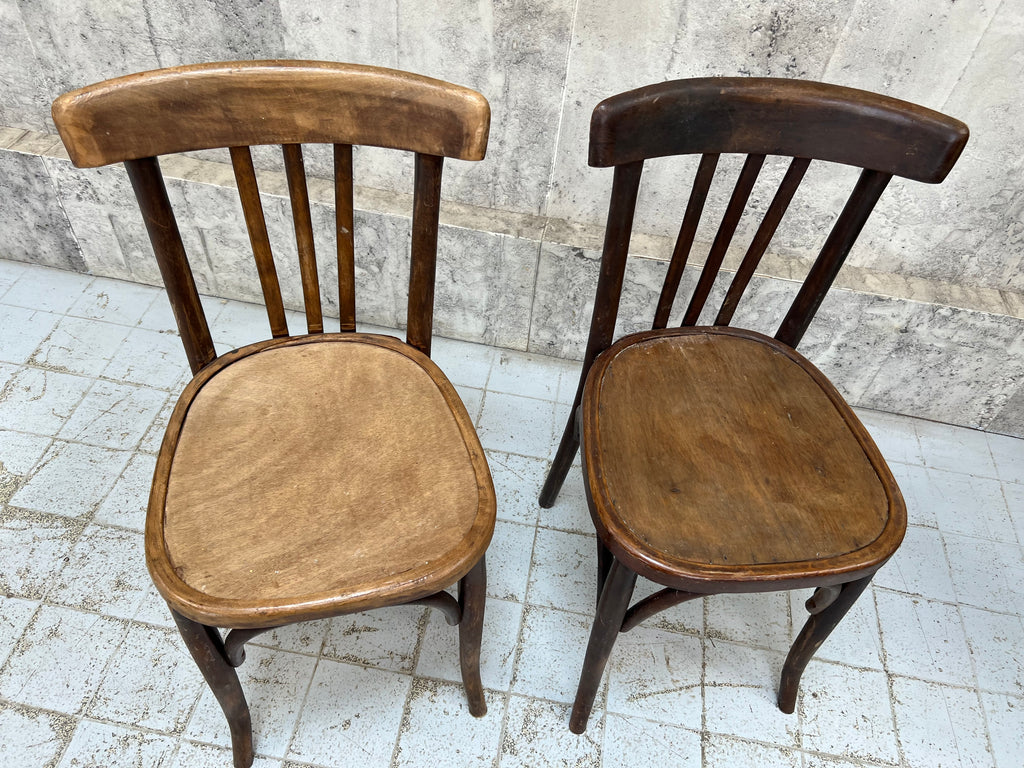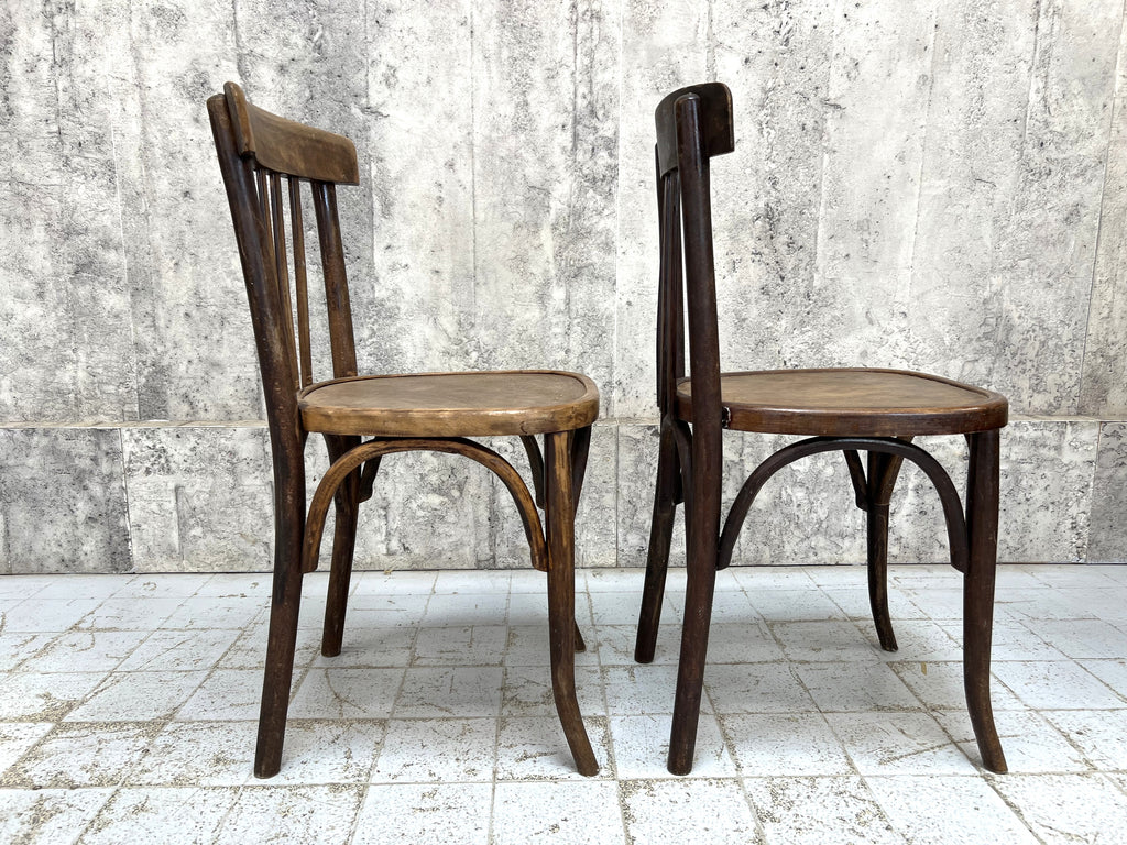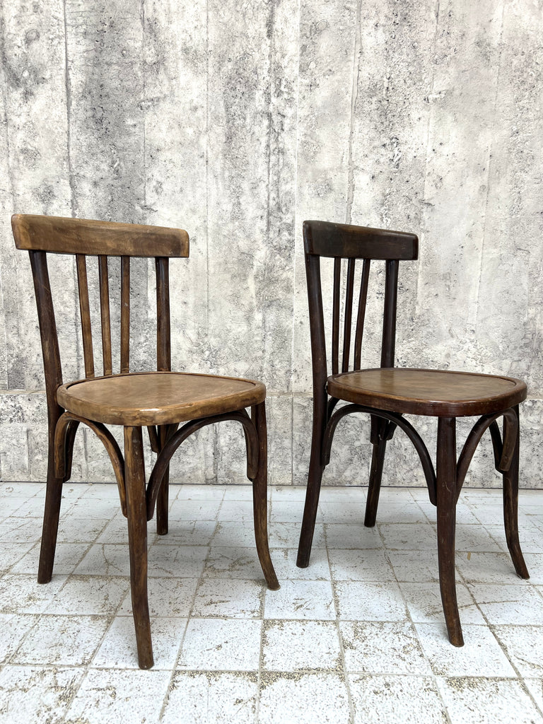 A fabulous pair of bistro or cafe chairs. These will make the perfect set for a dining space or a commercial space too. A matching pair in perms of shape, but these have had slightly different lives and so the colour is not the same to both chairs. A charming and characterful pair. Hardy, hardworking and a classic bistro style. Ready to use as they are.