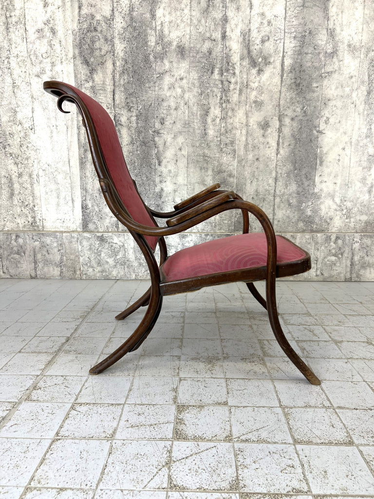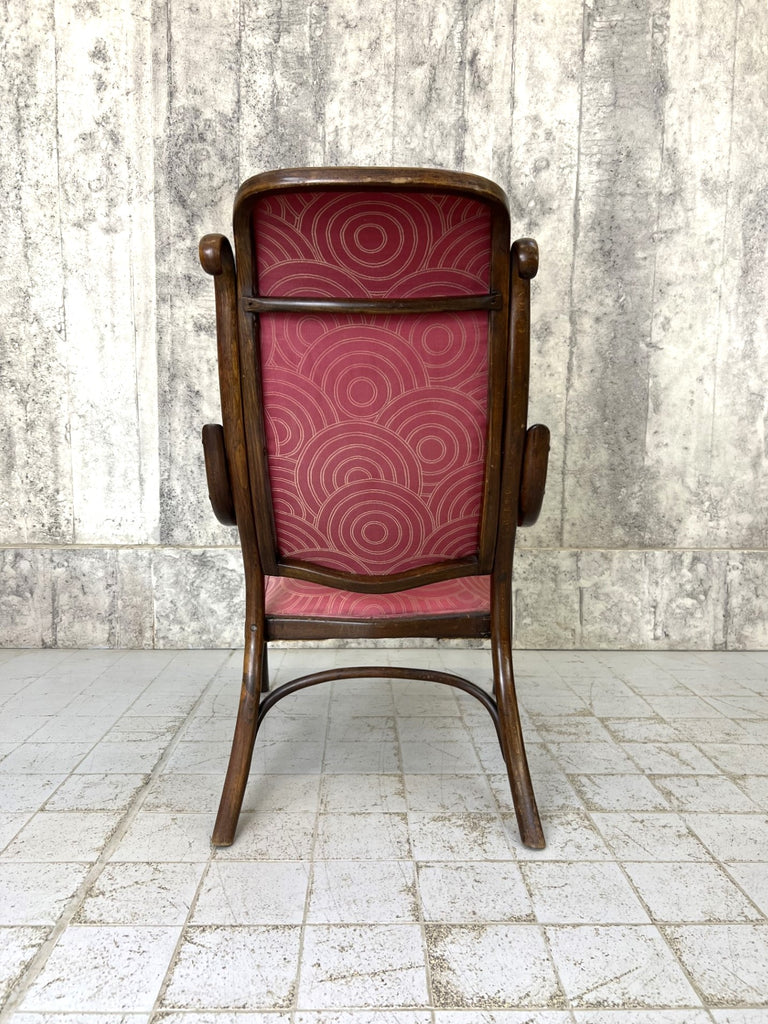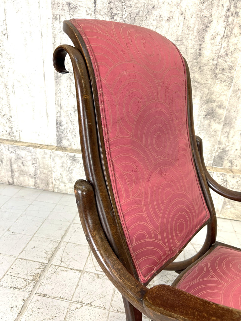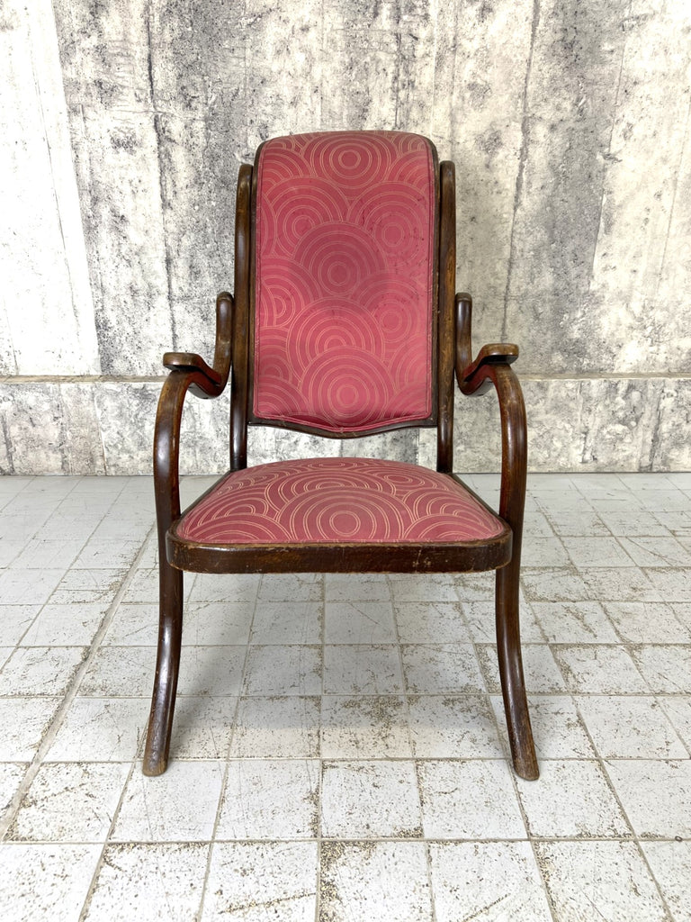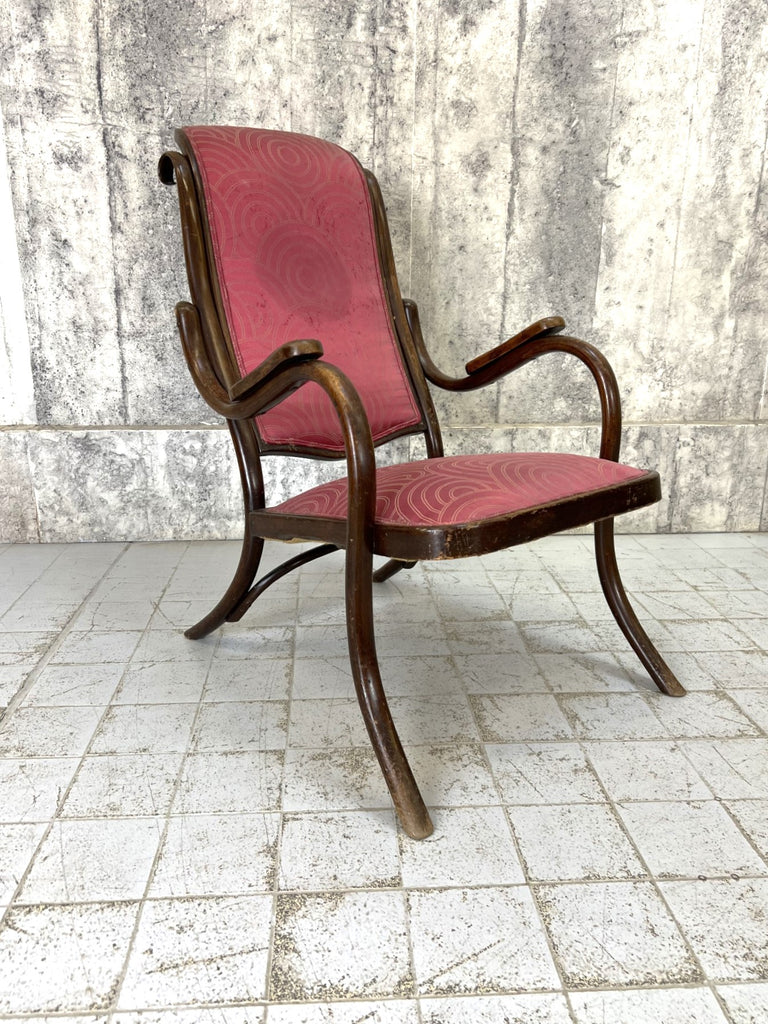 I have never seen a bentwood chair like this. It is an armchair that has sections that are upholstered these beautiful arm rests. Made from the traditional bentwood chair making tradition, made famous by Thonet's round back bistro chair, this unique example is found in its original condition. The fabric is a little worn and tired in places so we are selling to reupholster. A unique and lovely piece.