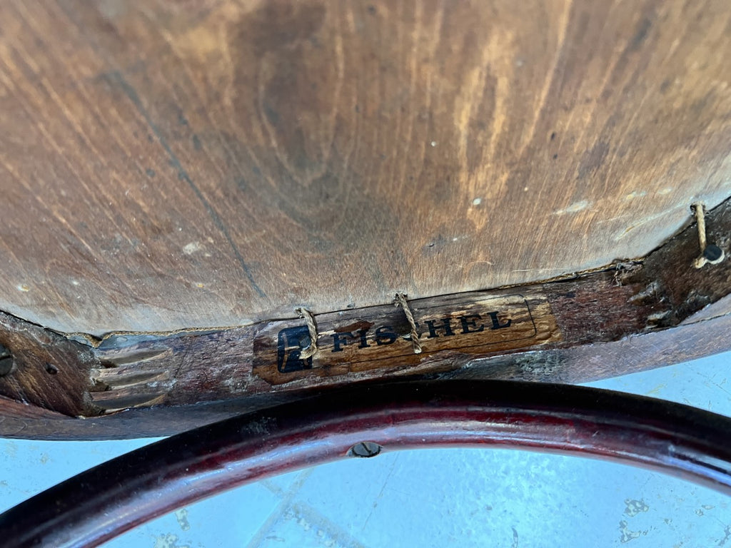 This is a RARE find indeed. This is a set of eight, matching and marked Fischel Bistro chairs. All in wonderful sound condition with the original upholstered seat pads which are in very carefully used condition. I have taken some close ups so you can see the extent of the wear.. these are the worst as I recall. Having said that, they don't snag or stress when you sit on them so if you are looking for original condition over perfect condition, these are for you. Ready to use as they are