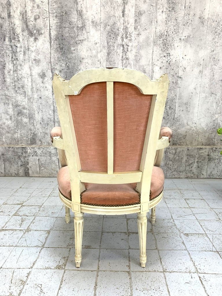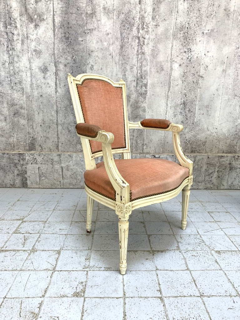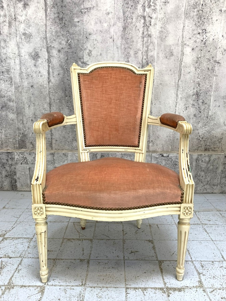 A mid century copy of a Louis XV style armchair. It has a pretty shape to it but needs new upholstery. Structurally sound, this could be a nice little project for someone.. we have priced accordingly. Would be ideal in a bedroom or in a reading alcove.