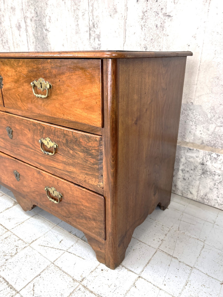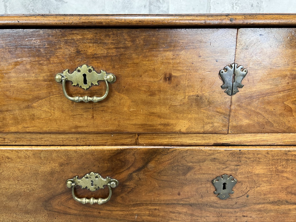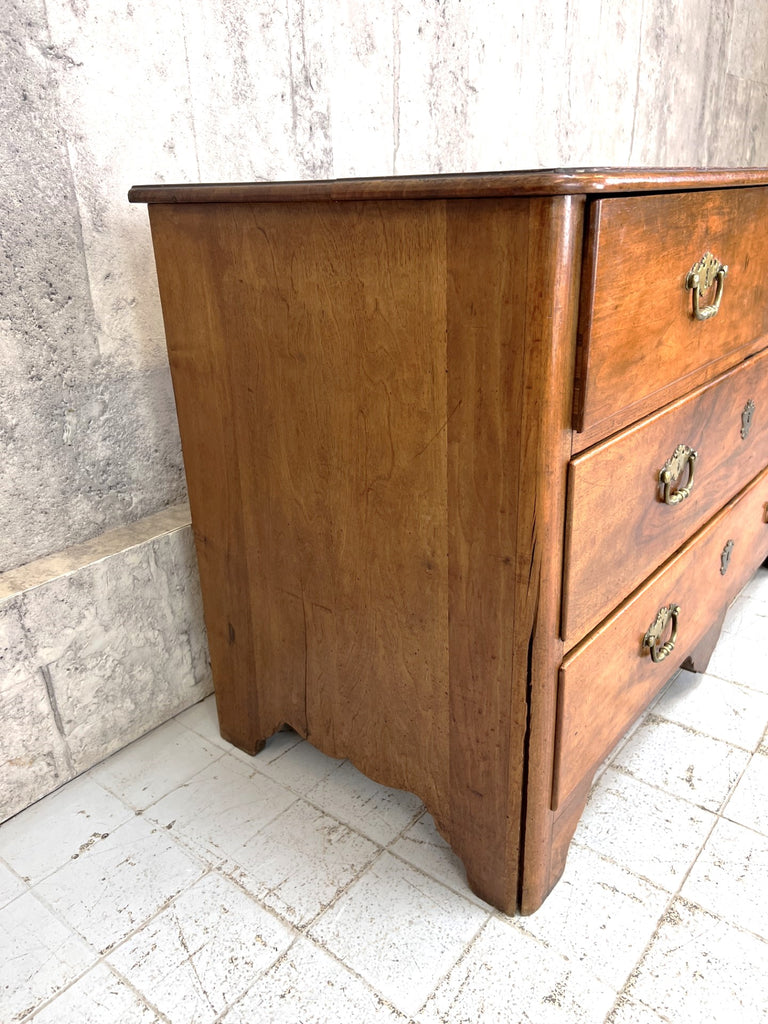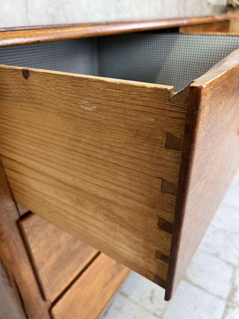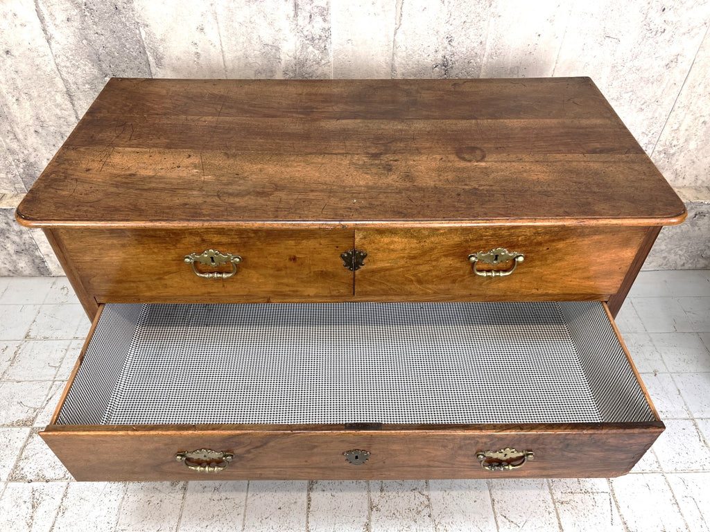 An absolutely stunning low chest of drawers with two smaller drawers over 2 larger drawers. The patina to the wood is beautifully warm and deep in this beautiful chestnutty colour. The original brass drawer furniture included and fish tail joints to the drawer construction. You can see there are splits to the wood along the side and other bashes as you would expect to a piece of this age and use, but none of these affect the use of the chest of drawers and to us, simply add to the charm. I absolutely love this piece.. would be absolutely stunning in a modern or vintage inspired space.