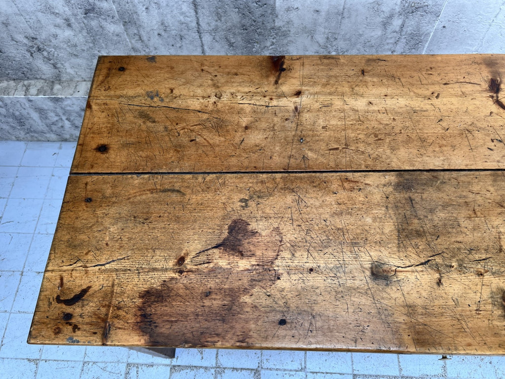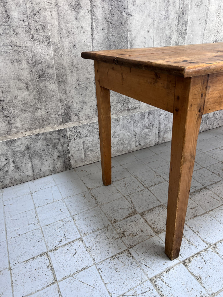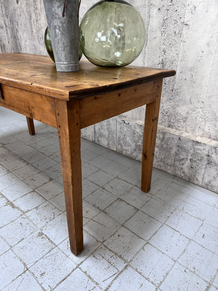 A solid pine table with the most beauiful patina to the wood.. there are lots of marks of its past as a kitchen table.. heat marks from pans, spill marks, raised knots etc, but it is a really lovely table. The wood is soft and will marry with a modern scheme or a vintage look. I married it with an old Victoria desk chair, which I loved, but it would equally suit modern chairs, bentwood bistro chairs or vintage chairs. Versatile and practical.. just as we love them!