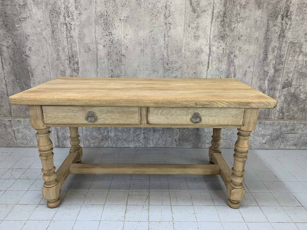 A classic French solid oak dining table that also works perfectly as a desk or kitchen table. The beautiful turned legs are solid and in wonderful condition. There are two drawers with the original drawer furniture. The texture to the wood is slightly rough to touch as the wood has been treated to remove layers of unsightly treatment. WE have simply waxed this wood and it is ready to mellow over the next 100 years. The table is strong sound and ready to use as it is.