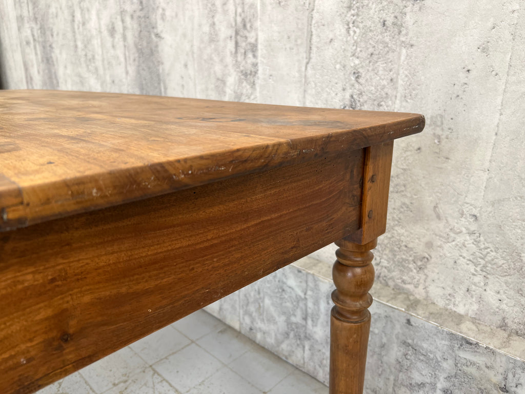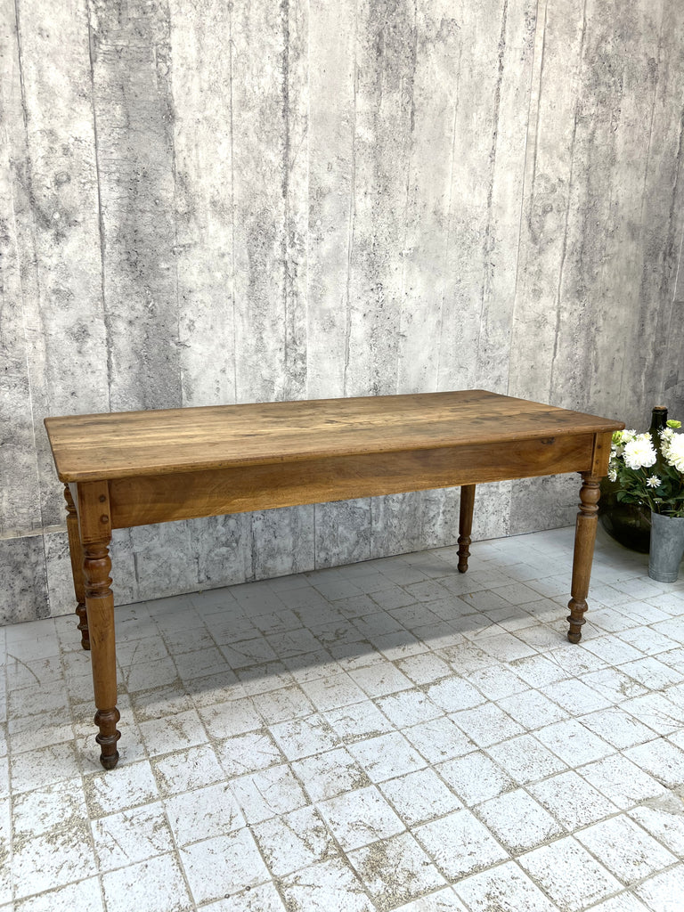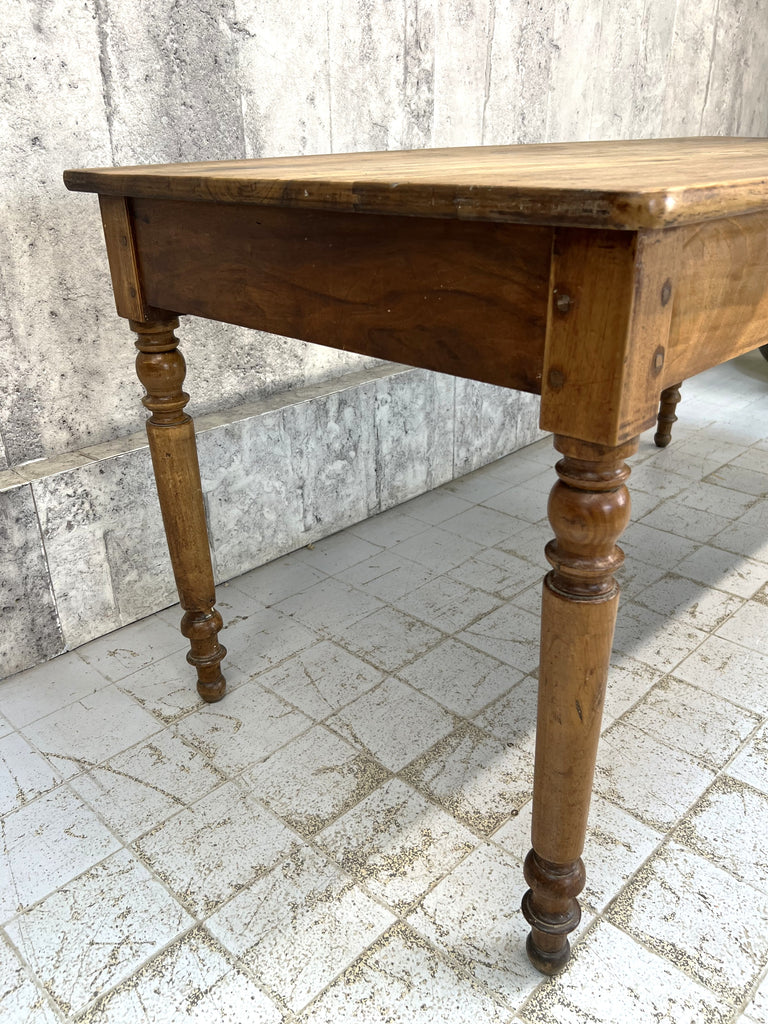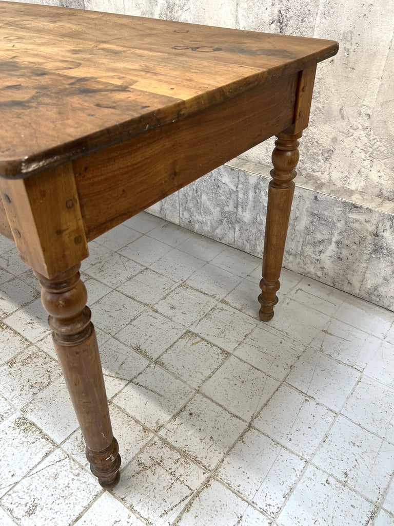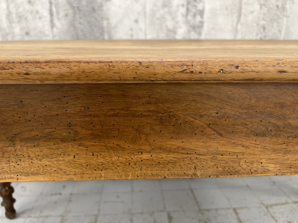 The wood is in lovely condition, with marks of previous use and as you can see old wood worm holes, which have been long vacated.  This table would work well in a kitchen or in a dining space.  Possible to fit up to 2 chairs along each side with 1 at the end, totaling 6 chairs or more bodies if you use benches.  Marry with modern or traditional chairs.  Ready to use as it is.
