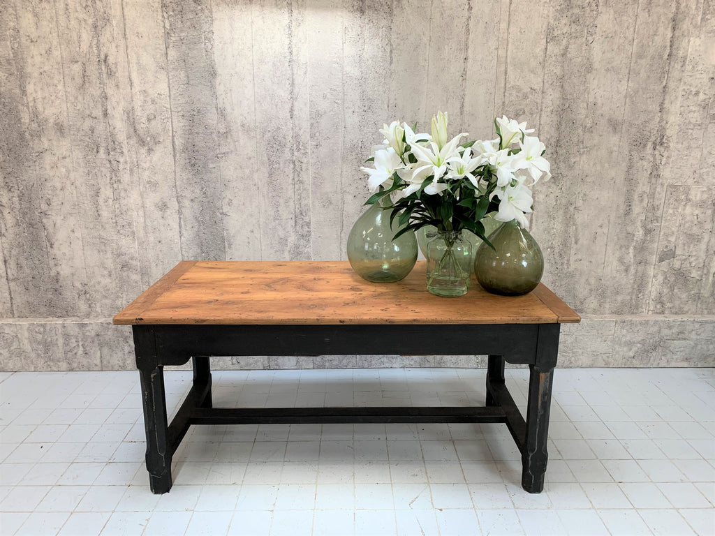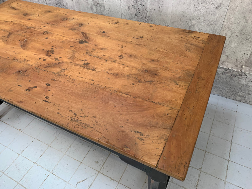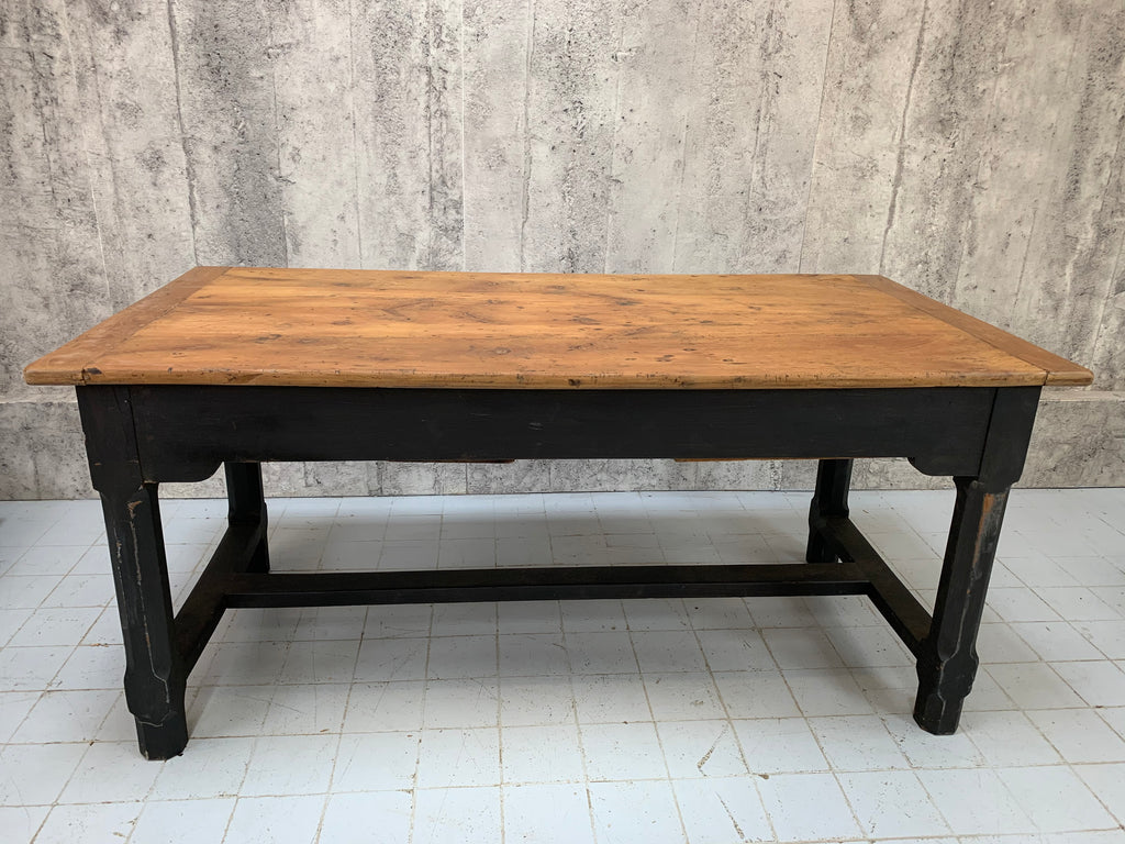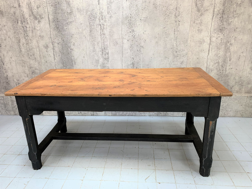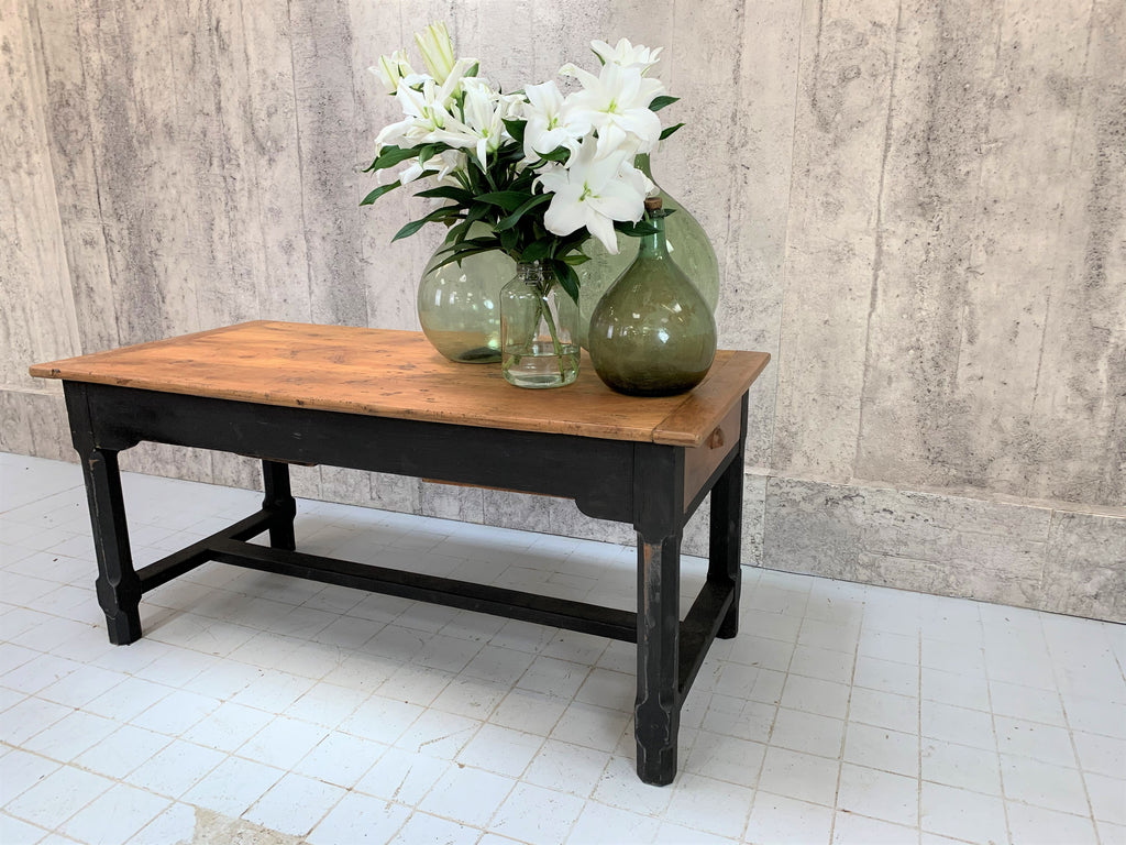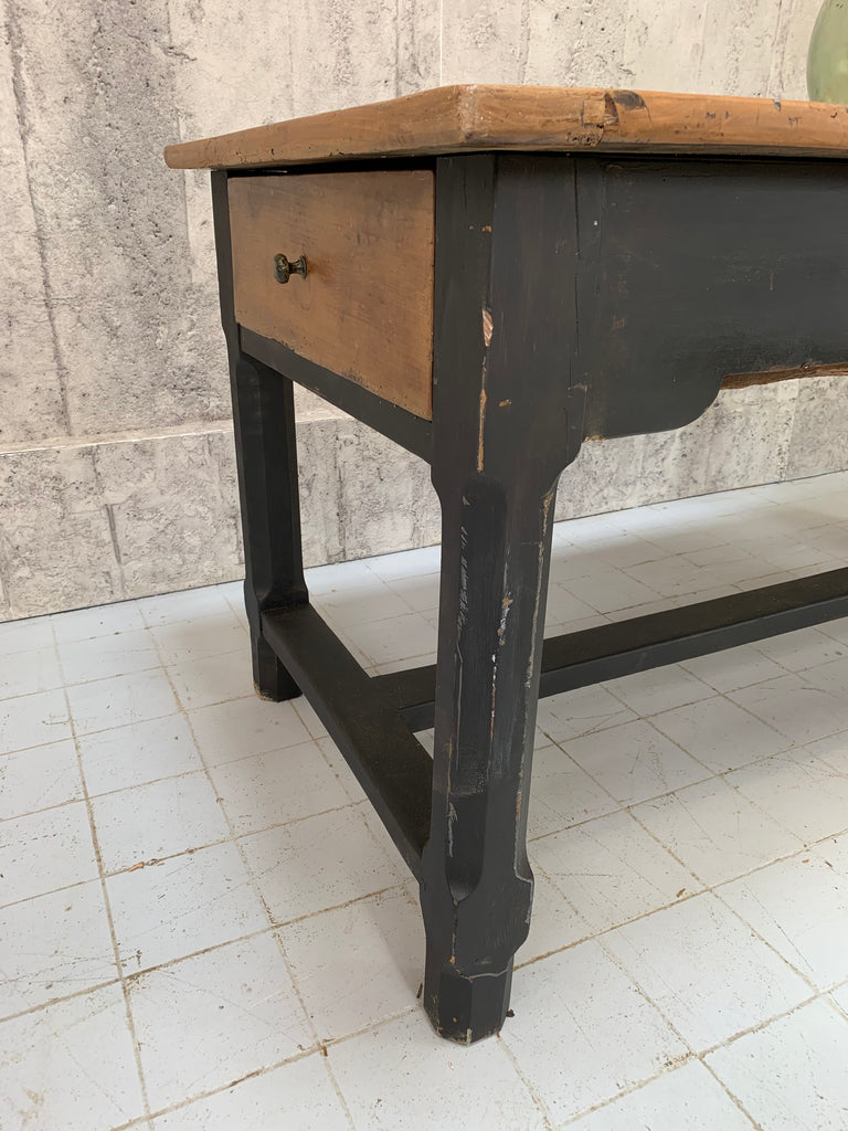 A rustic, solid pine dining table with two drawers. The legs have been painted black and waxed, to lovely effect, sort of shabby chic look.. the paint compliments the texture of the wood. In good condition, wear and tear as you would expect. Ready to use as it is.