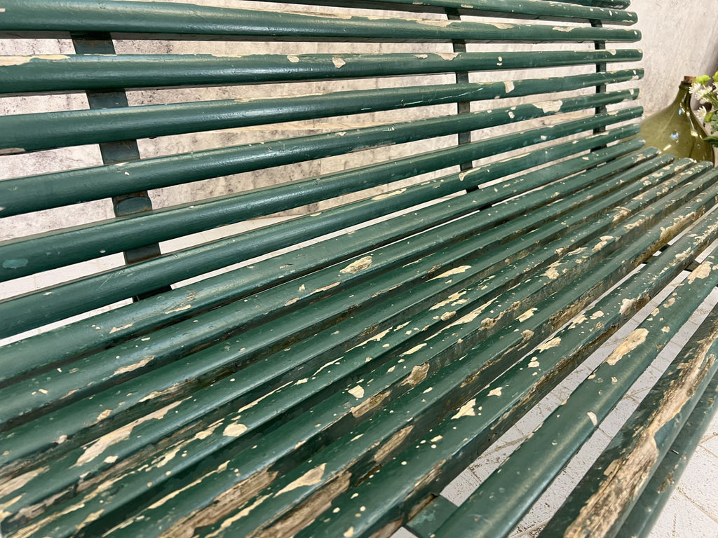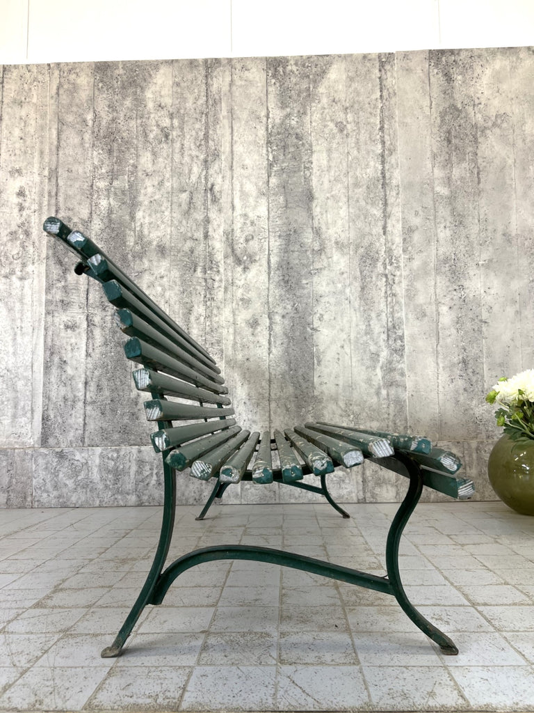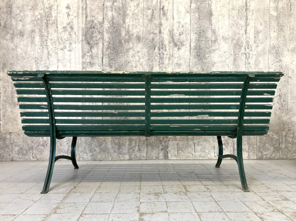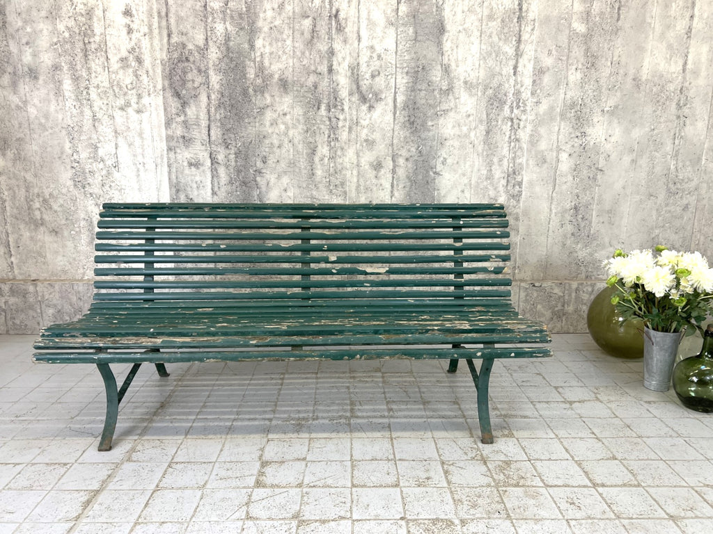 This simple garden bench, has lovely lines. The wooden slats are in good condition mounted on this simple metal base, which offers beautiful contours to the seat. Painted in dark green paint that has chipped off in places. Positioned in the garden, on a terrace or at an al fresco dining table, this bench is classic, simple and versatile.