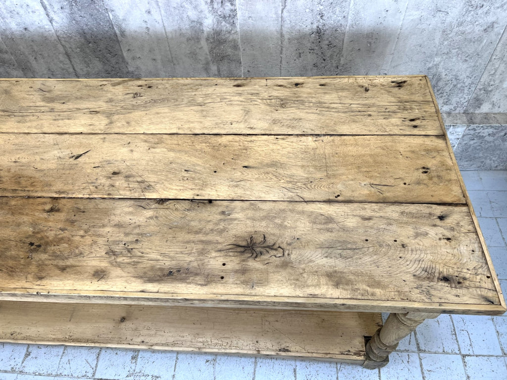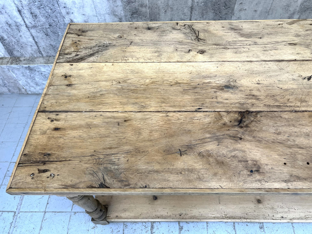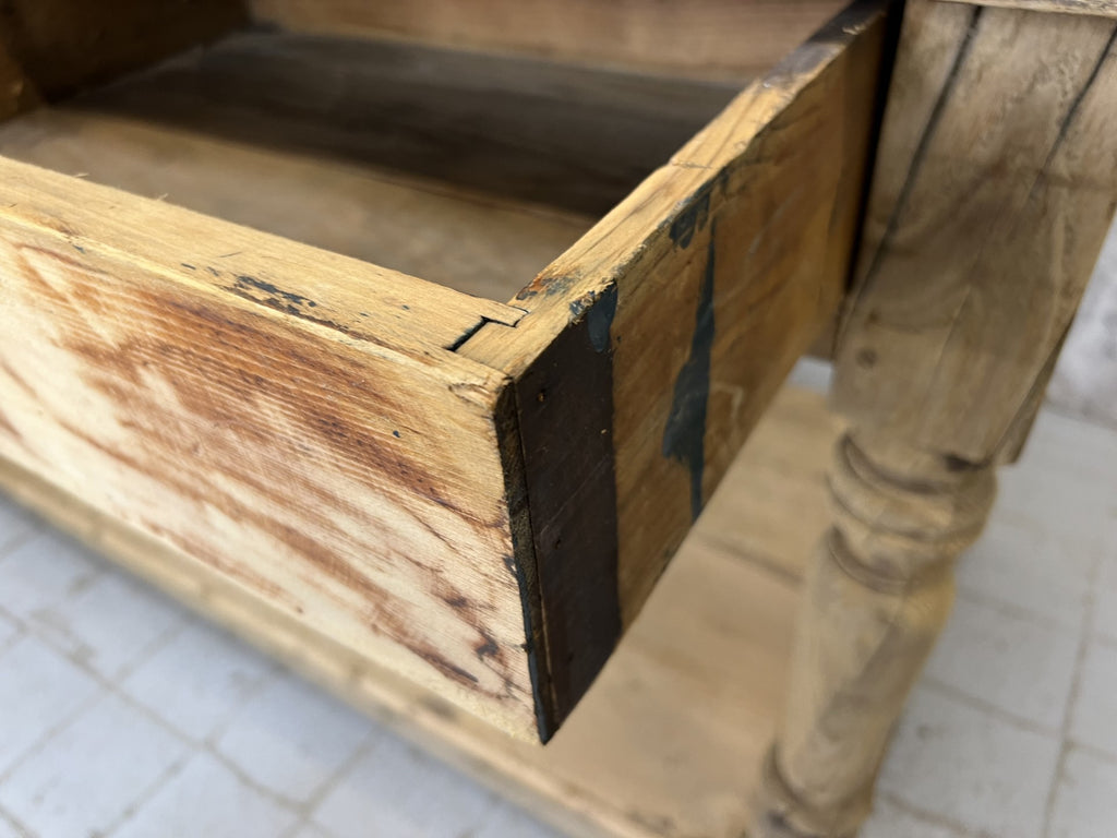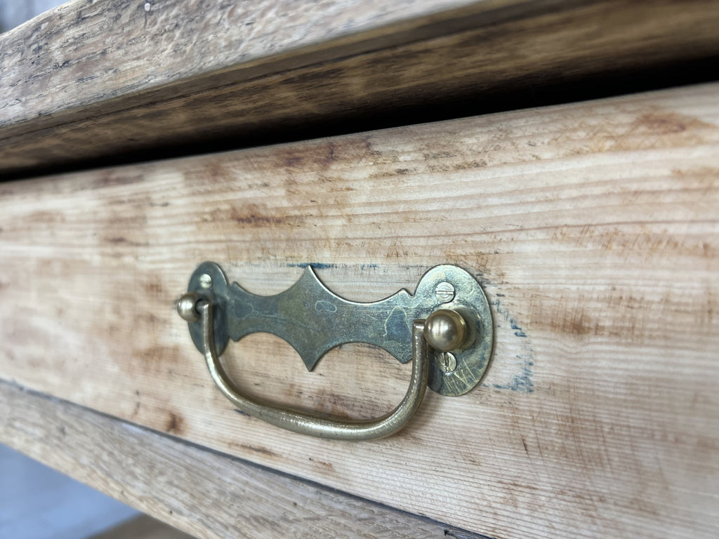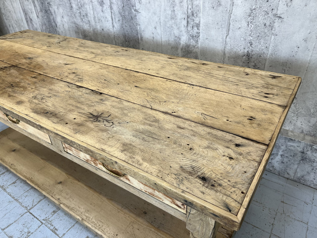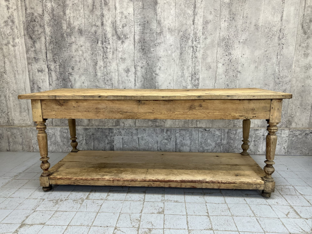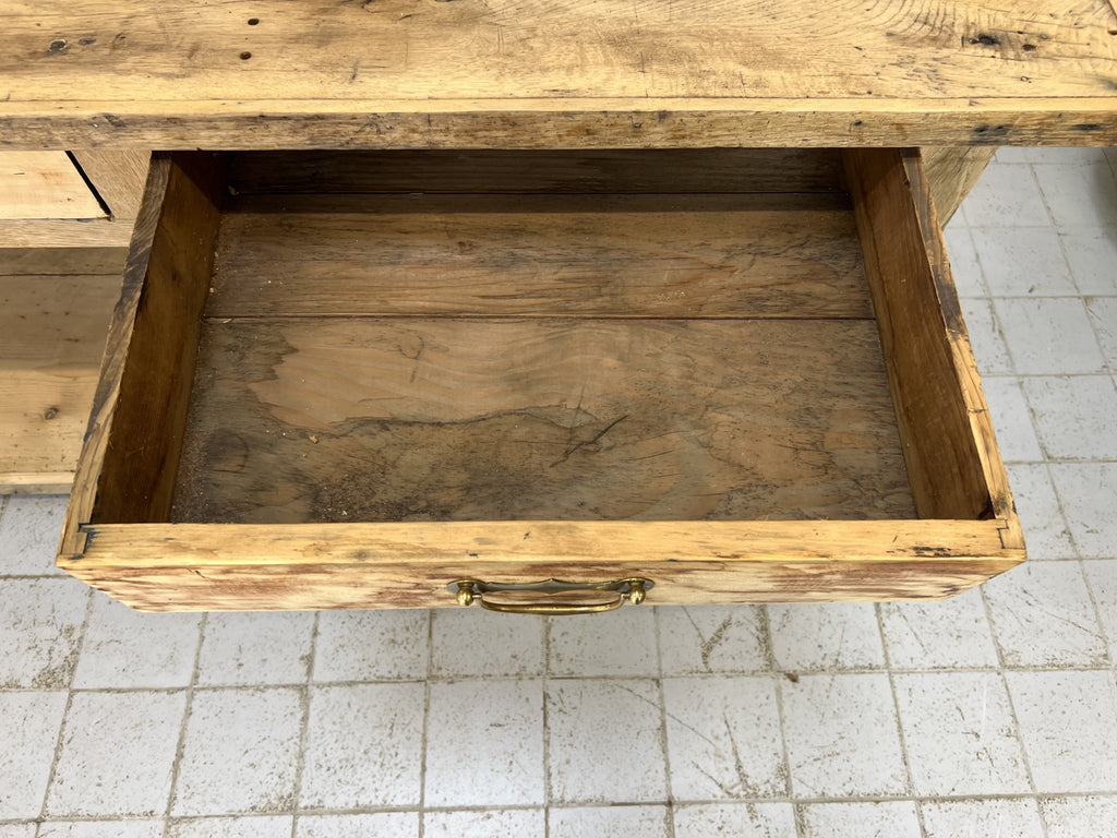 This an outstanding piece. It is made from solid wood and is heavy and as an old shop counter is suitable to use as a stand alone piece in the middle of a room, offering it up as a sideboard, work bench, kitchen island or as designed, as a shop counter. This fabulous Drapers Table was used in a fabric shop to lay out the fabric ahead of measuring and cutting and the middle drawer still has the beautiful bowls in which the cash pieces were stored. With wonderful solid and beautifully turned legs. Solid and strong. A fabulous find.