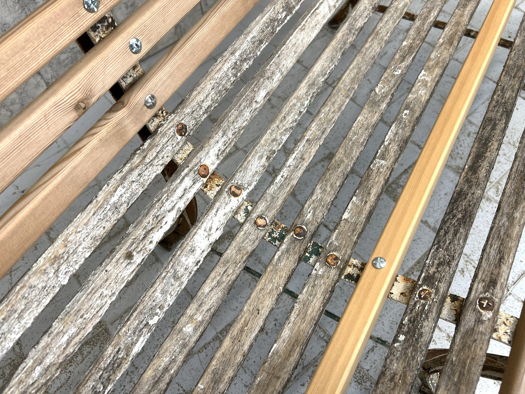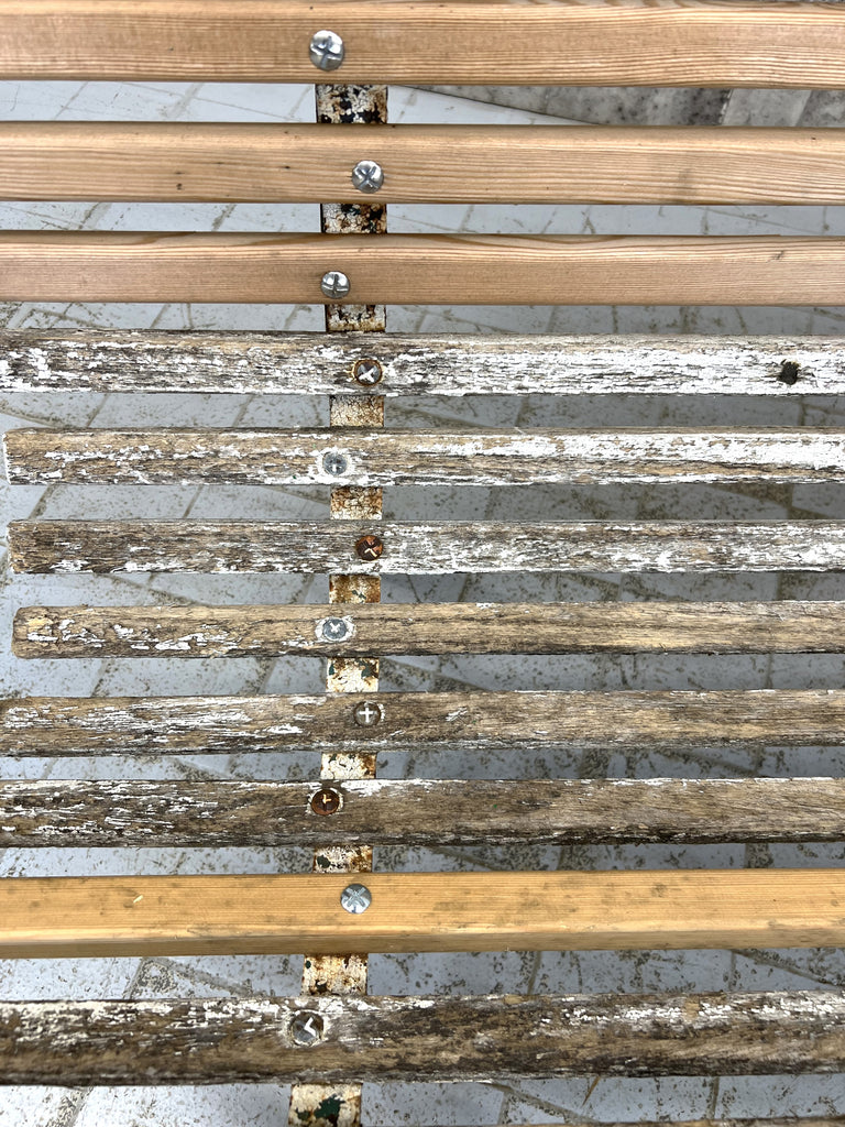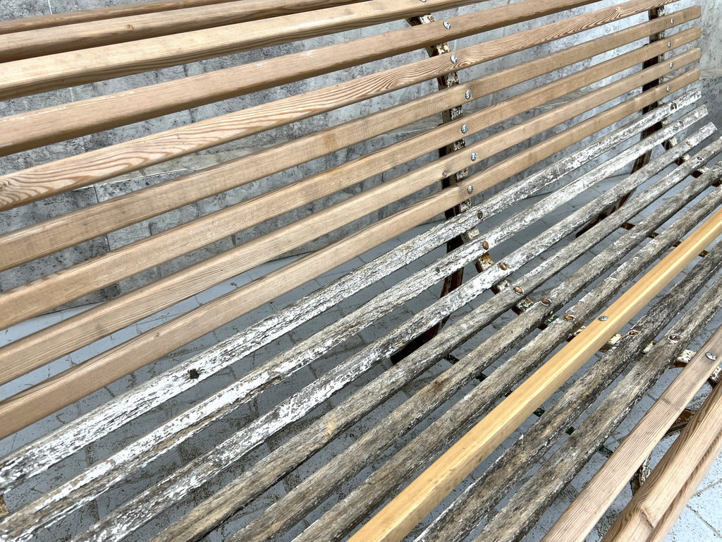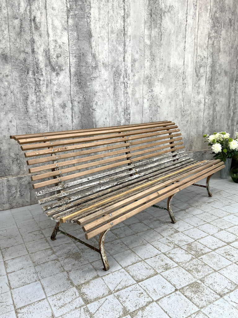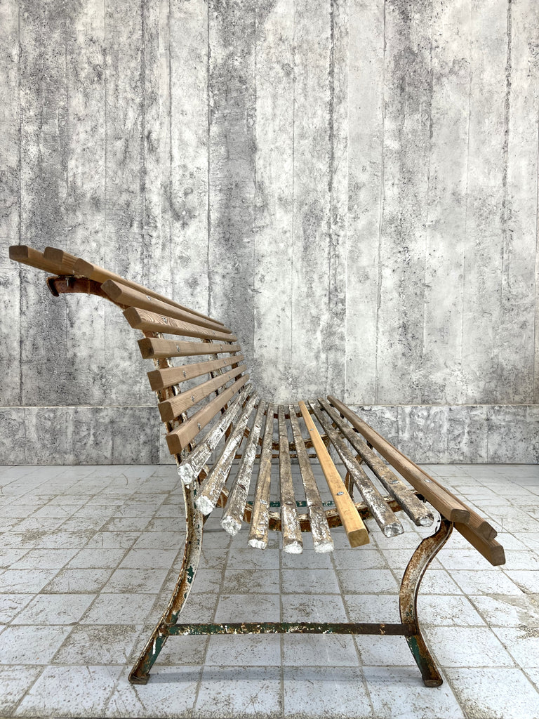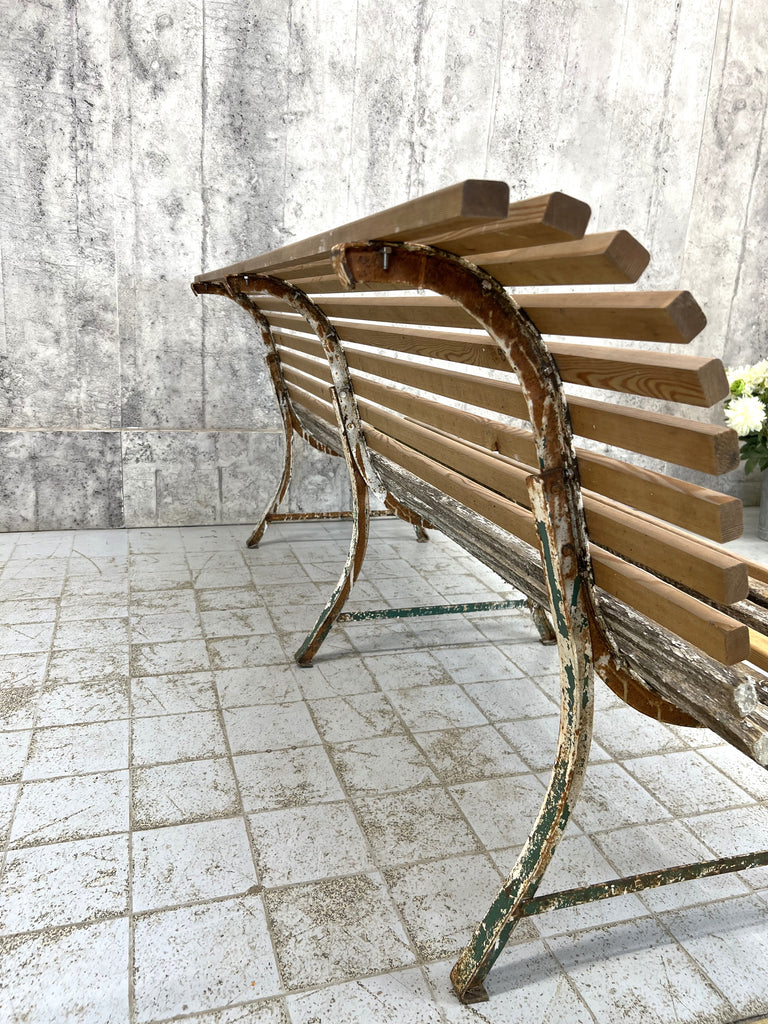 This simple garden bench, has lovely lines, is very comfortable and ready to use as it is. The wooden slats are in good condition mounted on this simple metal base, which offers beautiful contours to the seat. There is evidence that the wooden slats have been updated over the years, but each are solid.. some still have chippy paint on, some are untreaded and simply the natural wood. Positioned in the garden, on a terrace or at an al fresco dining table, this bench is classic, simple and versatile.