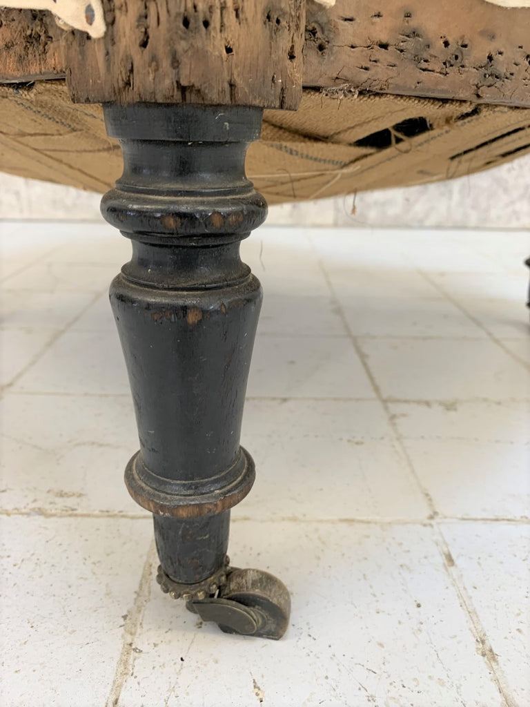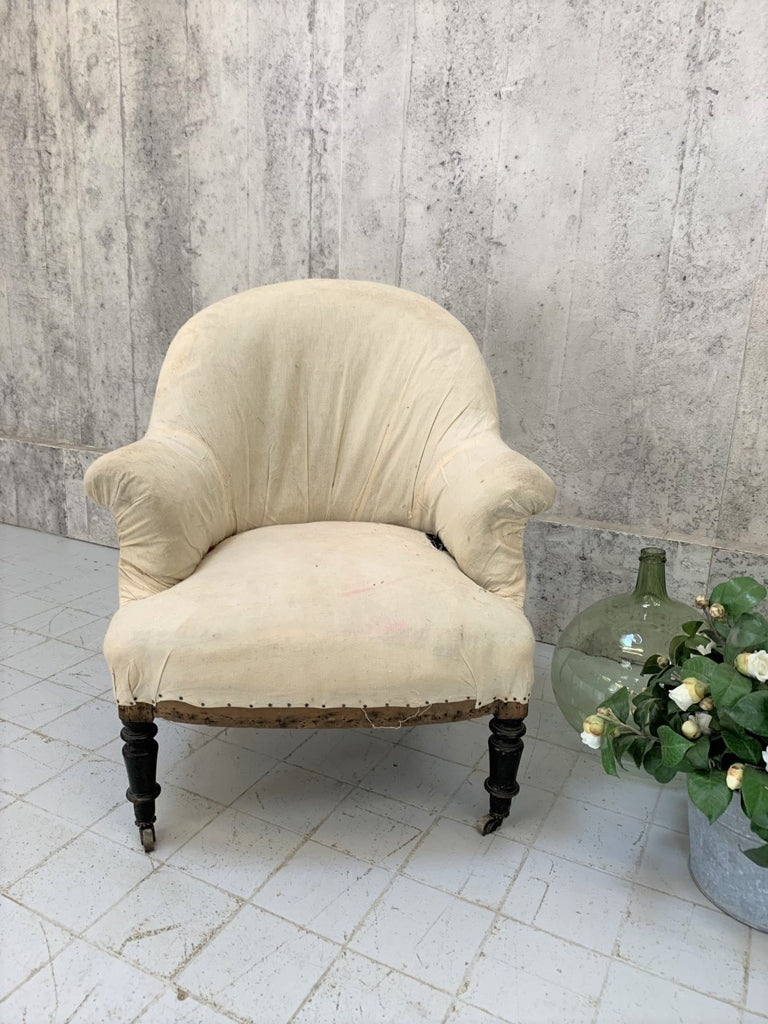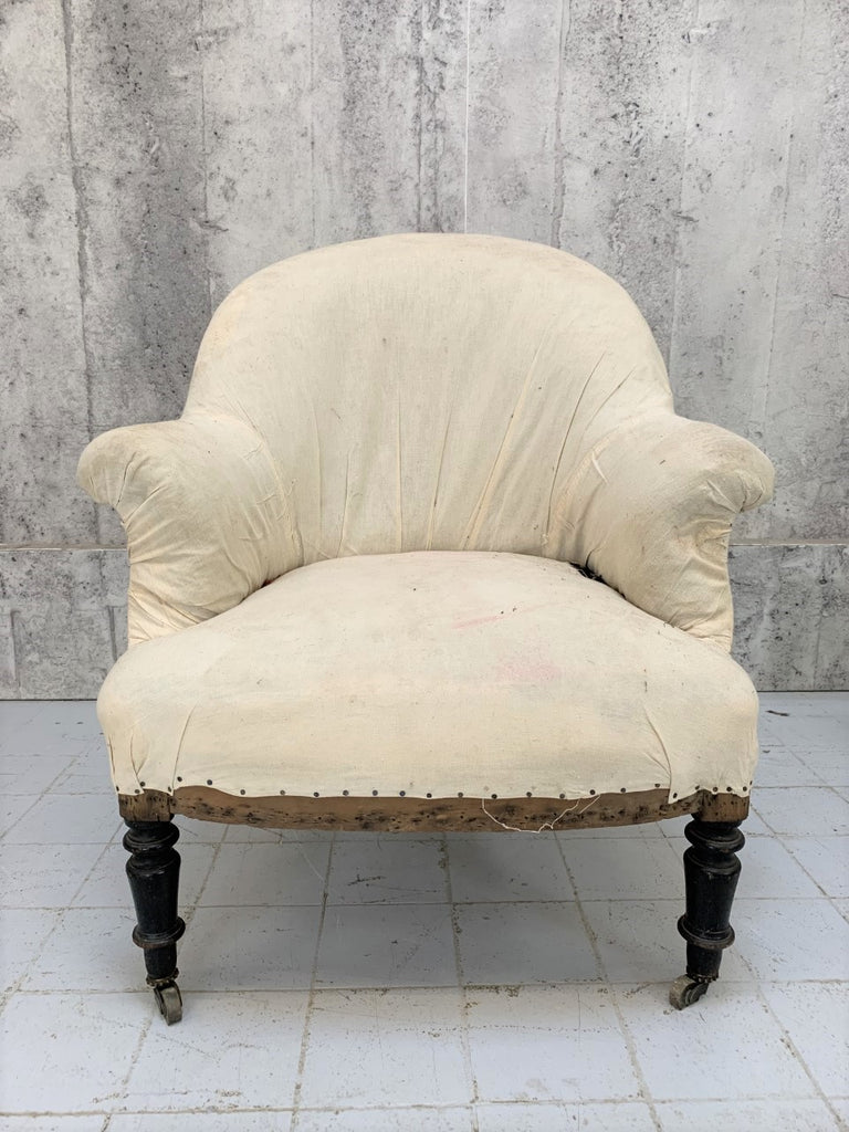 A beautiful, classic French style tub chair known in France as a 'Crapaud'...  'Toad'.  This beautiful example has very lovely turned front legs and elegantly splayed back legs, made from ebonised pear wood with the original wooden wheels.  The structure is sturdy, we have renovated the frame and it is now ready to cover in the fabric of your choice.