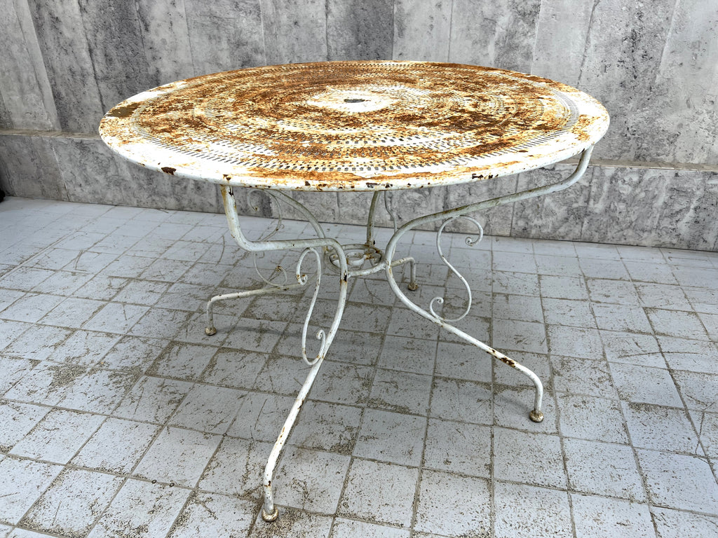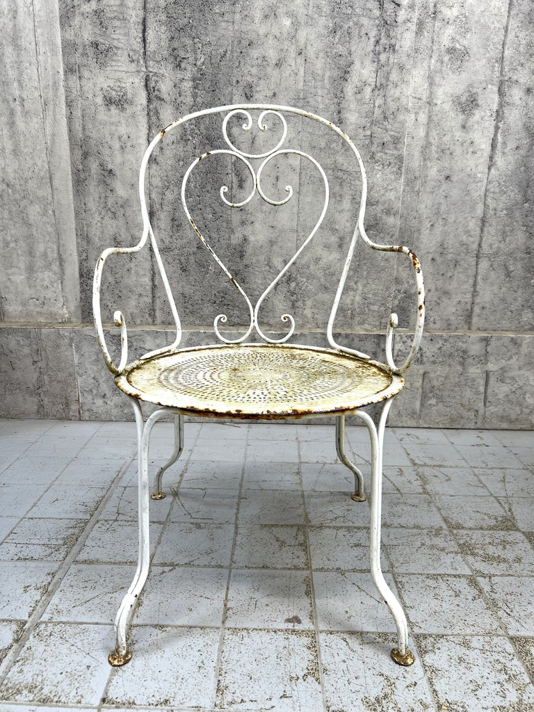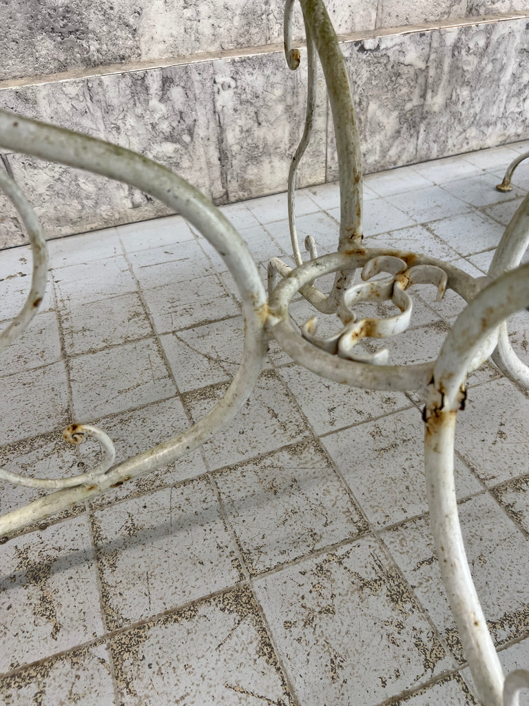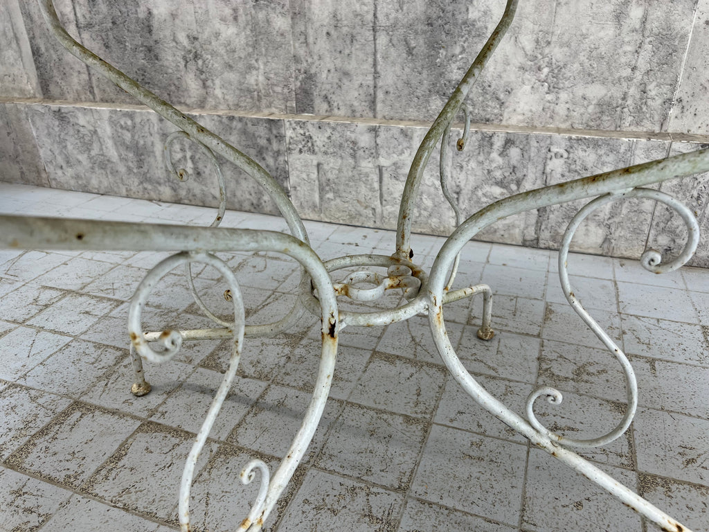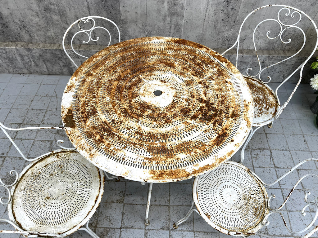 A very beautiful complete set of 2 matching chairs and carvers and its very pretty table. A lovely size to seat 4 people. A superficially rusty set which adds to the character of the piece. If the rusty look is your thing, I would be tempted to seal the rust with a clear matt varnish. The rust is not structural, just for decoration. A beautifully imperfect perfect set with a hole in the table for an umbrella too. In good structural condition. Sturdy and strong and ready to use as it is.