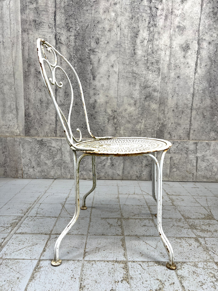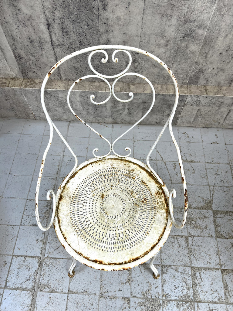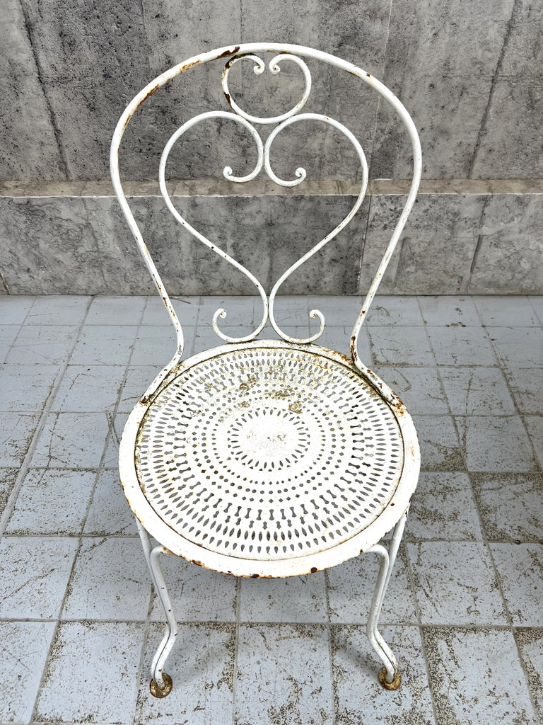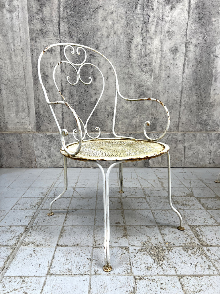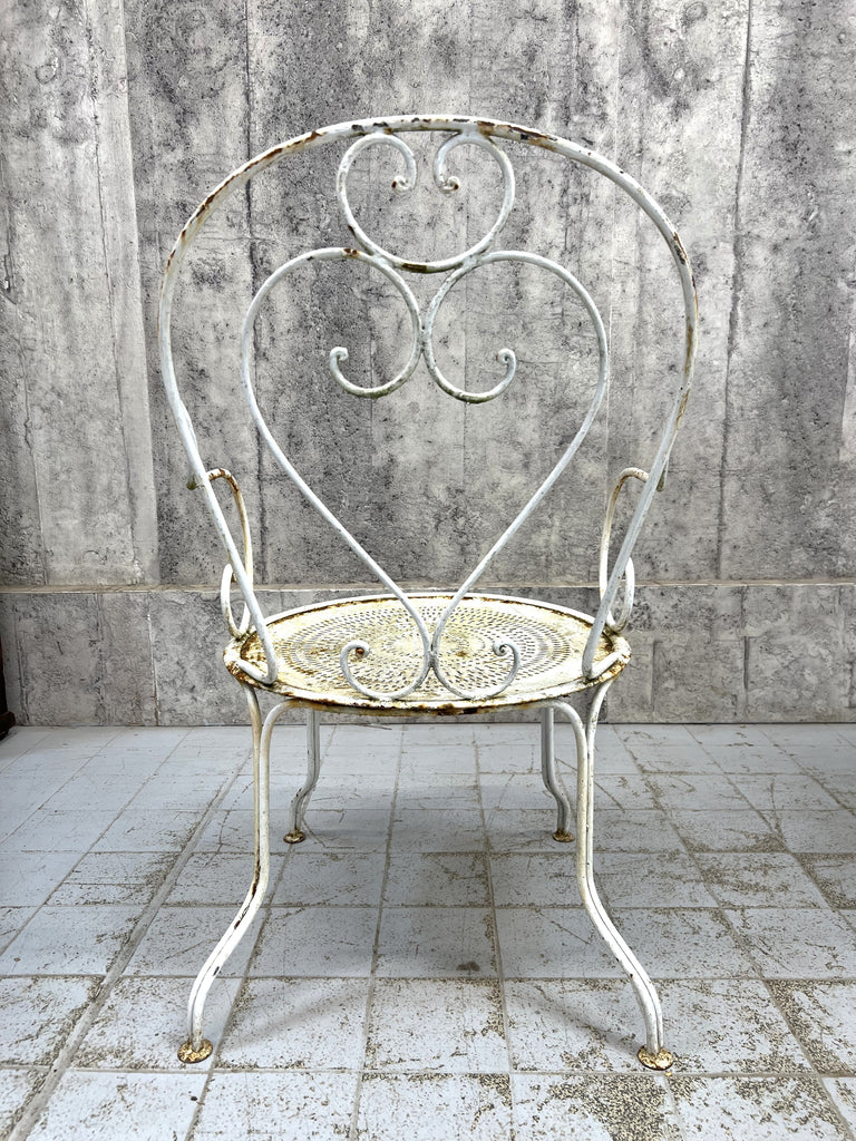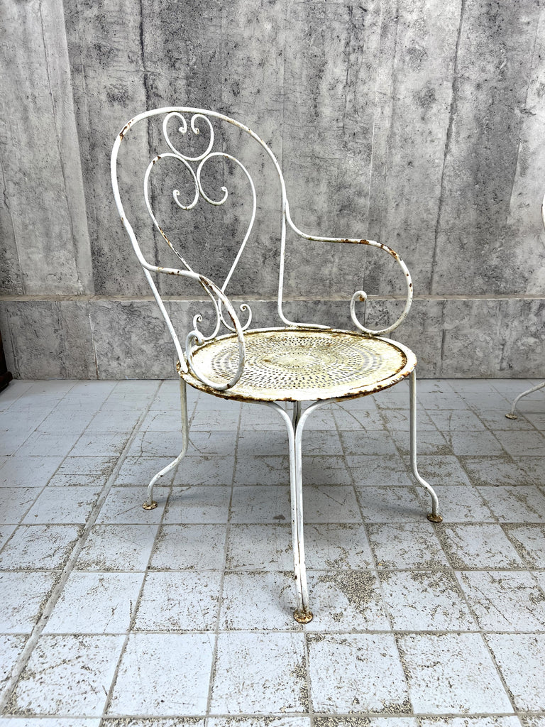 A very beautiful complete set of 2 matching chairs and carvers and its very pretty table. A lovely size to seat 4 people. A superficially rusty set which adds to the character of the piece. If the rusty look is your thing, I would be tempted to seal the rust with a clear matt varnish. The rust is not structural, just for decoration. A beautifully imperfect perfect set with a hole in the table for an umbrella too. In good structural condition. Sturdy and strong and ready to use as it is.