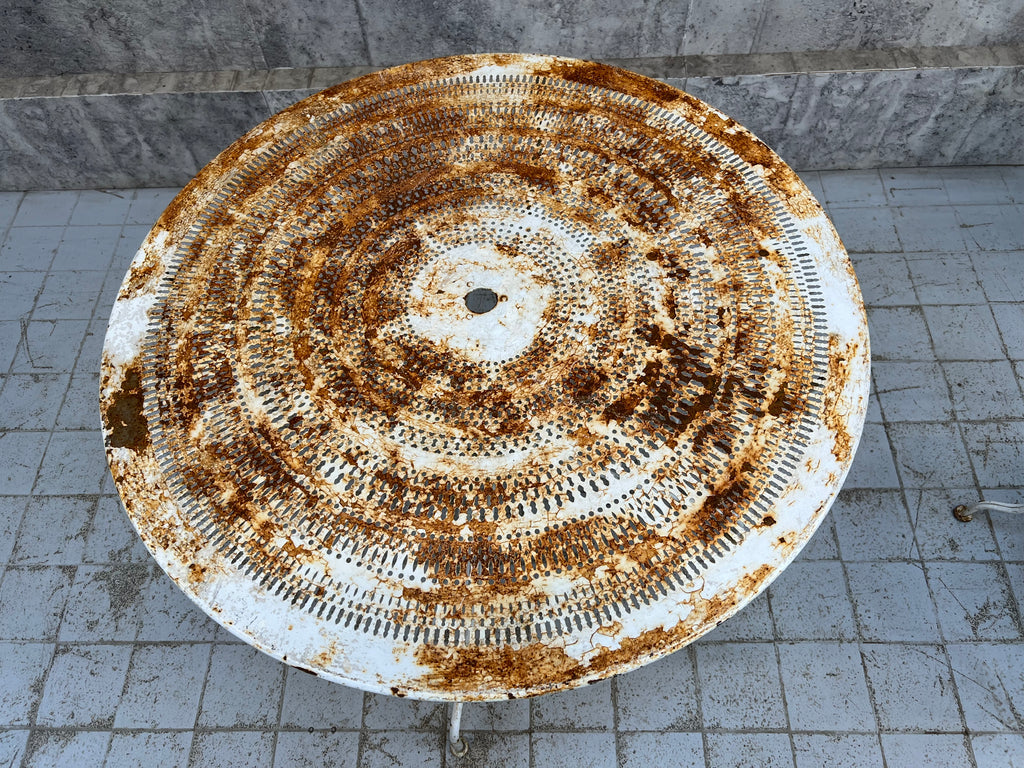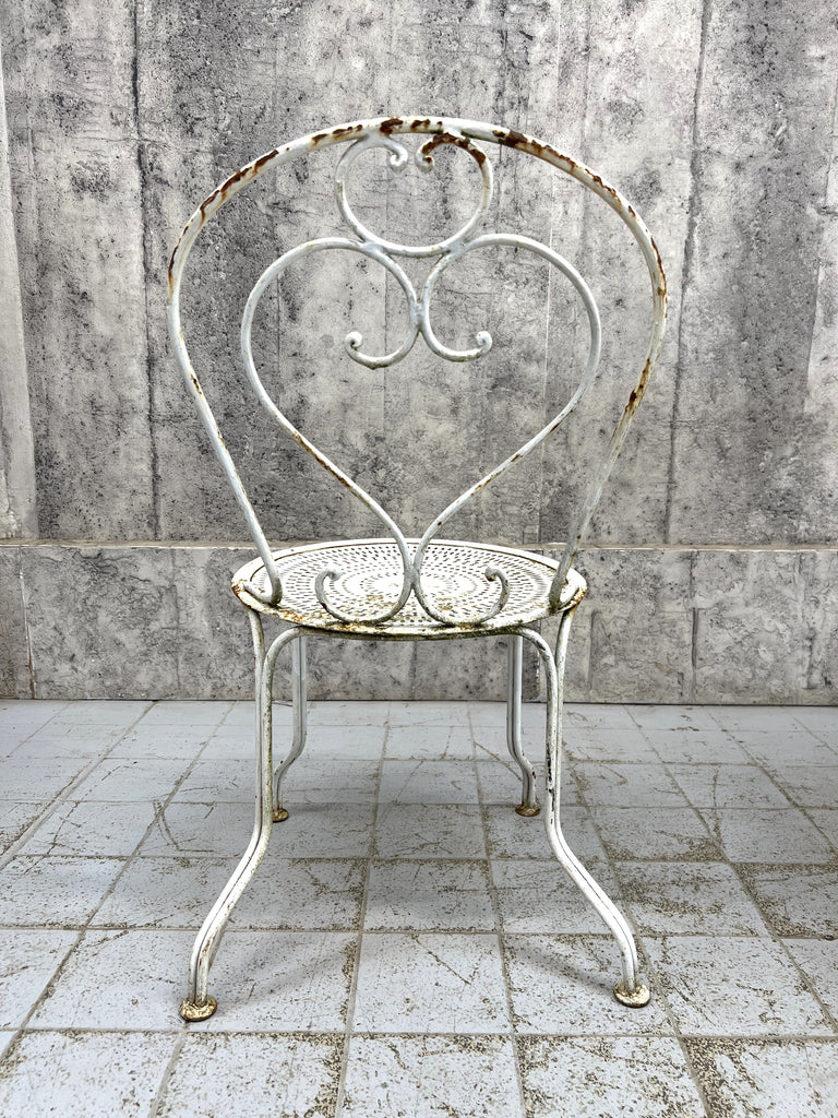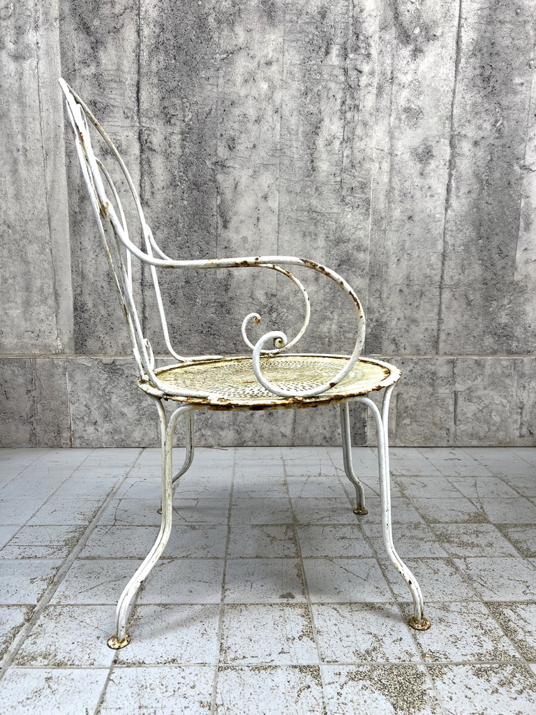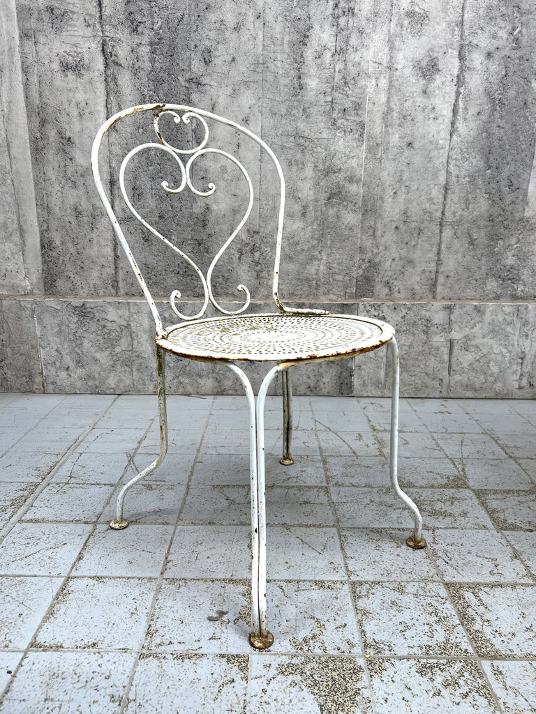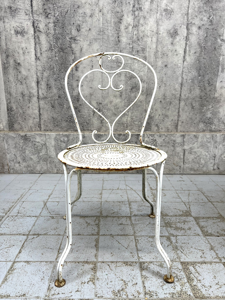 A very beautiful complete set of 2 matching chairs and carvers and its very pretty table. A lovely size to seat 4 people. A superficially rusty set which adds to the character of the piece. If the rusty look is your thing, I would be tempted to seal the rust with a clear matt varnish. The rust is not structural, just for decoration. A beautifully imperfect perfect set with a hole in the table for an umbrella too. In good structural condition. Sturdy and strong and ready to use as it is.