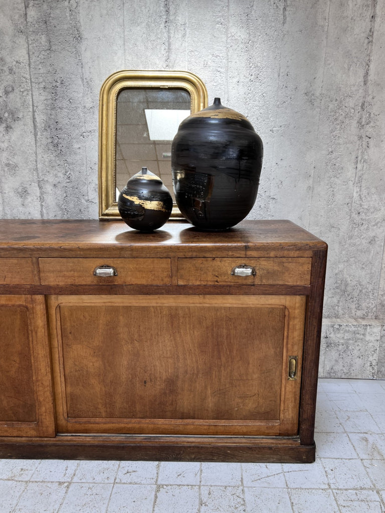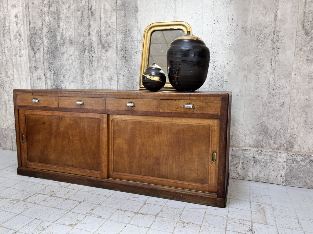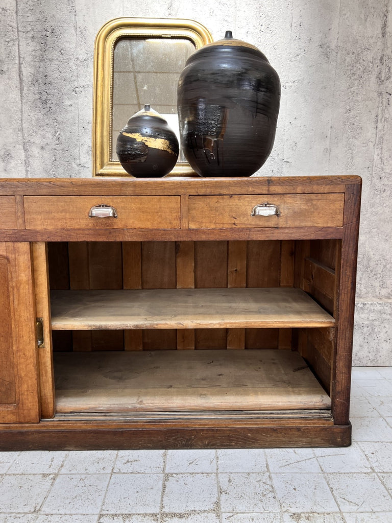 The center piece to your space: dining room, and entrance way, a shop, a restaurant, hotel, bar, even child's bedroom or playroom. I would love to see this also in a kitchen as a kitchen island as the back is finished beautifully to be able to sit in the middle of the room. The doors slide open on rails. I have a piece just like this in my own office. A simple, versatile piece.
