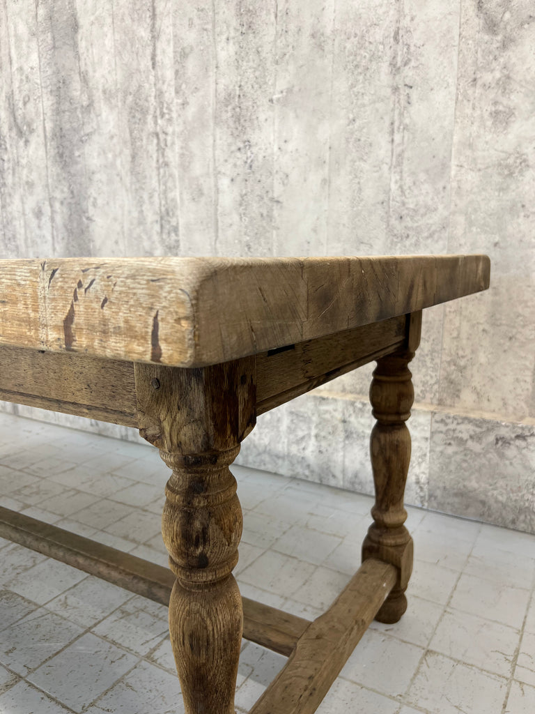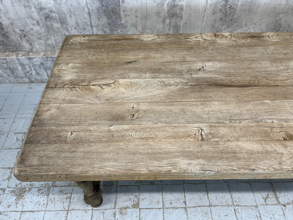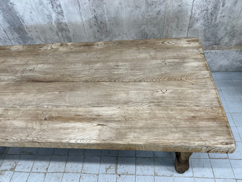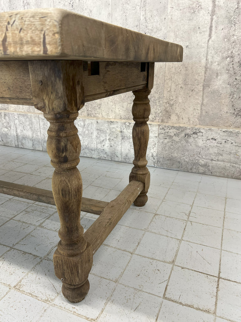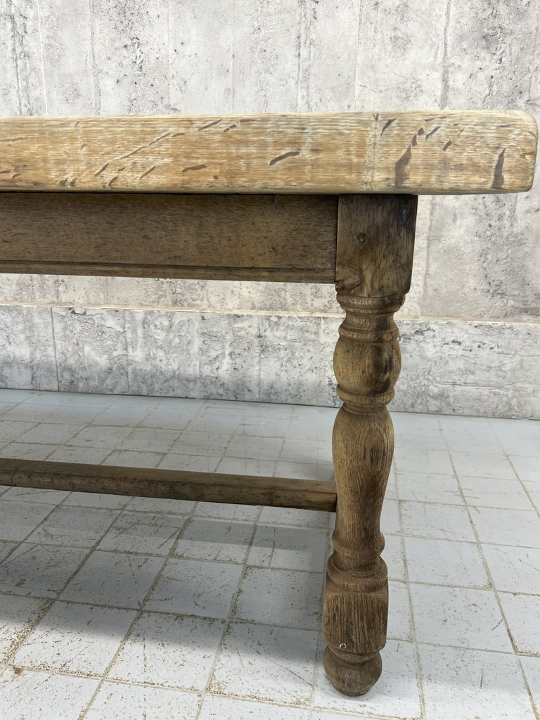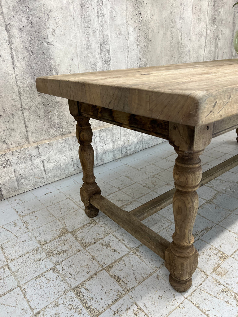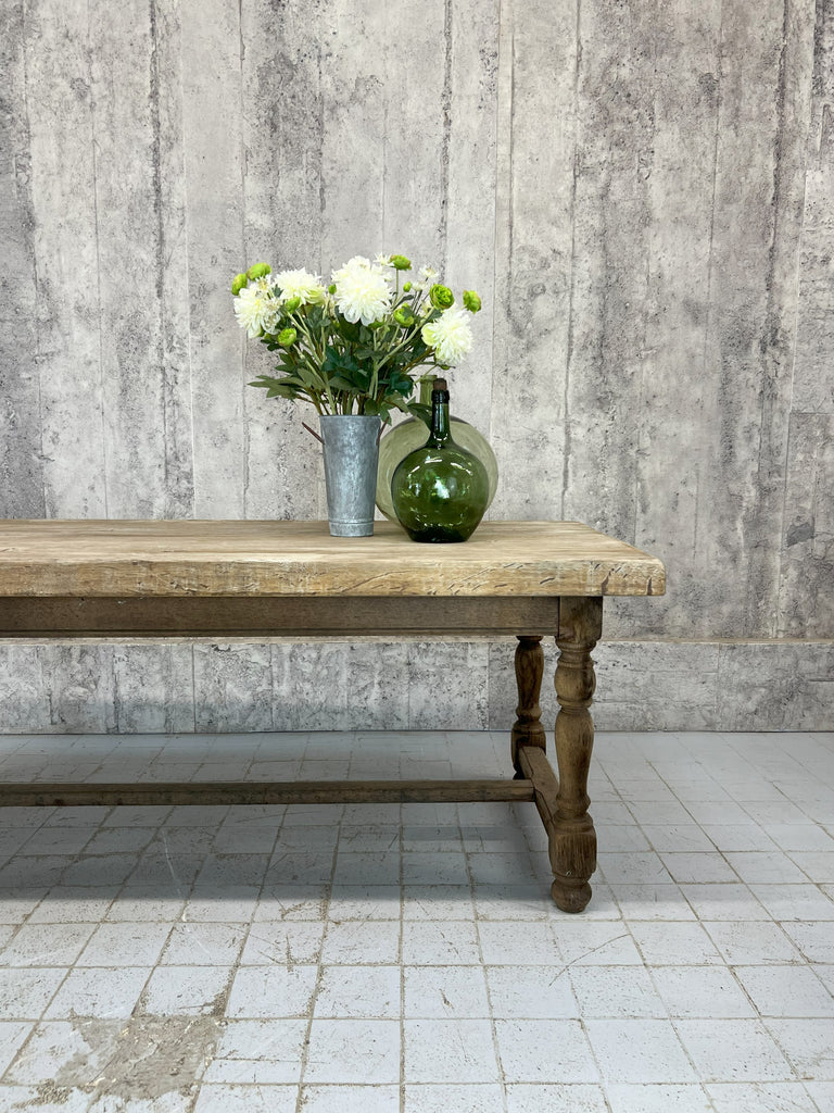 This is a classic rustic stripped French Farmhouse table, with strong turned legs with a stretcher, perfect for use in a modern kitchen or dining room. Ready to use as it is, or it is possible to treat the wood to match your scheme. The solid oak has this beautiful silver patina to it and the table top is sperate to the base... just as well as the top is a whopping 6.5cm deep and weighs a ton. This also help get this large table through smaller spaces. Ready to use as it is. Able to seat upto 10 comfortably. Sturdy, simple, solid. Classic.
