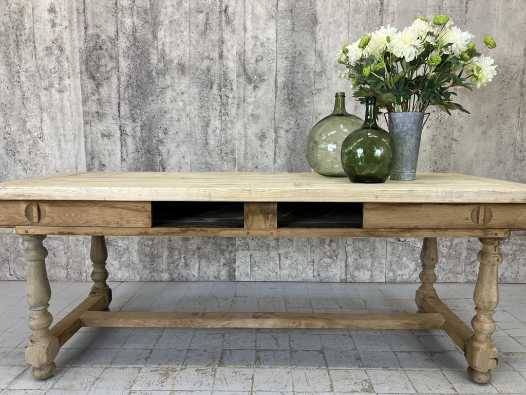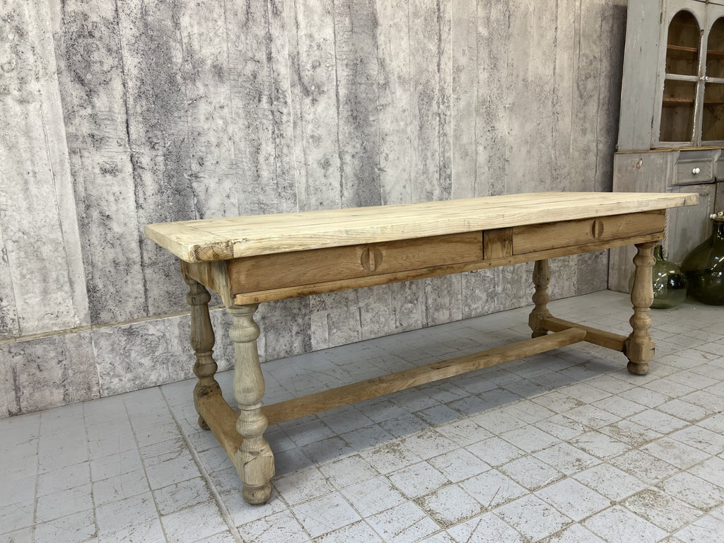 This is a classic French Farmhouse table, with strong turned legs, perfect for use in a modern kitchen or dining room. From the Burgandy region of France with the typical Baguette compartment underneath the table top, with the sliding doors. Ready to use as it is, or it is possible to treat the wood to match your scheme. Sturdy, simple, solid. Classic.
