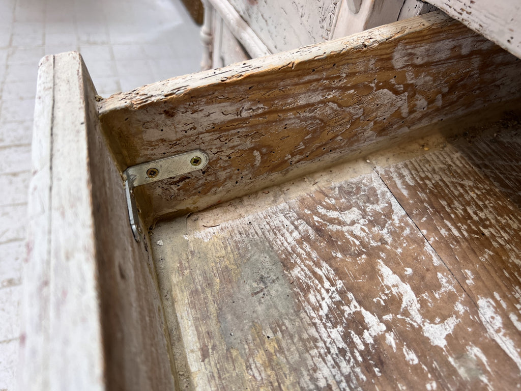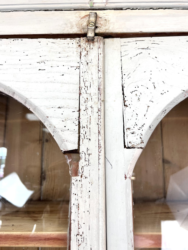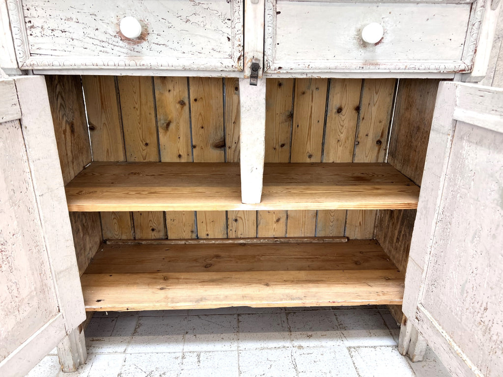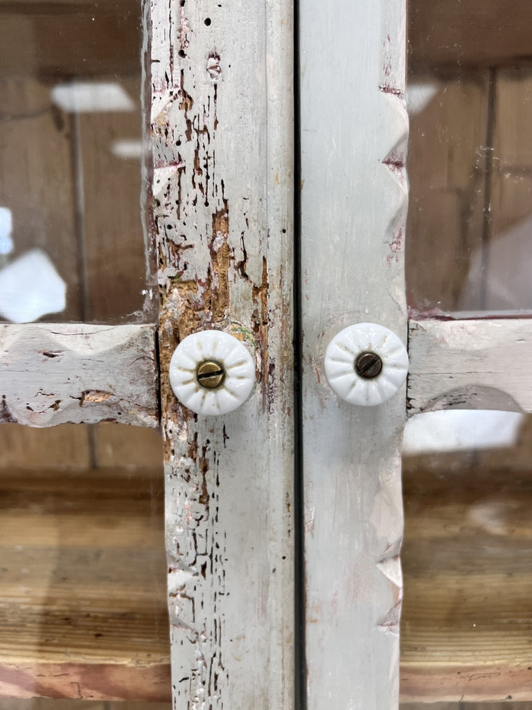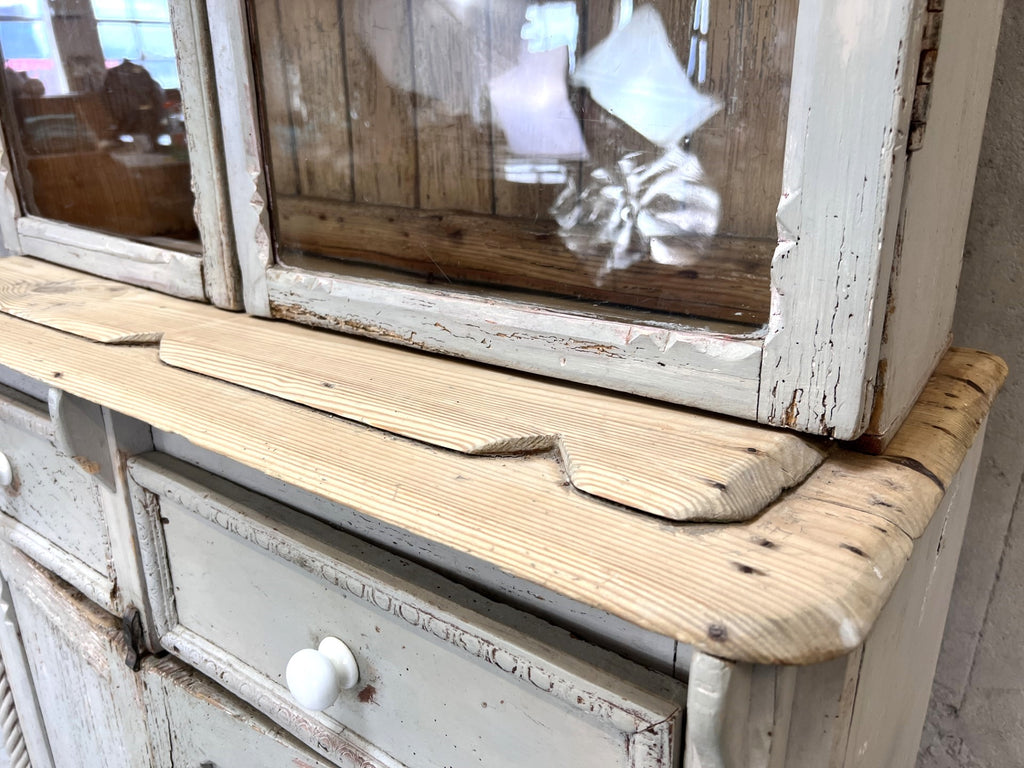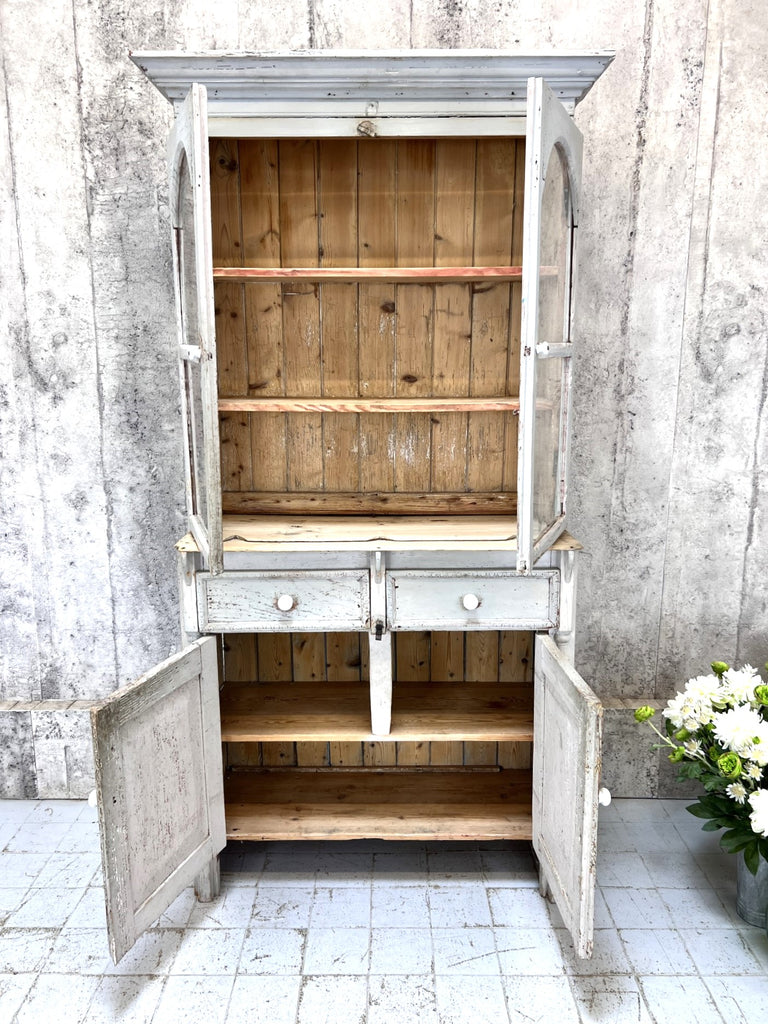 This is a Great Grandmother of shabby chic. Made out of previously used wood, with 100 year old infestation marks (long long passed), this fabulous piece is the very definition of Shabby Chic. The infestation marks, the paint over laid on a previous layer, the delicate nature of the doors and fixings, the smell, slightly fusty, the more recent fixes, bashes and bruises. A much sought after and fabulous piece if shabby chic is your style. Ready to use as it is. This is a unique, striking, elegant and characterful piece.