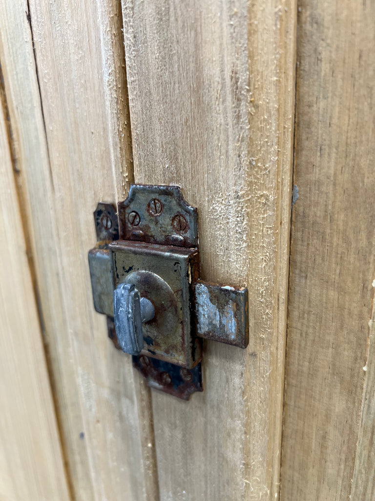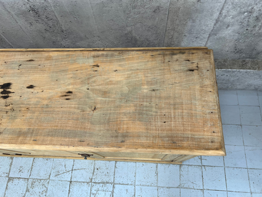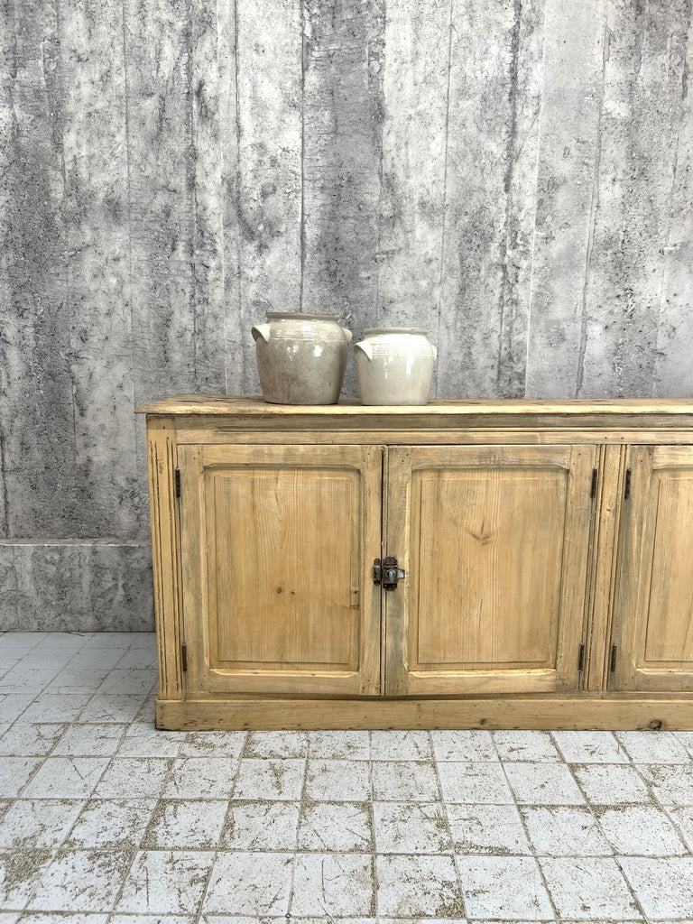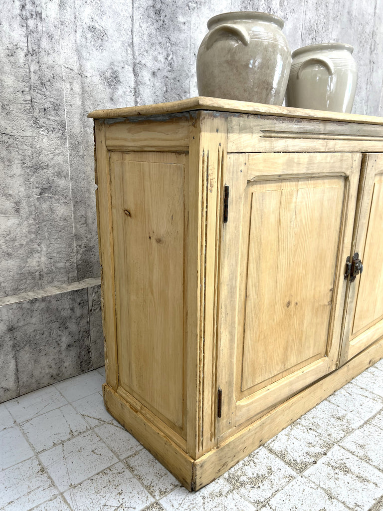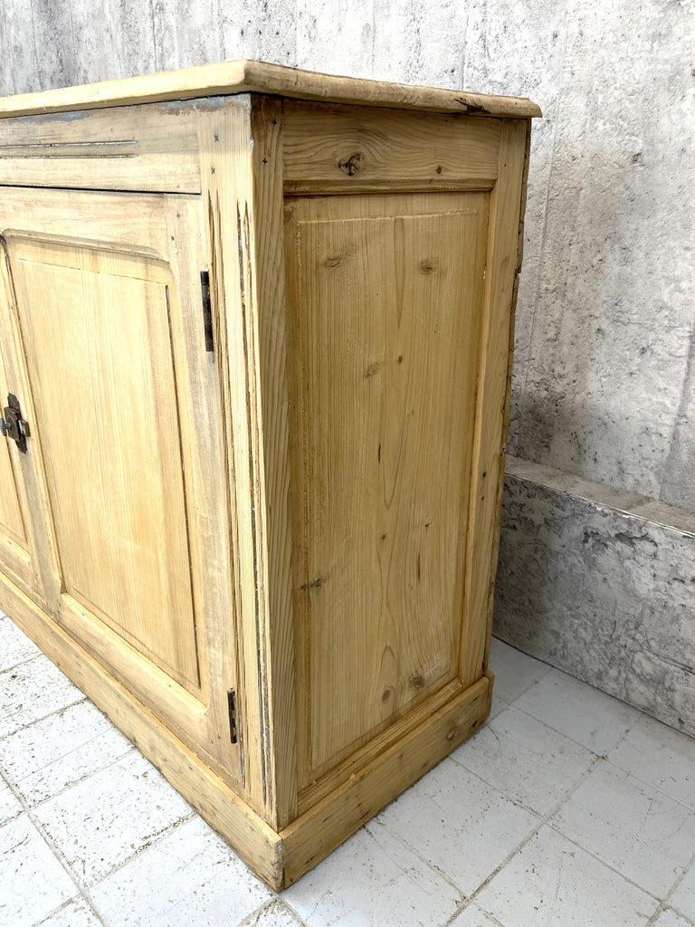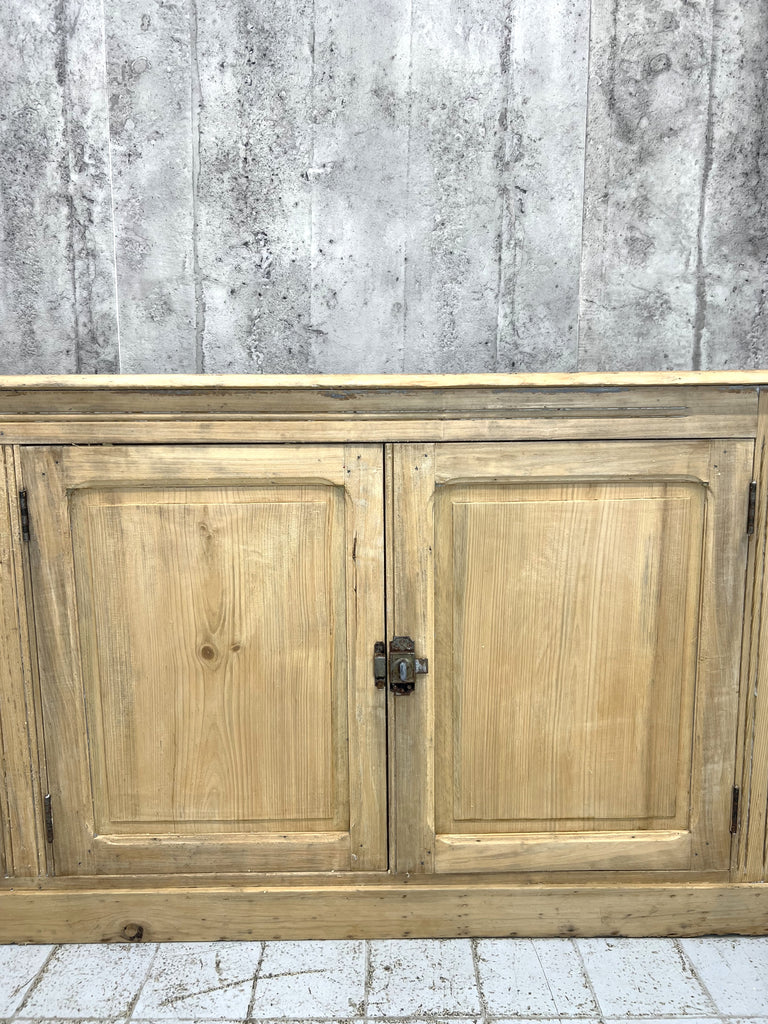 This wonderful rustic pine sideboard is practical, neat and simple. There are two double doors opening to shelves and due to the narrow depth, this piece stores so much whilst taking up such a small foot print. These would make the perfect bedroom storage, sideboard or kitchen cupboard. Has all the original drawer furniture has been recently renovated so is in great ready to use condition. The usual bumps and bashes as you would expect from a piece of this age.