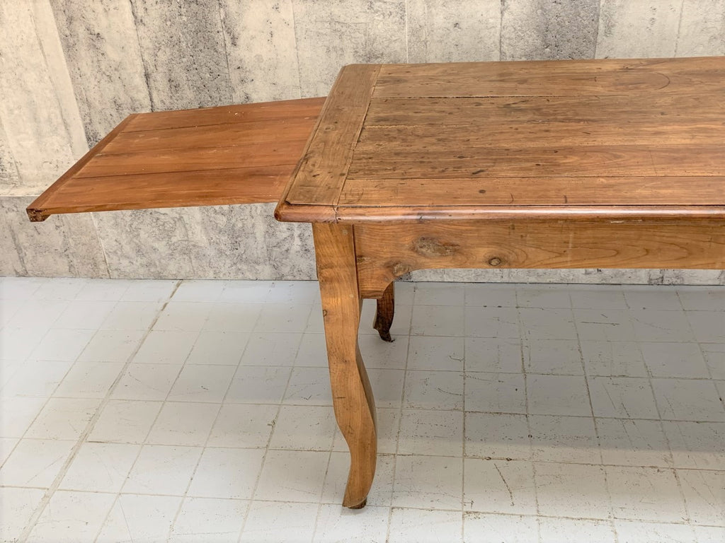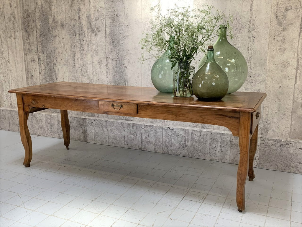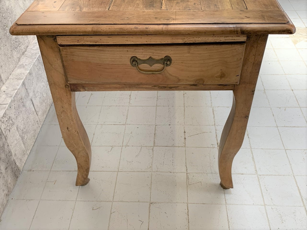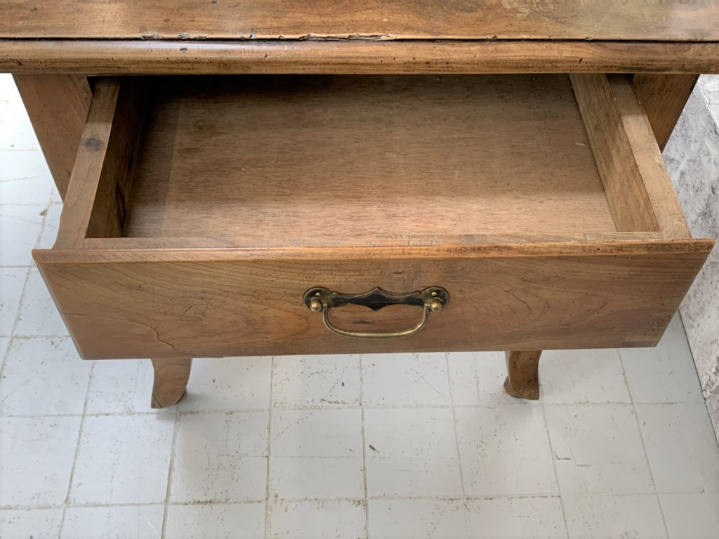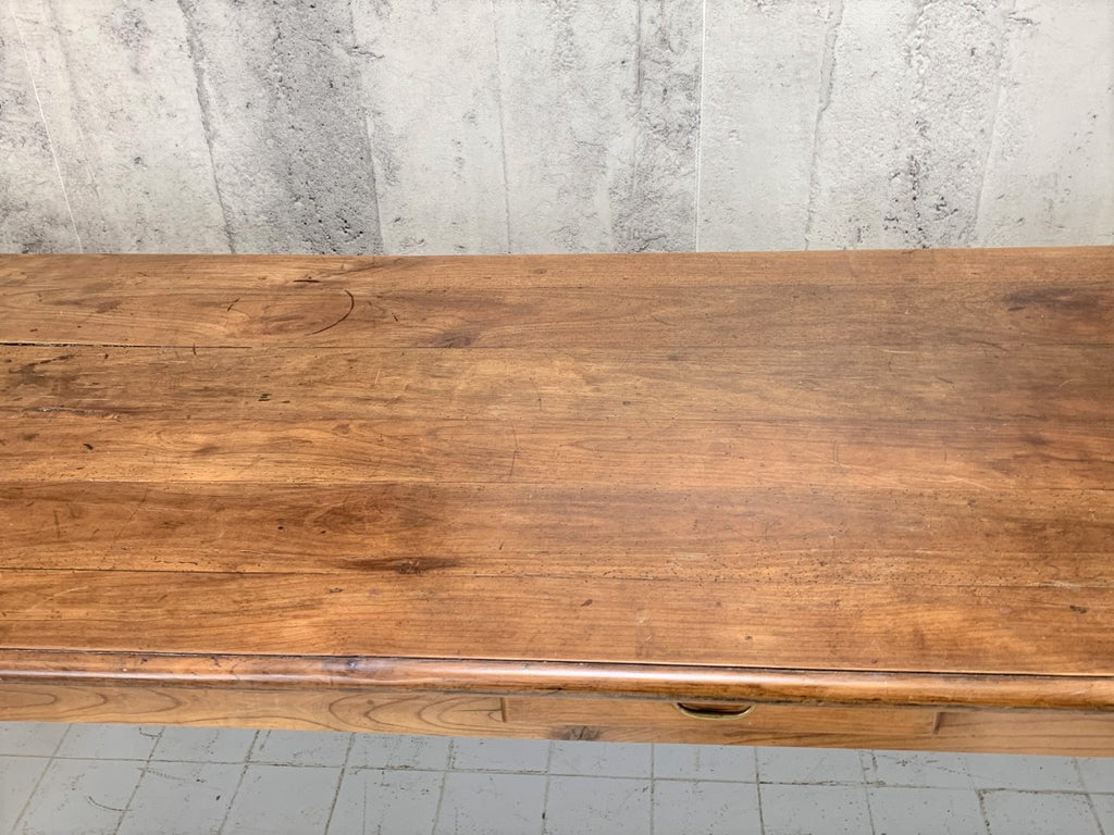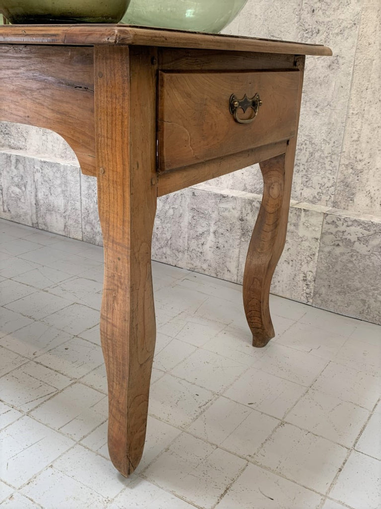 This is a solid, handmade table used for serving or as a console table. The legs are a very unusual and more modern take on the characteristic Louis XIV style. Only in France would you have an extension to your table designed simply for cutting your bread.. yet here it is.. The table is really slightly too short to be a dining table unless you have relatively low chairs or no plus 5'5" people in your family The drawers underneath the table fall a little low, so we are selling this as a serving or console table. This would be such a beautiful addition to a dining room or as a sideboard. In wonderful worn condition where the wear to the wood has mellowed and matured the colour.. rich stunning table. There is evidence of old woodworm, but these have departed long ago.