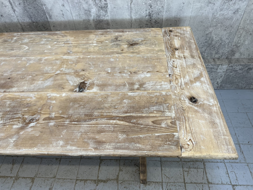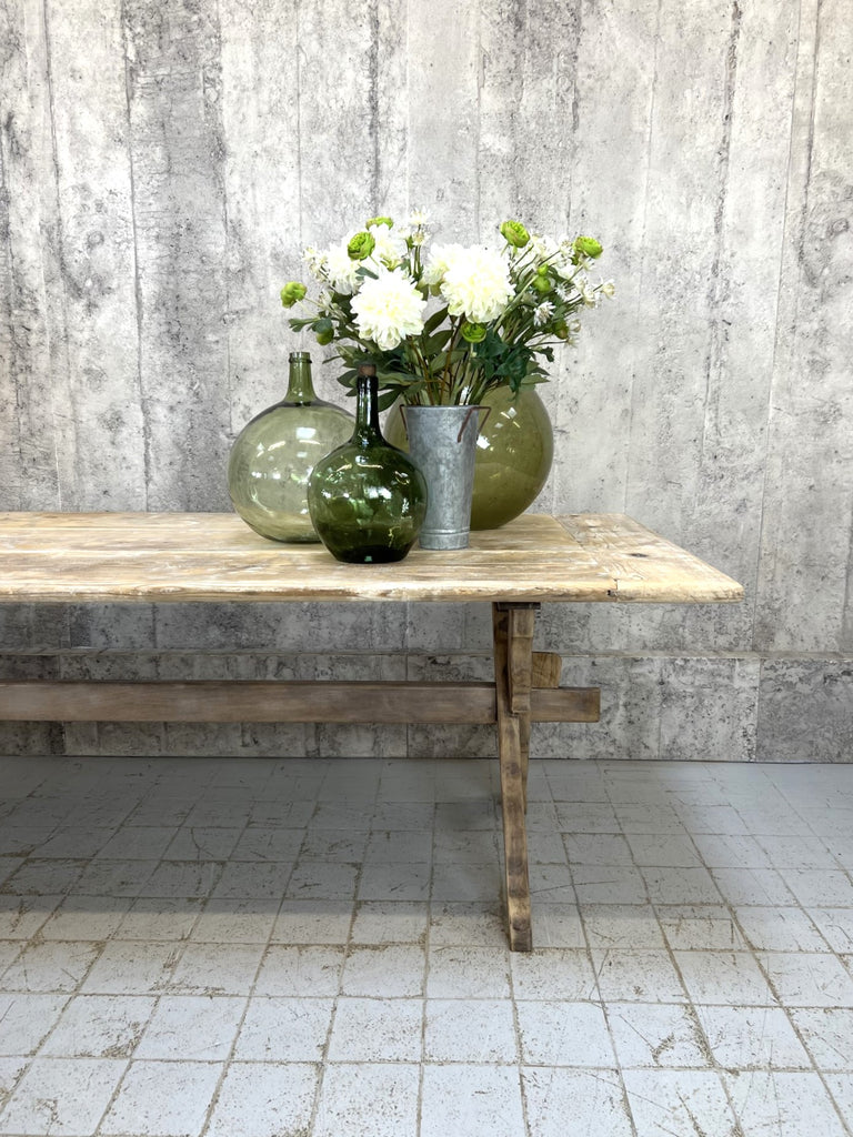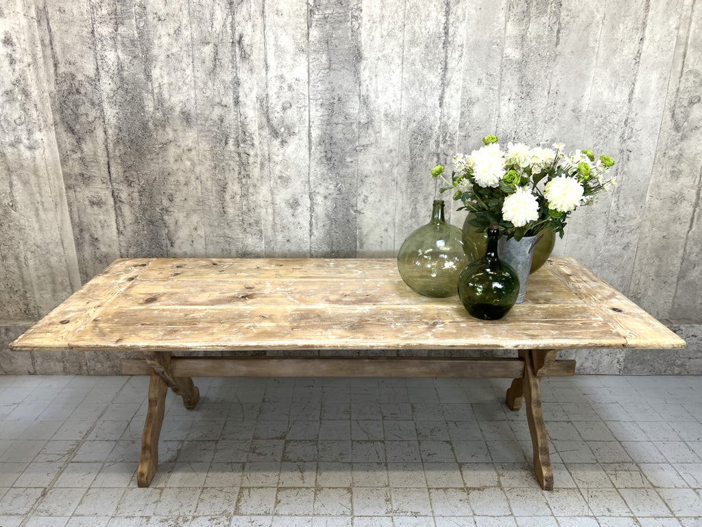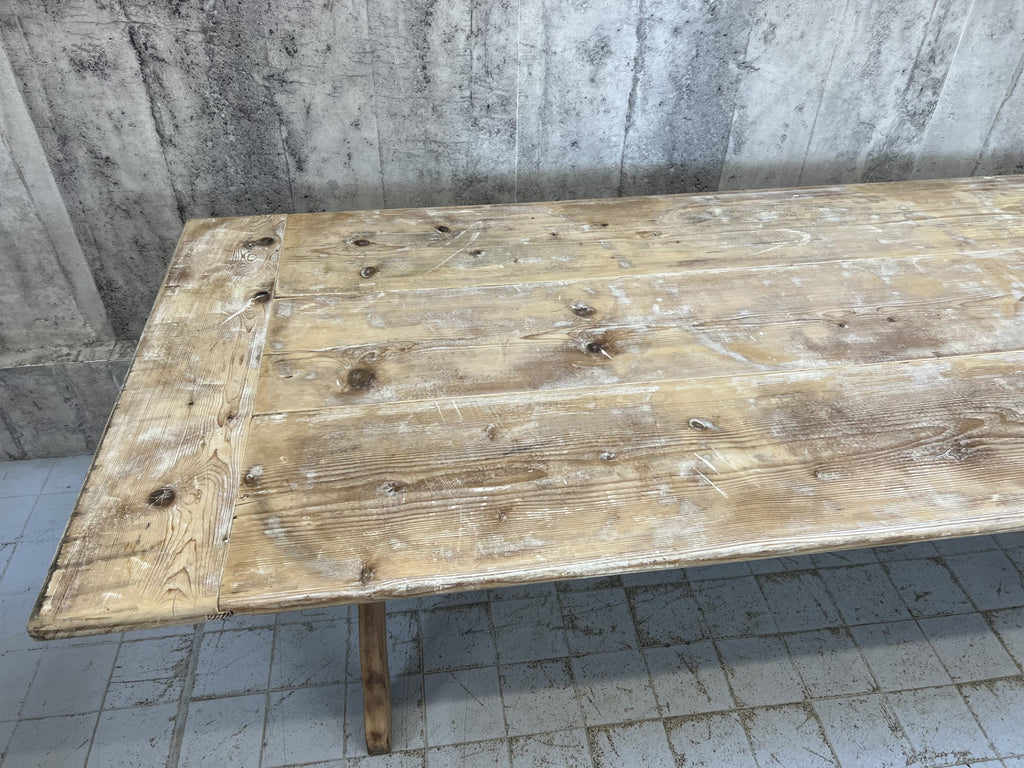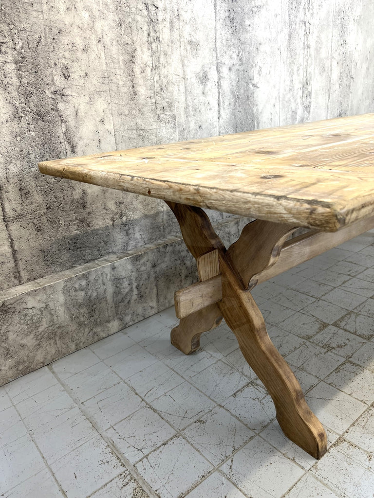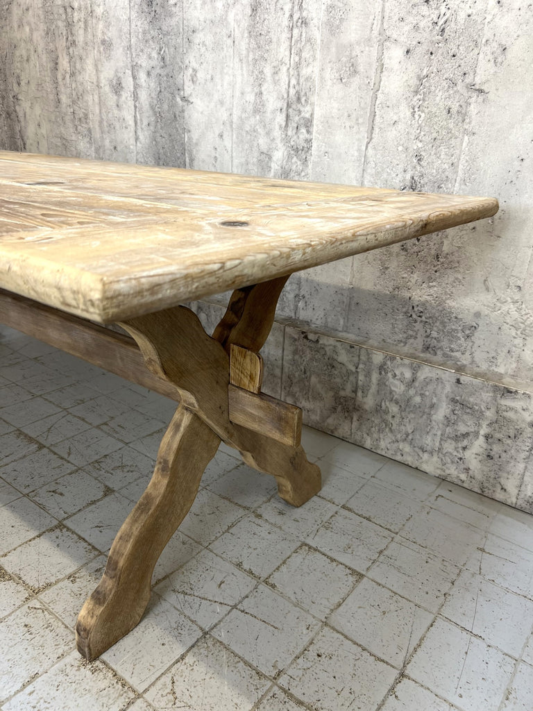 A fabulous dining table with an X frame leg construction with this delightful wavy leg design. The table is in its natural wood finish, a slightly rustic feel to the top and you can see an old white paint finish has been removed some time ago. The table will sit 10 easily, more if you use a bench. A fabulous and unique table.. marry with vintage, modern or coloured chairs. This table unusually can come to pieces so it is an excellent choice for a home with limited access.. it can be installed in situ. The table top screws to the base but there is always a little horizontal movement with this style of table.. nothing extreme.. but to be noted.