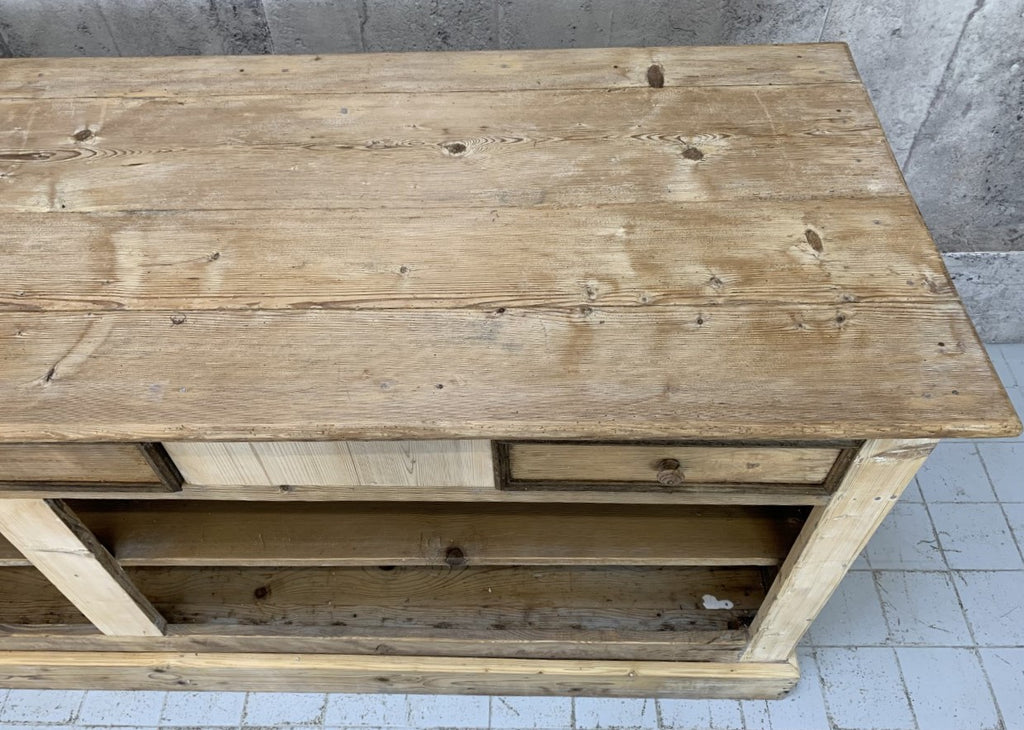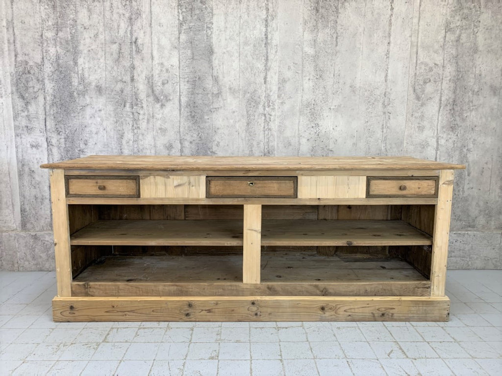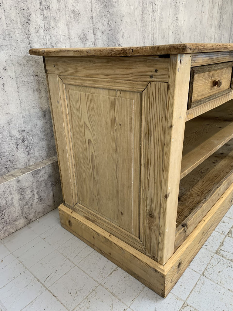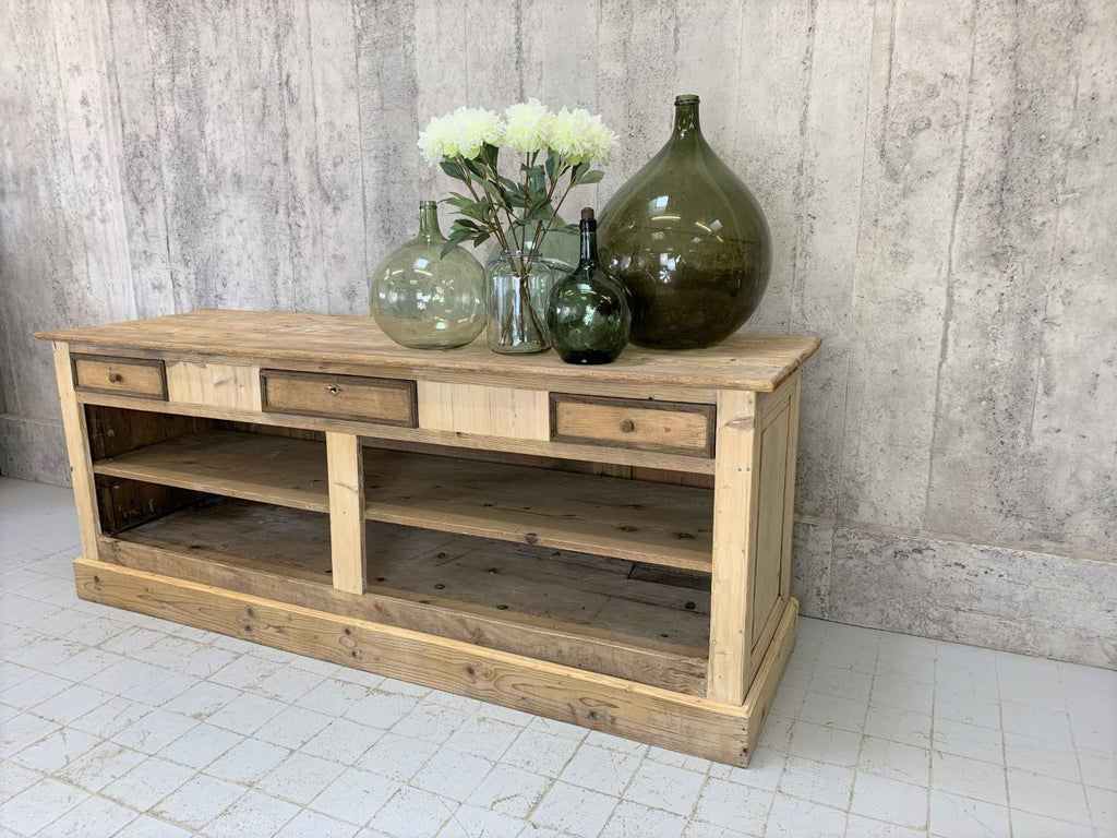 This would be the center piece to your space: dining room, and entrance way, a shop, a restaurant, hotel, bar, even child's bedroom or playroom. Made of solid pine. I would love to see this also in a kitchen as a sink stand or a kitchen island.. the shelf would store lots of pots, crockery etc and the drawers are a handy size. I have a piece just like this in my own office. I use wicker and coloured boiled wool storage baskets to store what is necessary and its lovely to look at the styled open shelves. A simple, versatile piece. The back of this piece is panelled so can be used as a stand alone piece is a shop, bar etc.