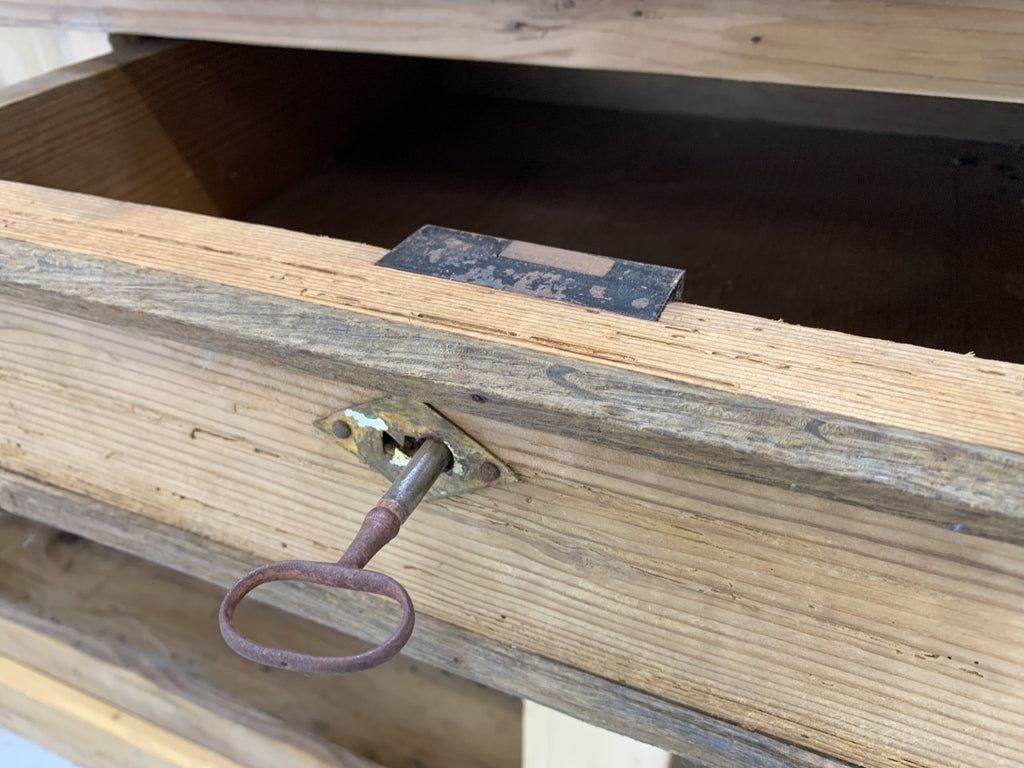 The wood is in great condition, renovated and with the usual bumps and marks that you would expect of a piece of this age and use.